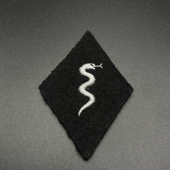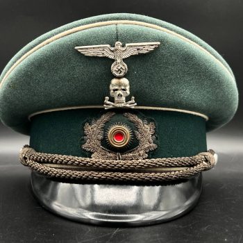 Excellent example of this very desirable visor cap. Made from doeskin wool with very nice white piping and green center band. Has beautiful insignia with cap eagle and skull with cross bones. Interior has a clean tan sweatband and satin lining with a Pekurol marked sweat diamond. The cap shows normal use and wear, but definitely no abuse.