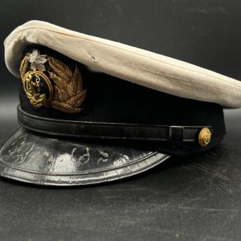 This type of cap was standard issue for officers of the Imperial Japanese Navy during WWII and is today a sought-after collector’s piece, especially when complete with its original insignia and markings.