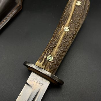 $ 1,600 fee: 22.5%Heer Infantry Dagger, Model 1935, made by SMF Solingen. Amber-colored grip, early aluminum fittings. The crossguard bears a rare engraved personal name “Spehr.” Blade marked with the SMF crowned seagull logo. Comes complete with the original silver portepee.