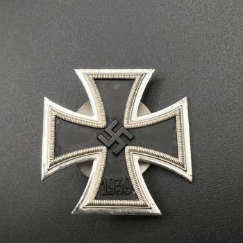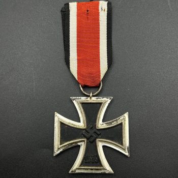 Starting bid: $ 170Original Iron Cross 2nd Class, 1939 issue, instituted on 1 September 1939. Traditional three-piece construction with a magnetic blackened iron core and a silvered frame featuring the characteristic beaded inner edge. The obverse displays the swastika with the date “1939”, while the reverse bears the founding date “1813”. Complete with its original suspension ribbon in the correct black-white-red-white-black colors. Good collectible condition, showing honest age and wear consistent with period use.
