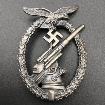 Starting bid: $ 2,900Original Kriegsmarine Torpedo Boat Crew Badge (Schnellboot-Kriegsabzeichen), instituted in 1941. Awarded to officers and enlisted crew members of fast torpedo boats for operational service and combat missions. The badge features an oval laurel wreath topped by the national eagle with swastika and a fast attack craft cutting through waves at the center. Manufactured in tombak with traces of original gilding. The reverse shows a pinback configuration and a clearly struck maker mark “SCHWERIN / BERLIN 68”. Good collectible condition with honest wear and age.