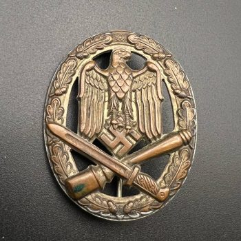 Starting bid: $ 380Original General Assault Badge (Allgemeines Sturmabzeichen) of the Third Reich, silver grade. Early-style example with sharply defined details: high-relief national eagle, swastika, oak-leaf wreath, and crossed bayonet and stick grenade at the center.