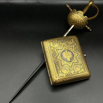 Spanish Toledo damascene set, comprising a decorative dagger letter opener and matching cigarette case. Richly decorated in traditional gold inlay (damascene) technique with intricate floral and geometric motifs.