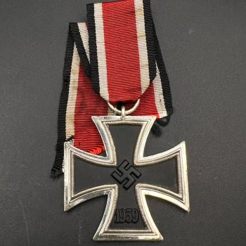 Starting bid: $ 1,475Original embroidered (cloth) version of the German Cross for the Kriegsmarine, intended for wear on field and service uniforms. Produced as an eight-pointed star with silver-embroidered rays on a black backing. The center shows a cloth swastika on a light field, surrounded by a wreath with red piping. The reverse is cloth-backed and displays typical period wear and stitch traces. An authentic wartime insignia with honest service wear and natural patina, unrestored.