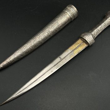 Starting bid: $ 295Officer’s dirk of the USSR Navy, Model 1955. Polished blade with factory etching and maker’s mark ZiK (Zlatoust Tool Plant), dated 1977. Light-colored grip with brass fittings, pommel decorated with the Soviet state emblem. Classic brass crossguard. Black scabbard with brass mounts and suspension rings. An original complete example, showing honest age wear and natural patina, with no restoration.