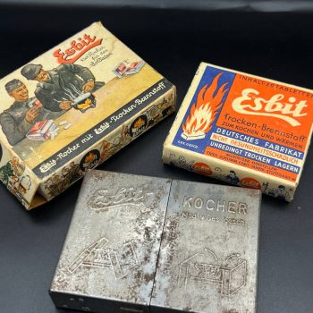Starting bid: $ 245German Esbit folding field stove (Kocher Mod. 9) by Erich Schumm, Stuttgart, WWII period. The set comprises the metal stove in its original illustrated box depicting soldiers in the field, together with a separate original box of fuel tablets (20 tablets). A rare example of a complete, unissued set retaining all original packaging.