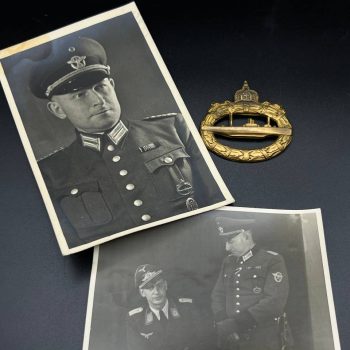 Starting bid: $ 750hollow embossed and gold-plated, thin horizontal pin on reverse, privately purchased piece from the 1920s. Accompanied by 2 photographs of a police officer in the rank of Major. Notation on reverse: “Flensburg 16.10.38 zur lieben Erinnerung, Adolf”