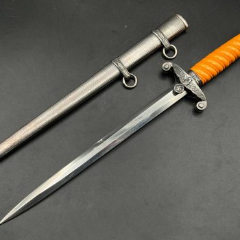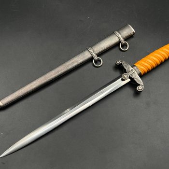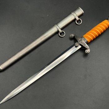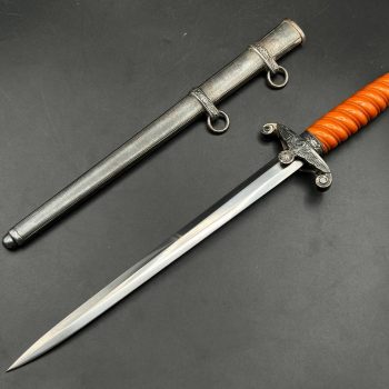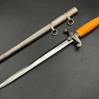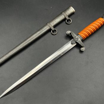 Auction EndedA classic German Army officer’s dagger, Model 1935, by the famous Solingen maker Carl Eickhorn. It features the typical orange-toned grip with spiral grooves, a finely detailed eagle crossguard, and an oak leaf pommel. The pebbled steel scabbard is fitted with oak leaf bands and suspension rings. The blade bears the well-known Eickhorn squirrel trademark, a mark highly regarded by collectors.