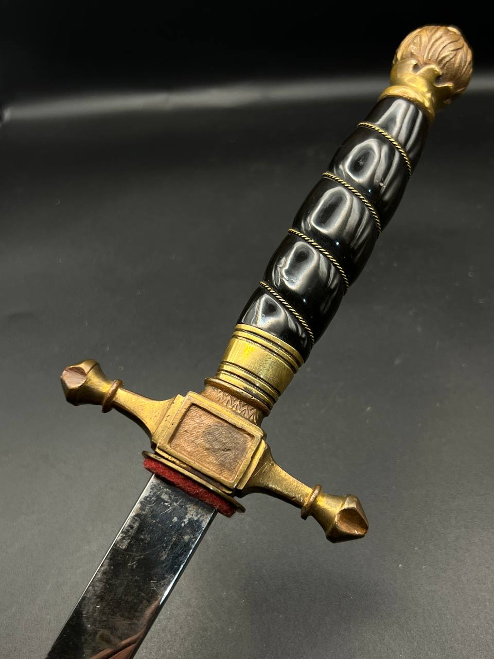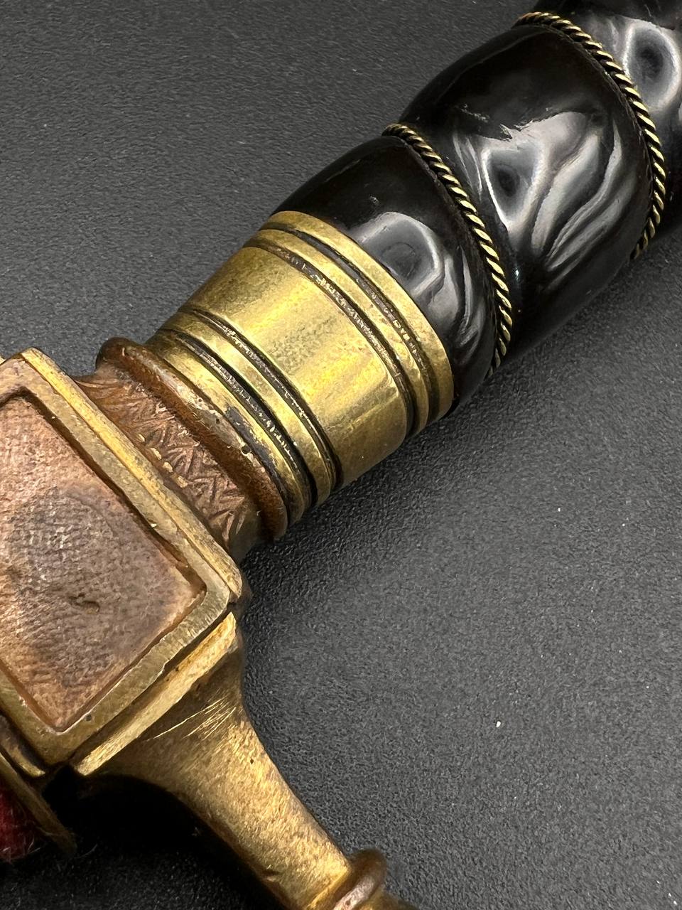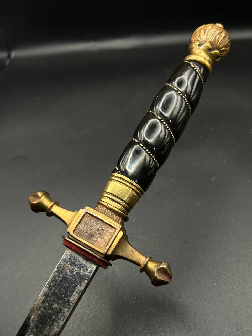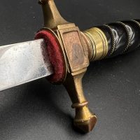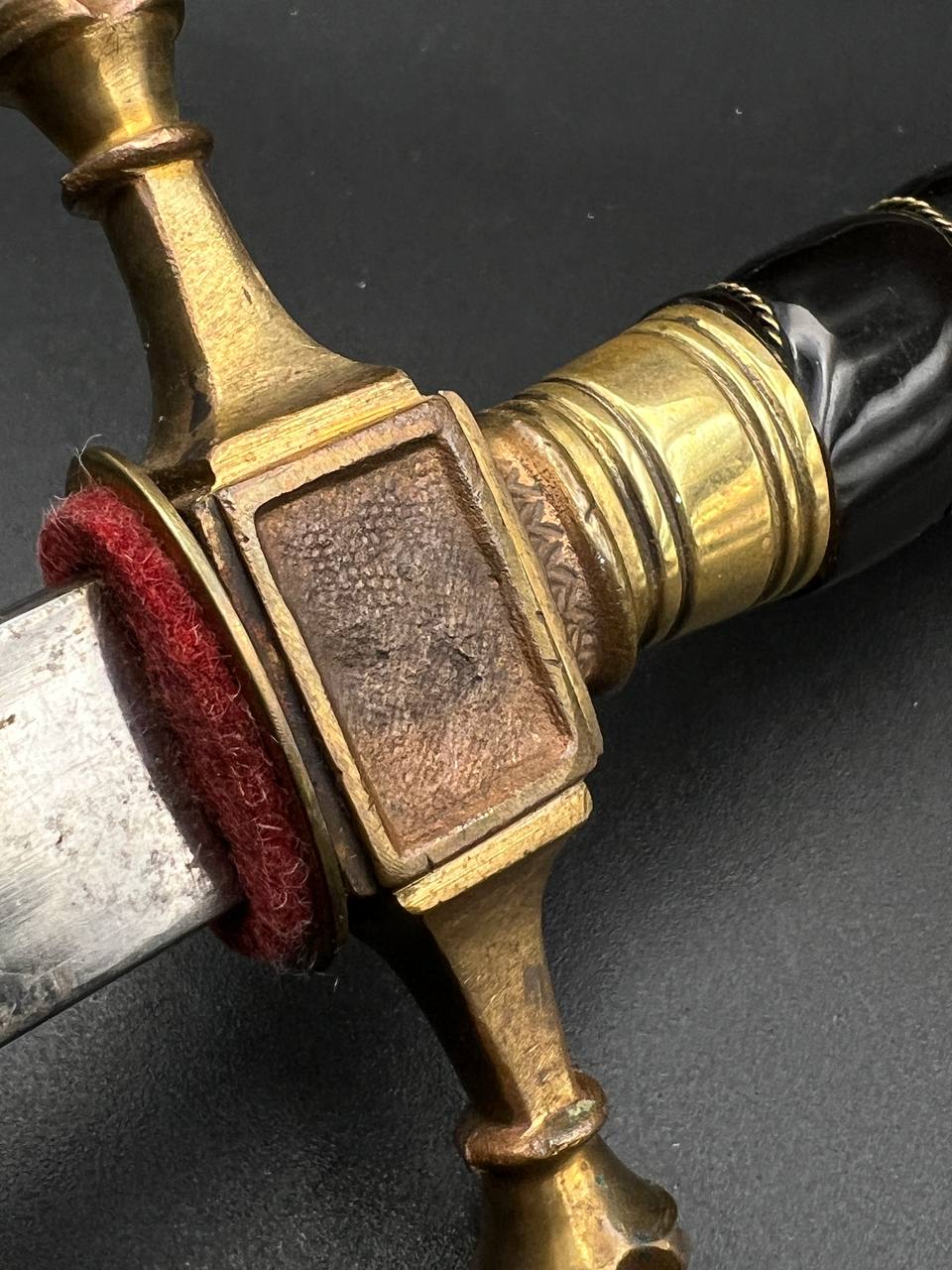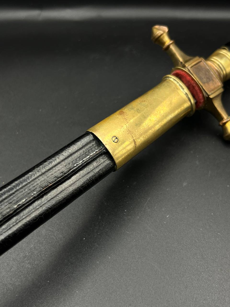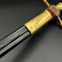 A typical German Fire Brigade dirk from the late Weimar era to early Third Reich period. The blade is straight, single-edged polished steel with a narrow fuller. The brass crossguard features four faceted terminals resembling the characteristic “fire service” spike design. The grip is black with spiral grooves and brass spacers, topped with a large bulb-shaped brass pommel typical for early fire brigade patterns.