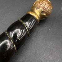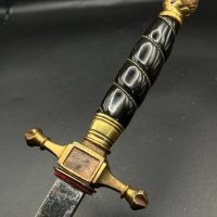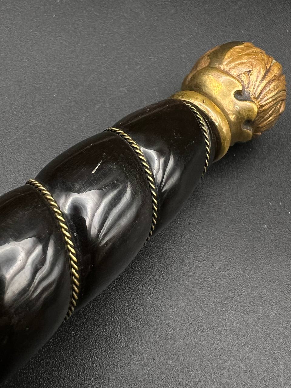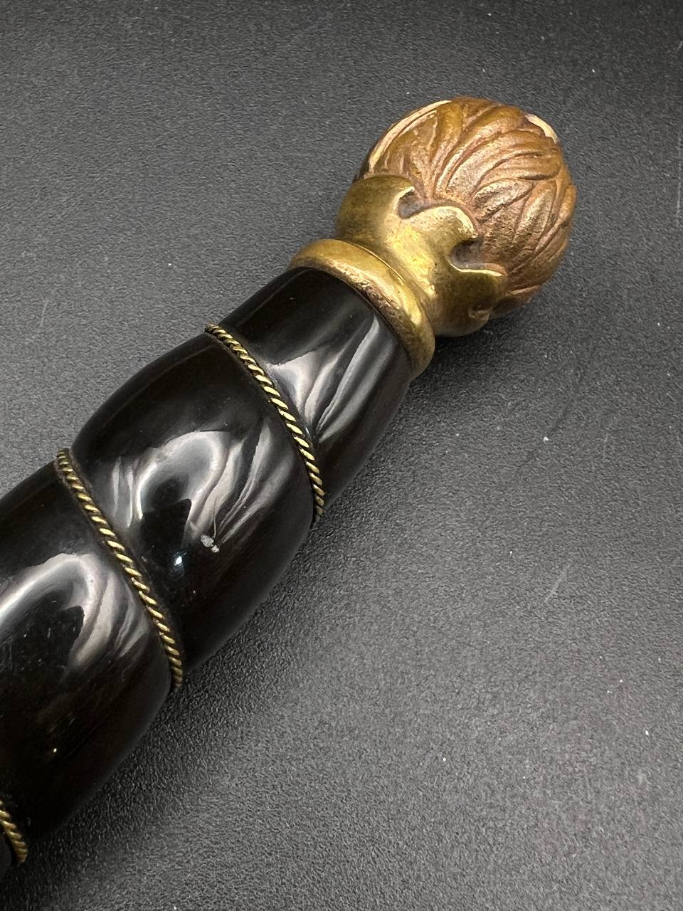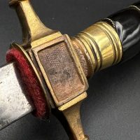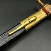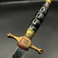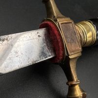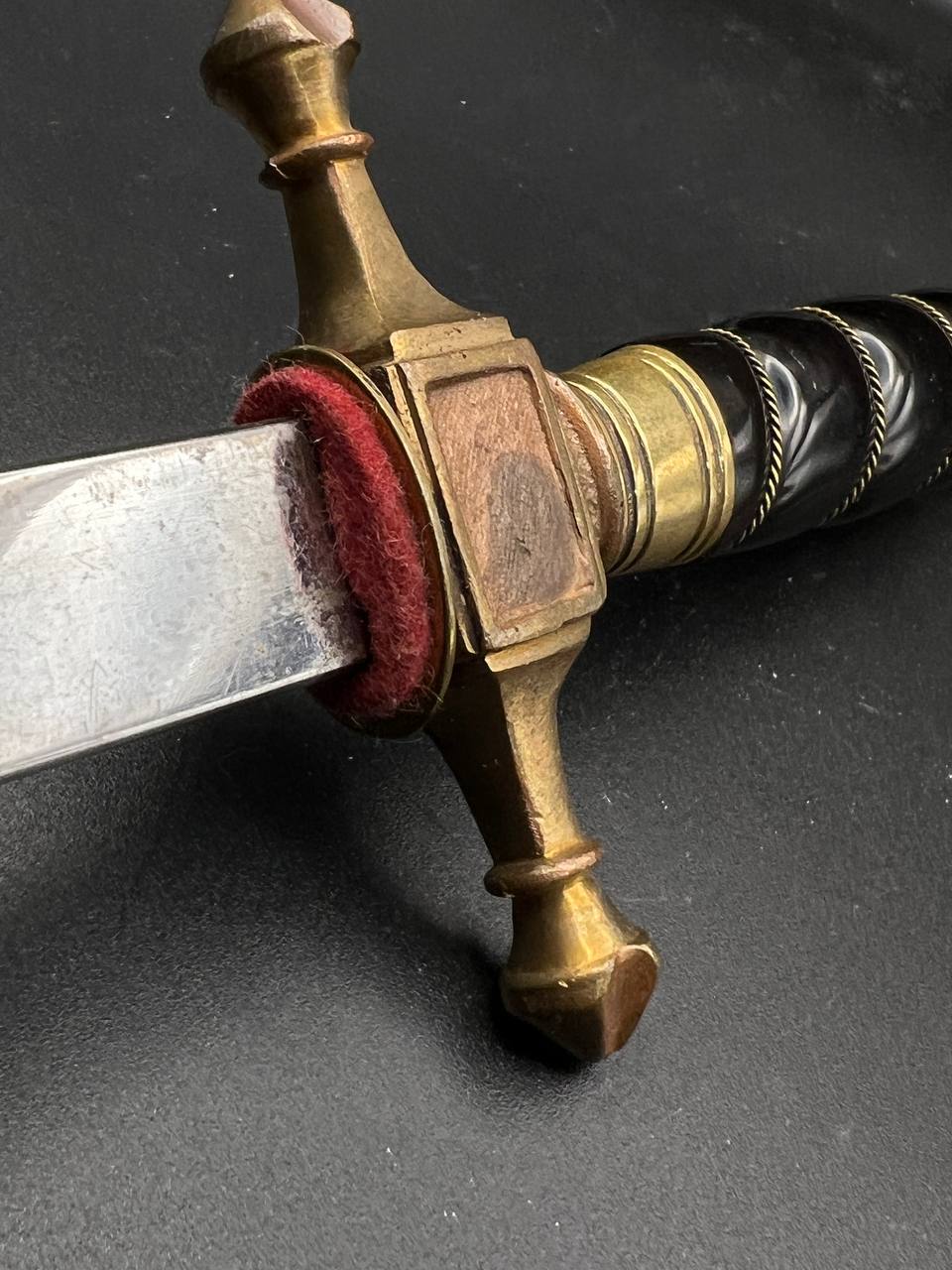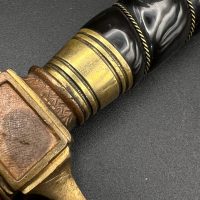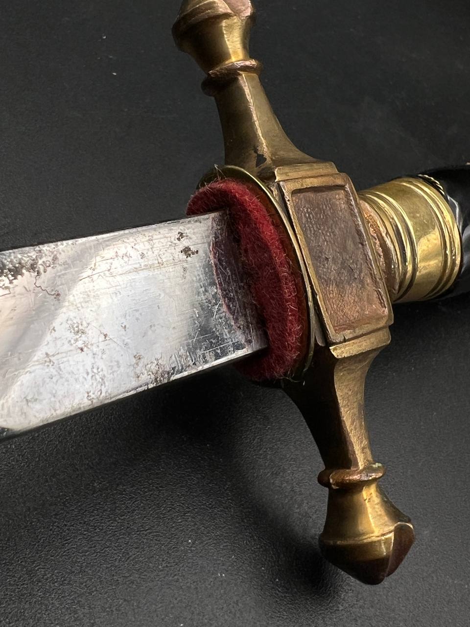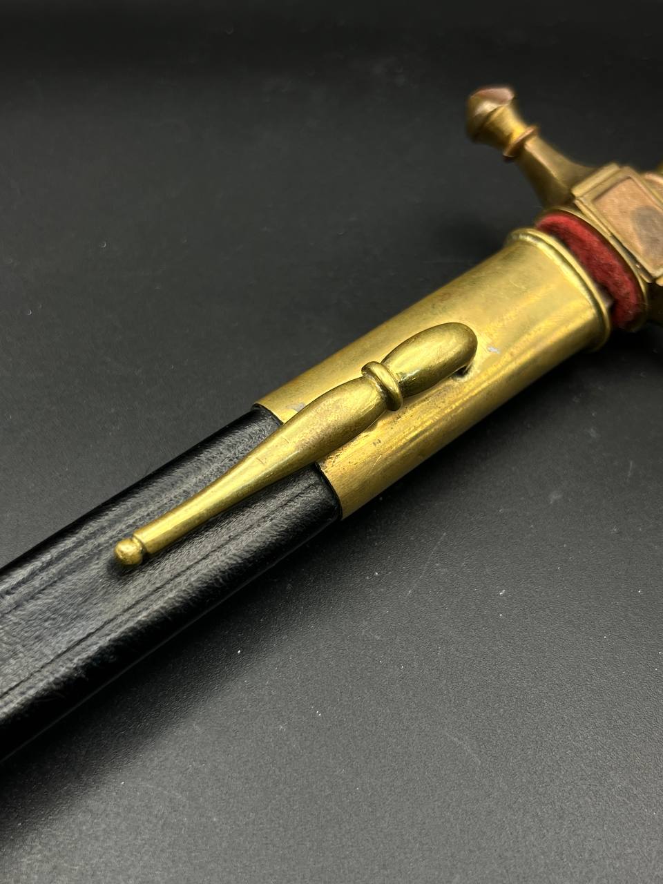 A typical German Fire Brigade dirk from the late Weimar era to early Third Reich period. The blade is straight, single-edged polished steel with a narrow fuller. The brass crossguard features four faceted terminals resembling the characteristic “fire service” spike design. The grip is black with spiral grooves and brass spacers, topped with a large bulb-shaped brass pommel typical for early fire brigade patterns.