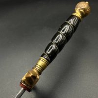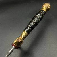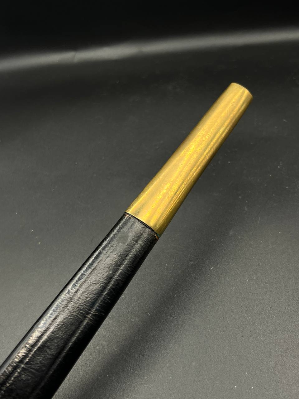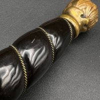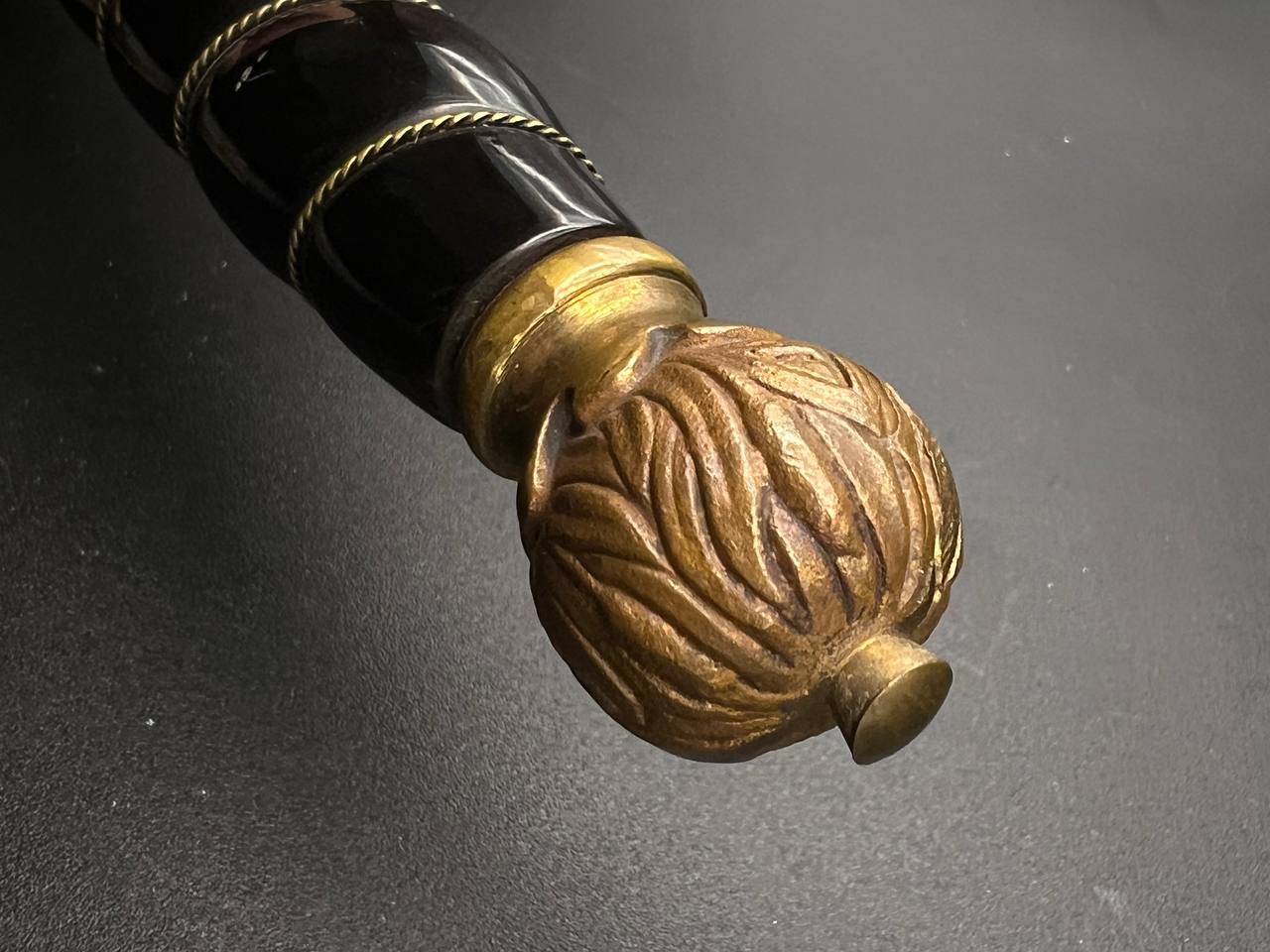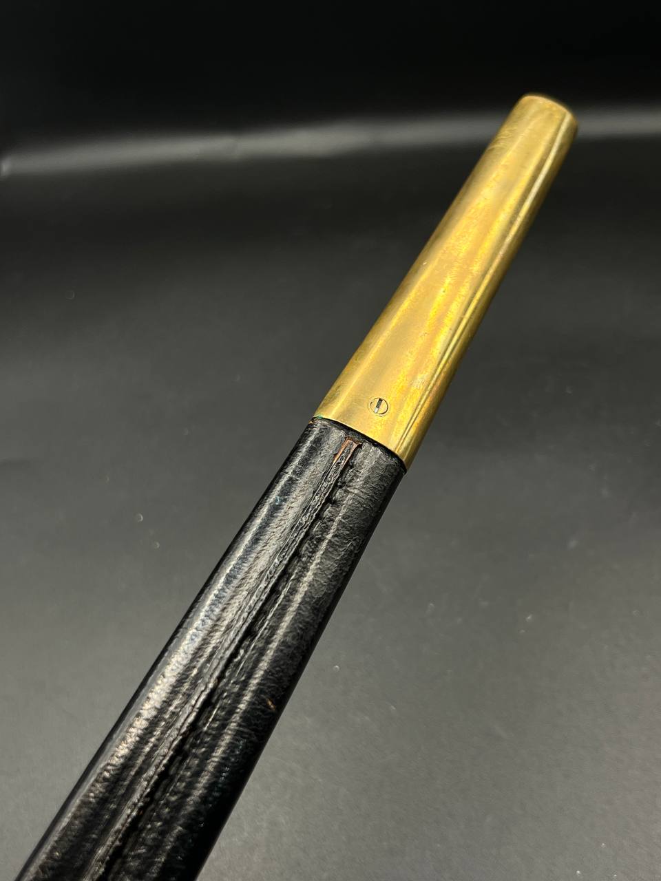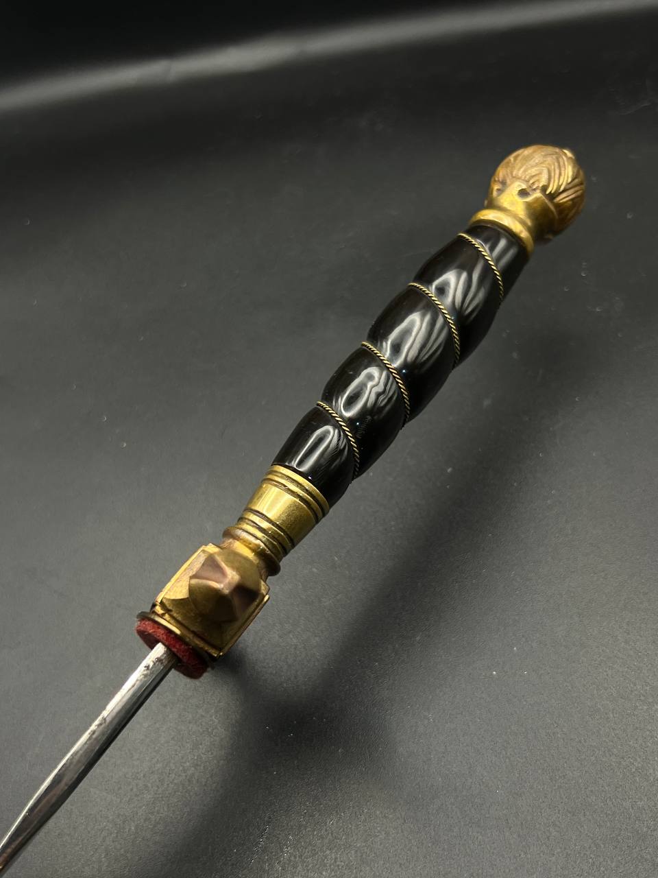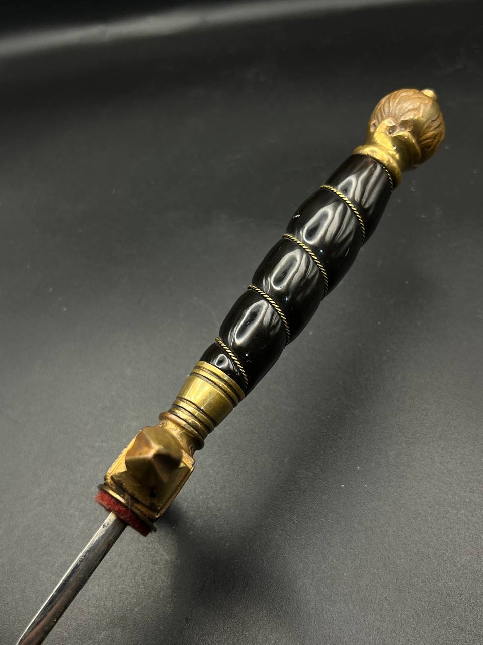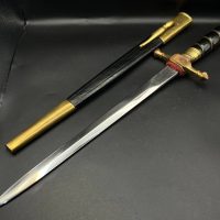 A typical German Fire Brigade dirk from the late Weimar era to early Third Reich period. The blade is straight, single-edged polished steel with a narrow fuller. The brass crossguard features four faceted terminals resembling the characteristic “fire service” spike design. The grip is black with spiral grooves and brass spacers, topped with a large bulb-shaped brass pommel typical for early fire brigade patterns.