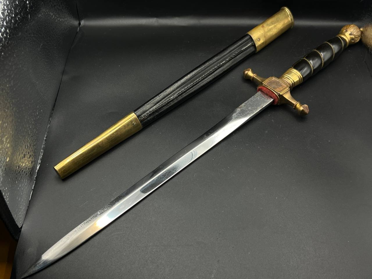 The scabbard is leather-covered with brass throat and tip, matching the pre-war period construction. Overall condition is good: clean blade, evenly patinated brass, and well-preserved leather.