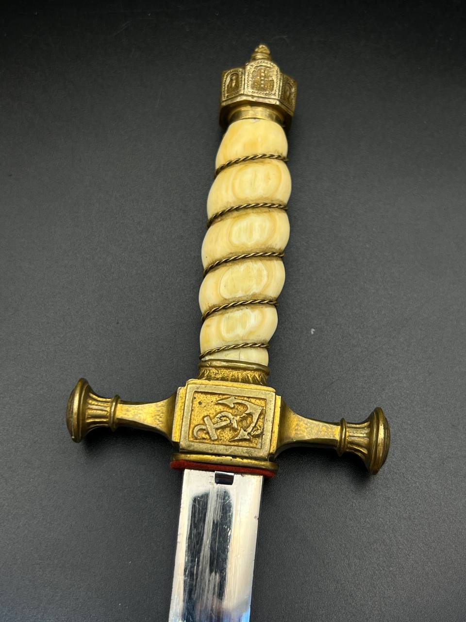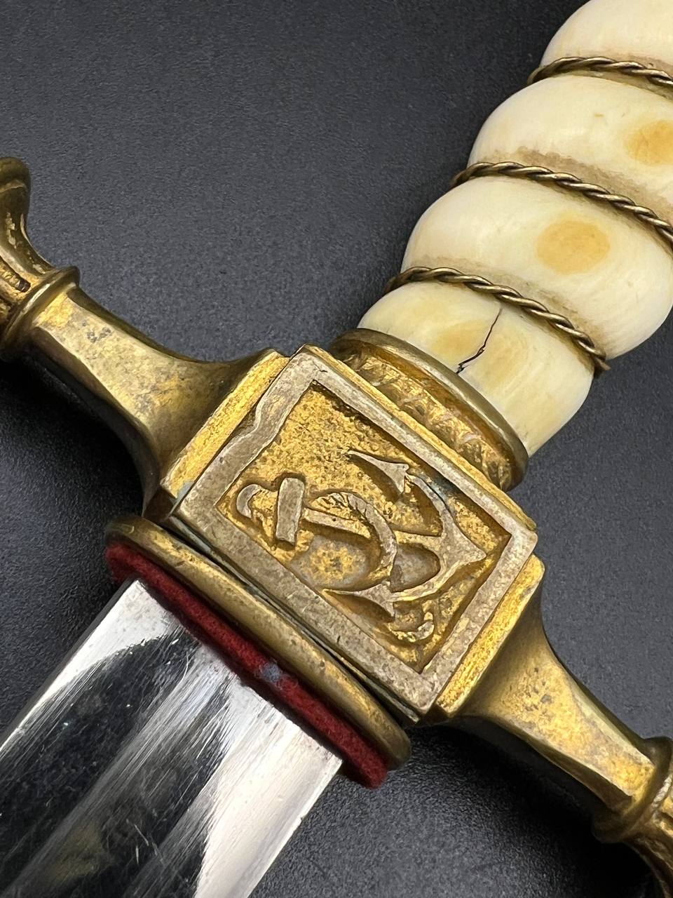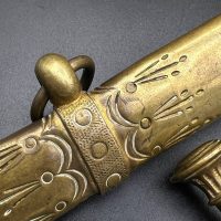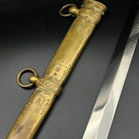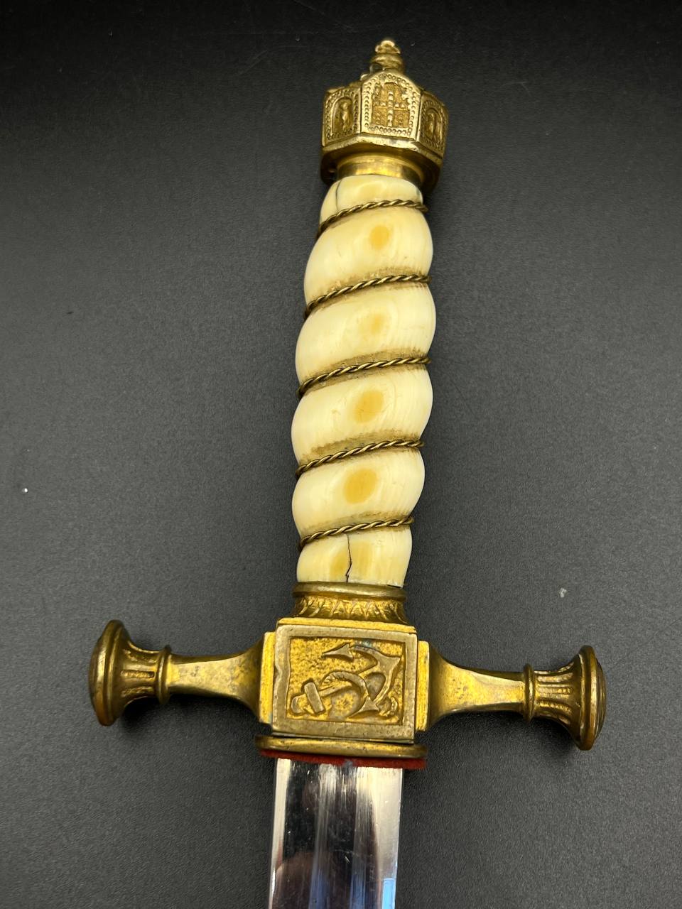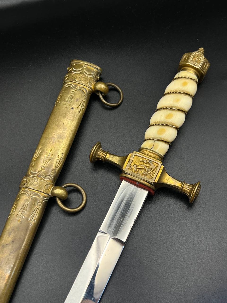 Officer’s dirk of the Kaiserliche Marine, late 19th – early 20th century. Bone grip with twisted brass wire wrap, Imperial crown pommel with fine relief detailing, anchor motif on the crossguard. Engraved brass scabbard with two suspension rings. Blade in good condition, complete set.