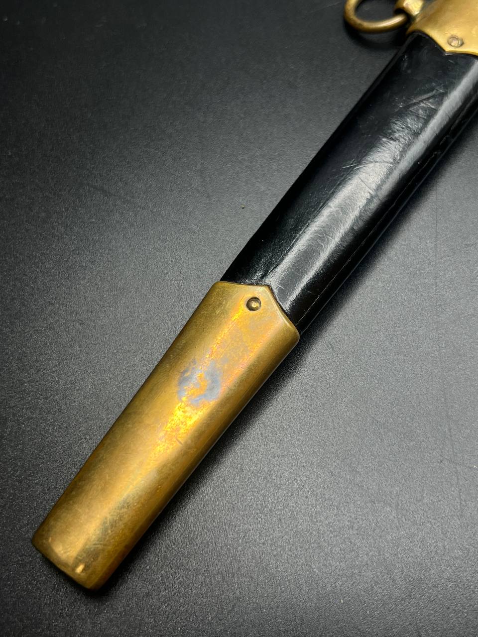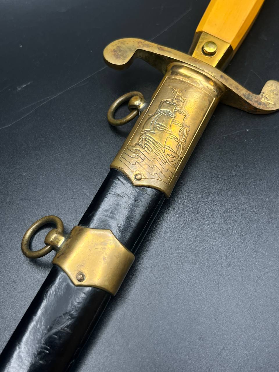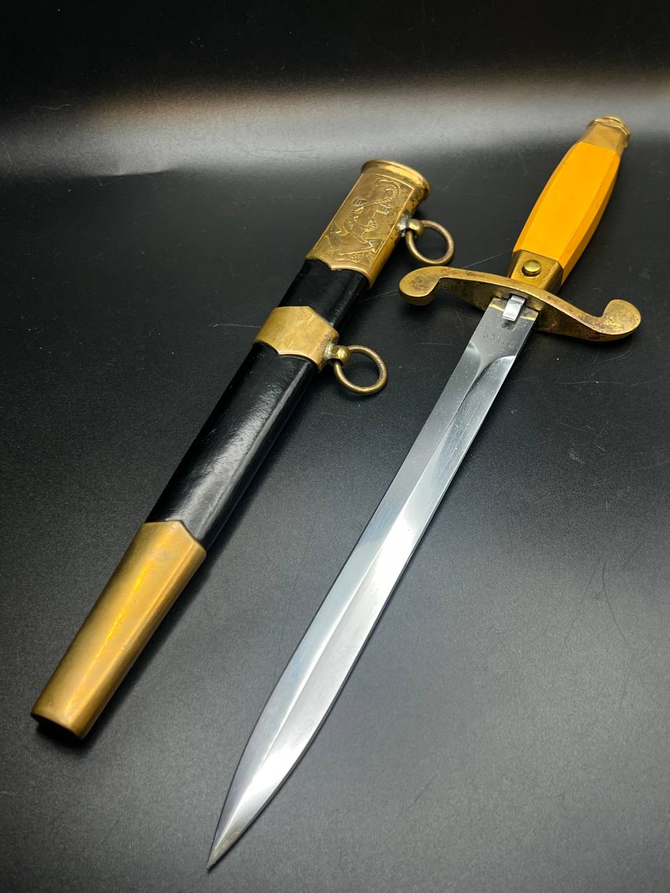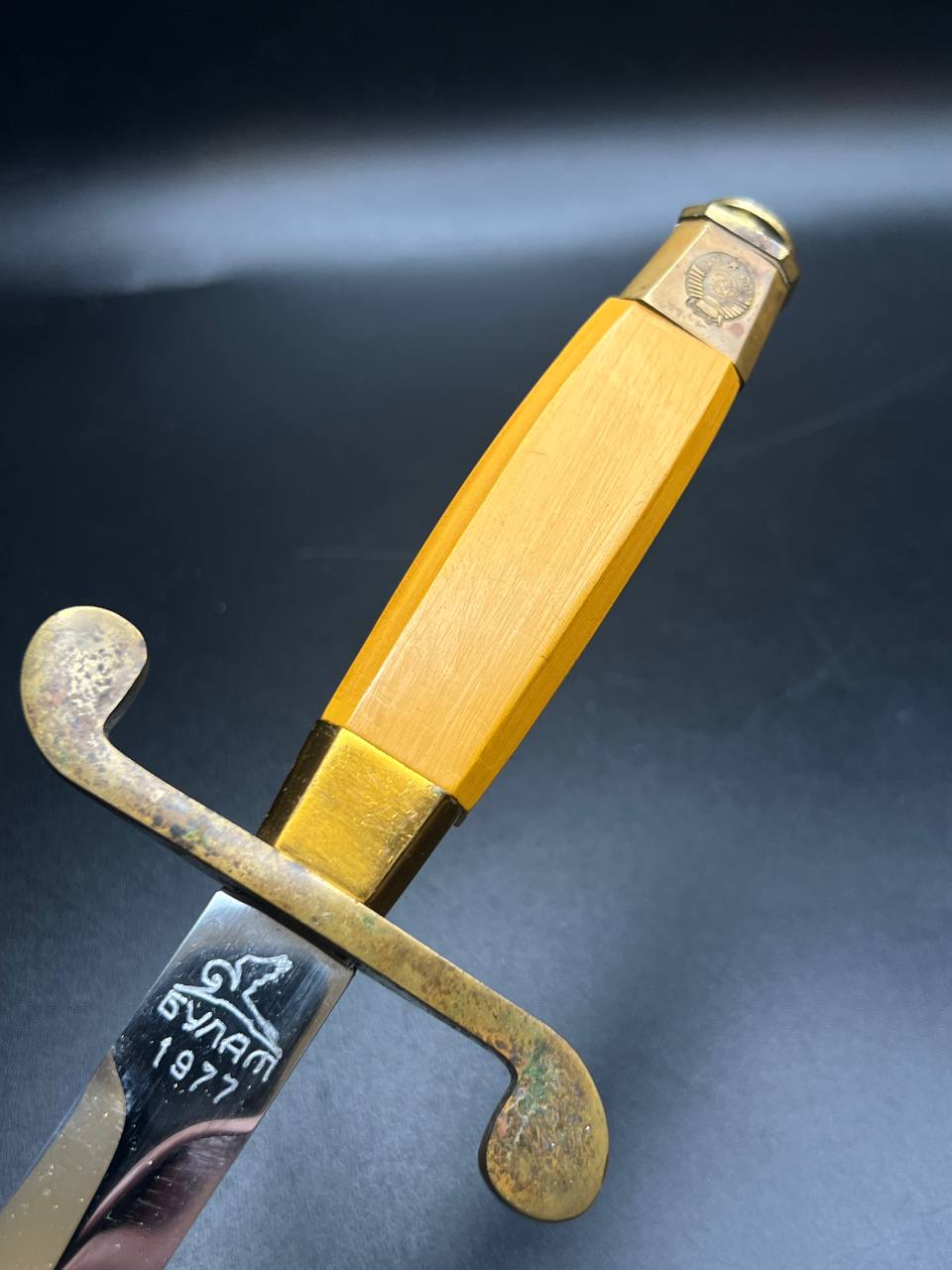 Officer’s dirk of the USSR Navy, Model 1955. Polished blade with factory etching and maker’s mark ZiK (Zlatoust Tool Plant), dated 1977. Light-colored grip with brass fittings, pommel decorated with the Soviet state emblem. Classic brass crossguard. Black scabbard with brass mounts and suspension rings. An original complete example, showing honest age wear and natural patina, with no restoration.