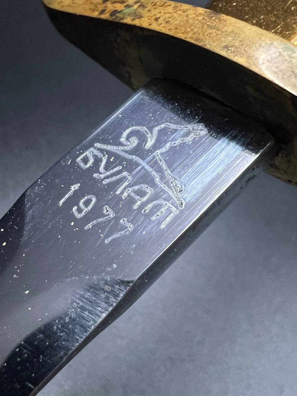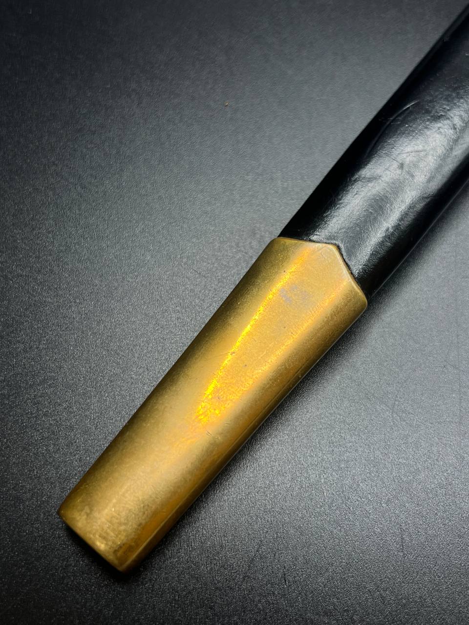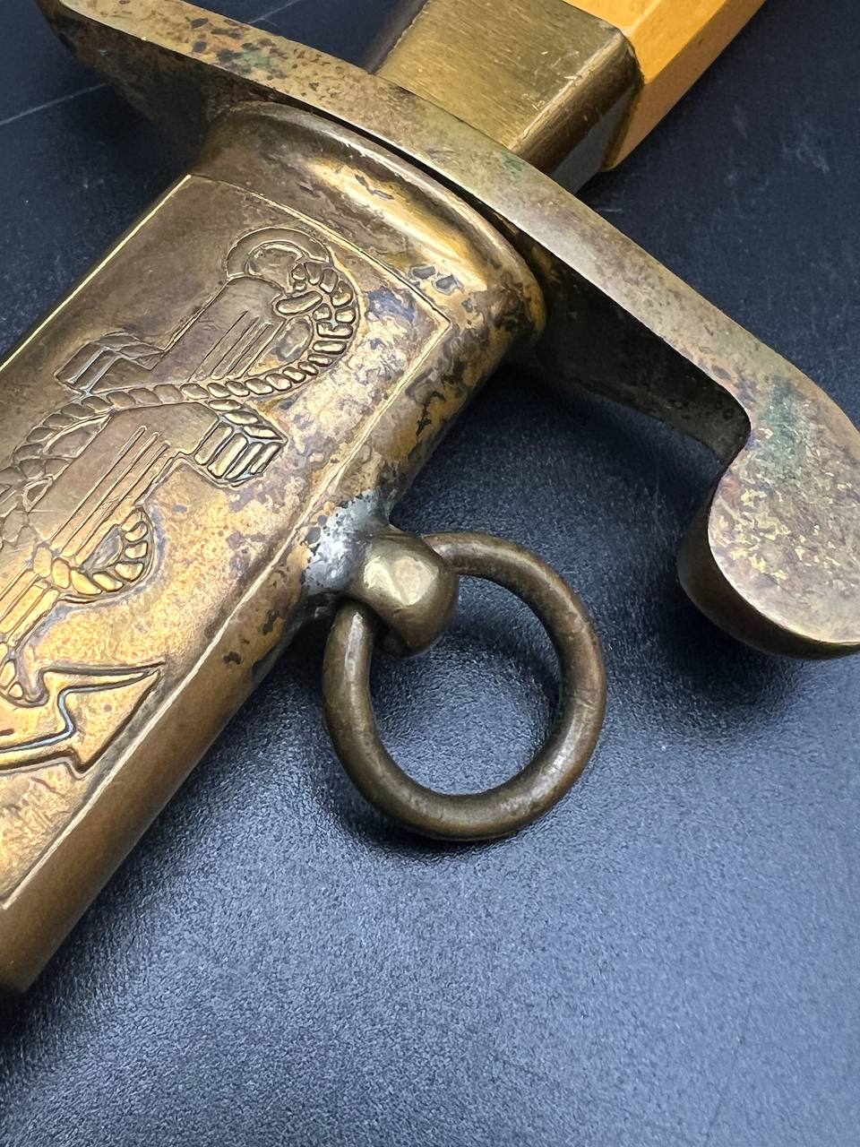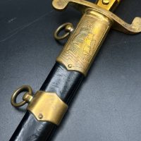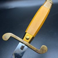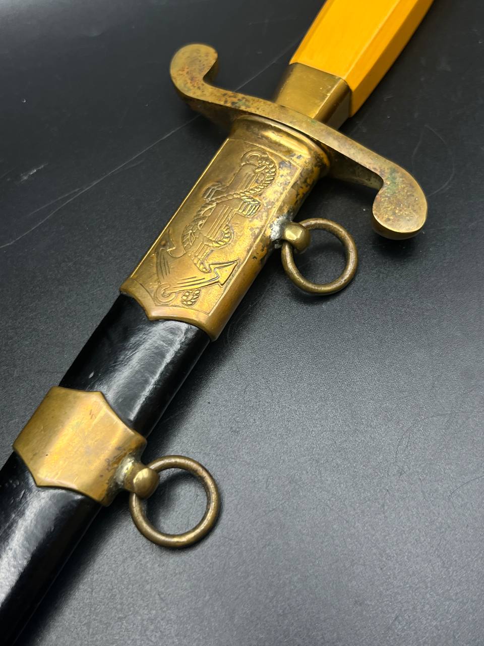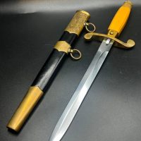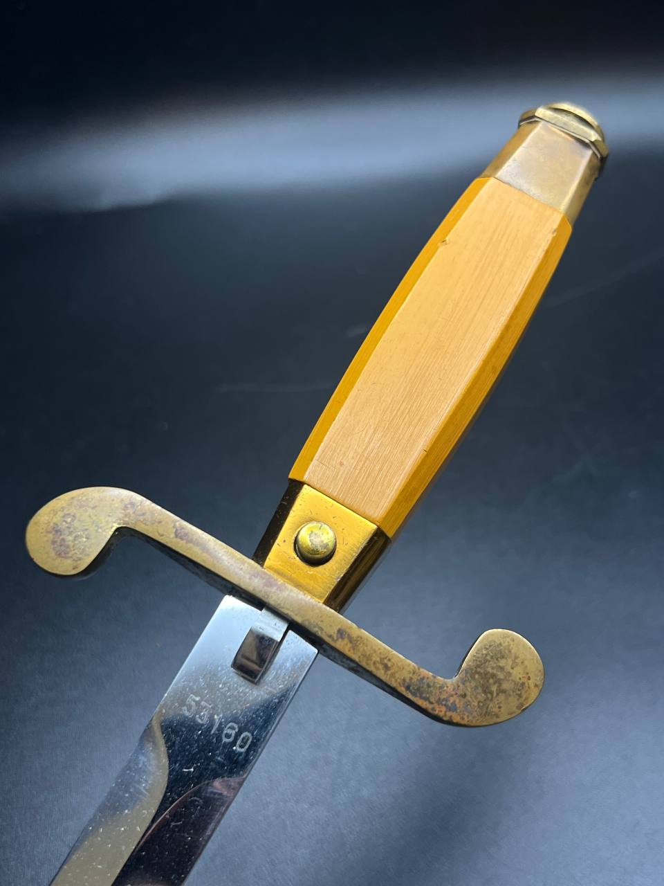 Officer’s dirk of the USSR Navy, Model 1955. Polished blade with factory etching and maker’s mark ZiK (Zlatoust Tool Plant), dated 1977. Light-colored grip with brass fittings, pommel decorated with the Soviet state emblem. Classic brass crossguard. Black scabbard with brass mounts and suspension rings. An original complete example, showing honest age wear and natural patina, with no restoration.