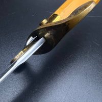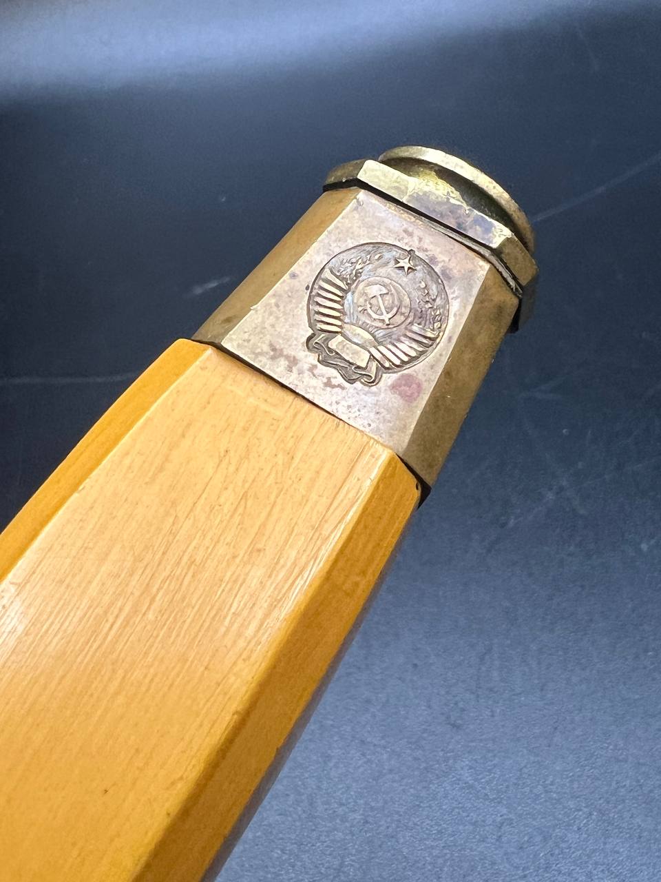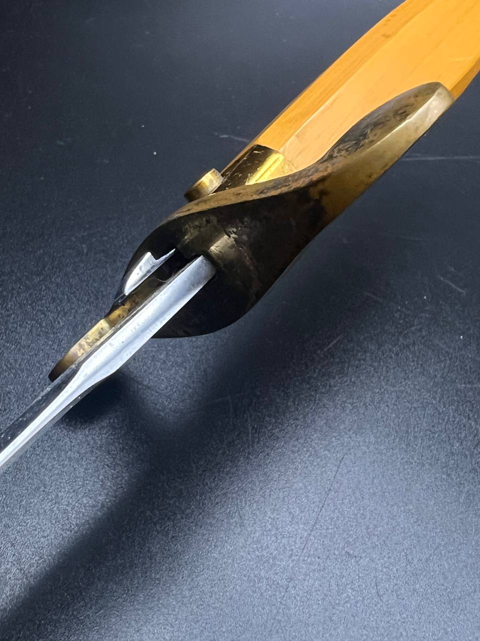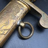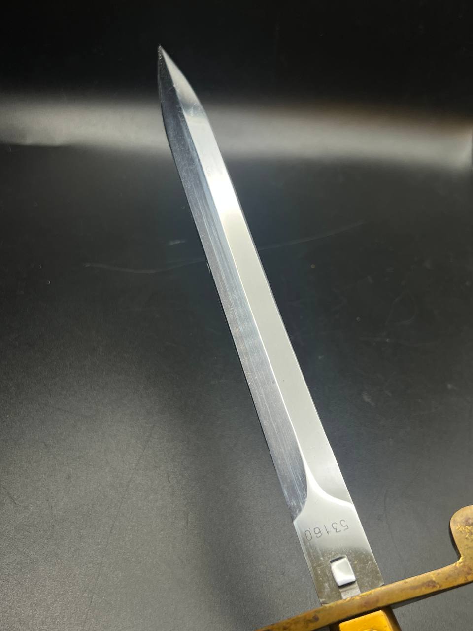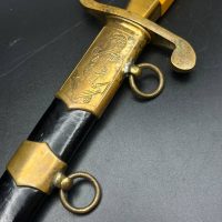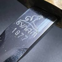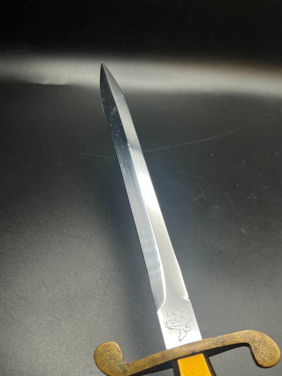 Officer’s dirk of the USSR Navy, Model 1955. Polished blade with factory etching and maker’s mark ZiK (Zlatoust Tool Plant), dated 1977. Light-colored grip with brass fittings, pommel decorated with the Soviet state emblem. Classic brass crossguard. Black scabbard with brass mounts and suspension rings. An original complete example, showing honest age wear and natural patina, with no restoration.