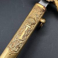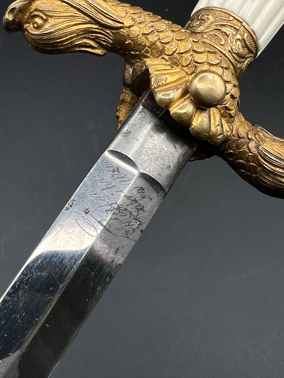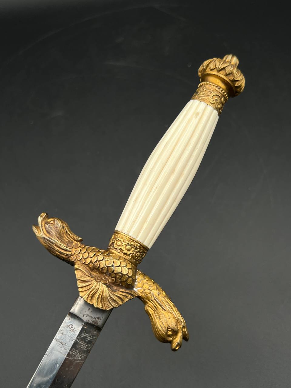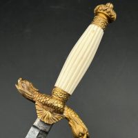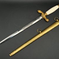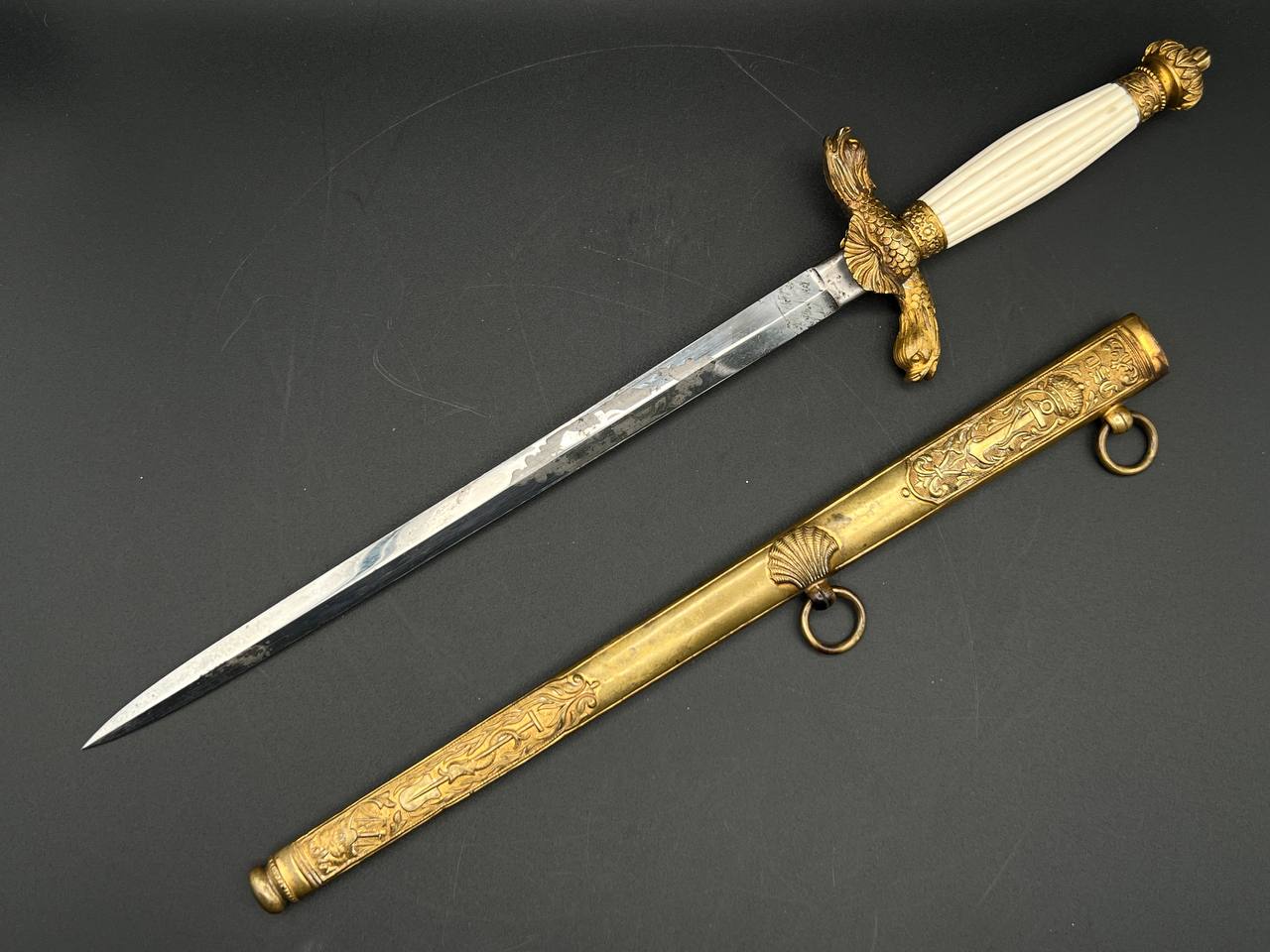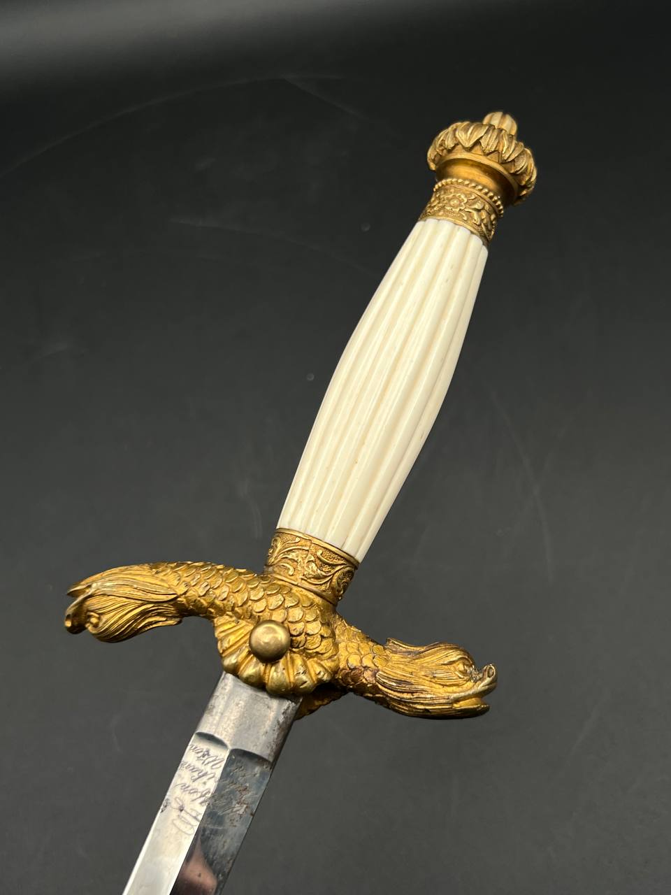 Austro-Hungarian Danube River Fleet Officer’s Dagger, a rare ceremonial piece from the late 19th to early 20th century, exhibiting remarkable craftsmanship throughout. The straight, double-edged blade of diamond cross-section features fine etched and engraved decoration, still clearly visible along its surface. The gilt-bronze hilt displays the iconic dolphin-shaped crossguard symbolizing naval and river service, while the fluted ivory (or imitation) grip ends with a richly ornamented ferrule and crown-shaped pommel. The gilded brass scabbard is adorned with high-relief decoration including an anchor beneath a royal crown and the D.S.F. monogram — Donaudampfschiffahrtsgesellschaft, the Danube Steamship Company later associated with the imperial river fleet. The surface is richly ornamented with scrolling motifs and shell-shaped suspension fittings. Overall condition is very good for its age, with noble patina and fine presentation. A scarce and elegant dagger, considerably rarer than the standard Austro-Hungarian naval patterns.