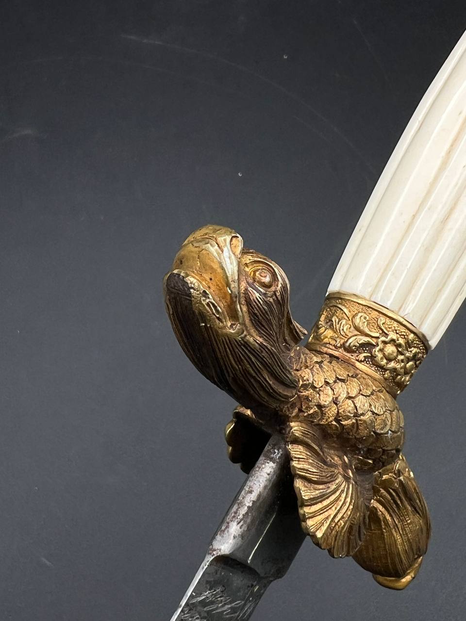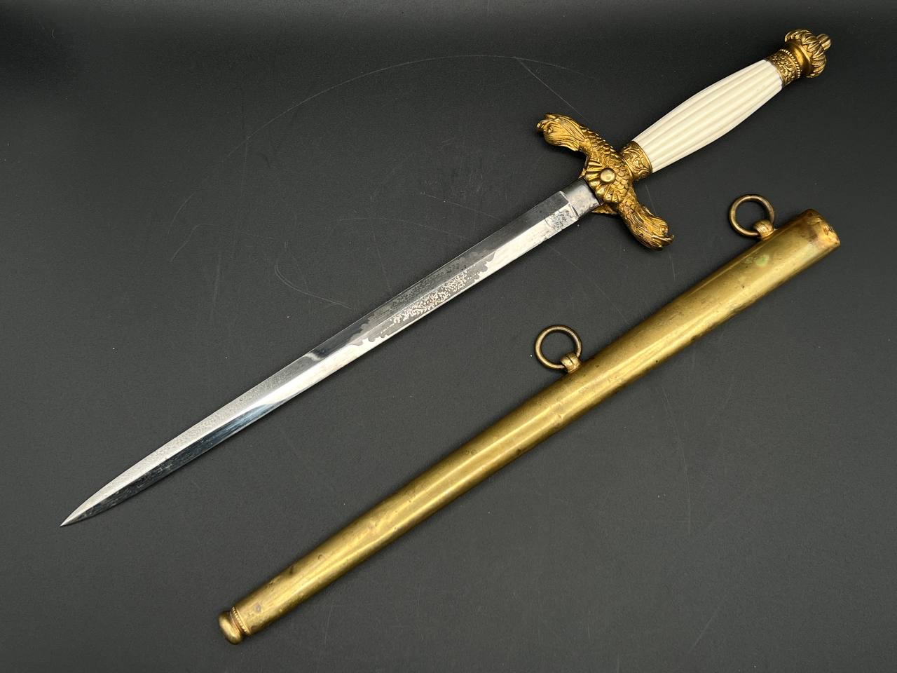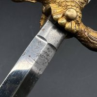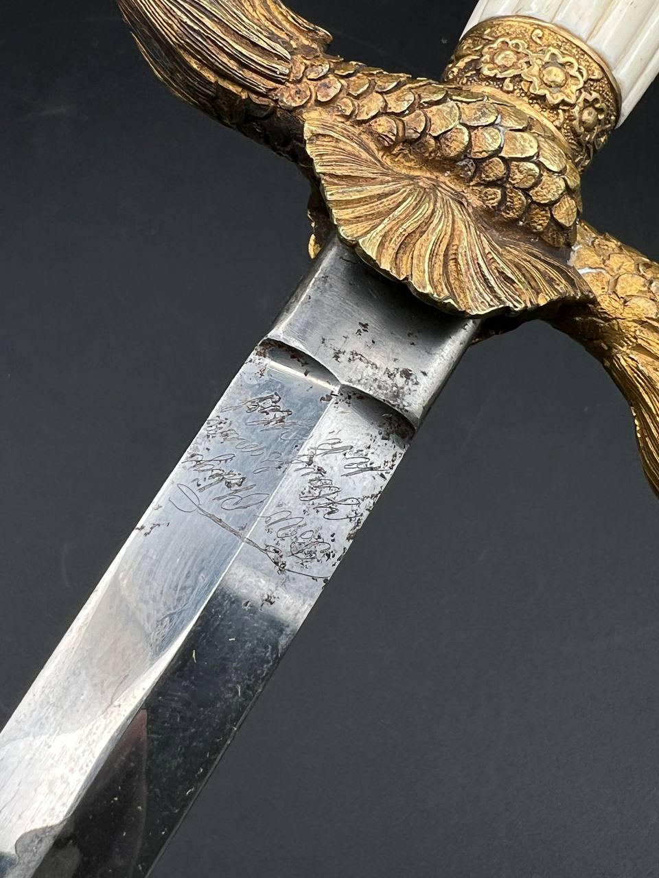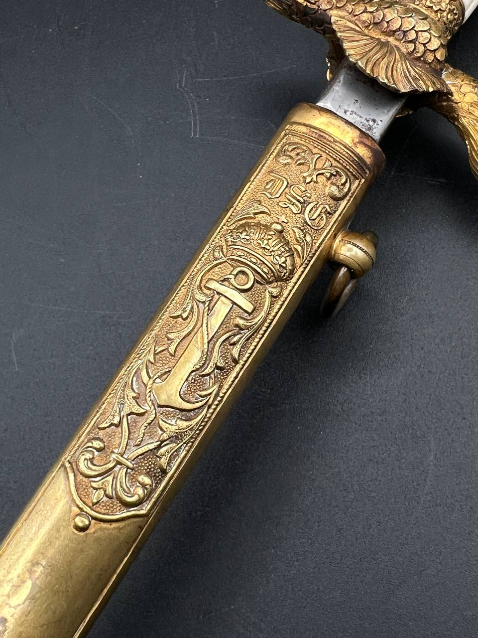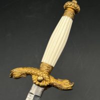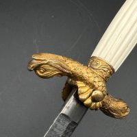 Austro-Hungarian Danube River Fleet Officer’s Dagger, a rare ceremonial piece from the late 19th to early 20th century, exhibiting remarkable craftsmanship throughout. The straight, double-edged blade of diamond cross-section features fine etched and engraved decoration, still clearly visible along its surface. The gilt-bronze hilt displays the iconic dolphin-shaped crossguard symbolizing naval and river service, while the fluted ivory (or imitation) grip ends with a richly ornamented ferrule and crown-shaped pommel. The gilded brass scabbard is adorned with high-relief decoration including an anchor beneath a royal crown and the D.S.F. monogram — Donaudampfschiffahrtsgesellschaft, the Danube Steamship Company later associated with the imperial river fleet. The surface is richly ornamented with scrolling motifs and shell-shaped suspension fittings. Overall condition is very good for its age, with noble patina and fine presentation. A scarce and elegant dagger, considerably rarer than the standard Austro-Hungarian naval patterns.