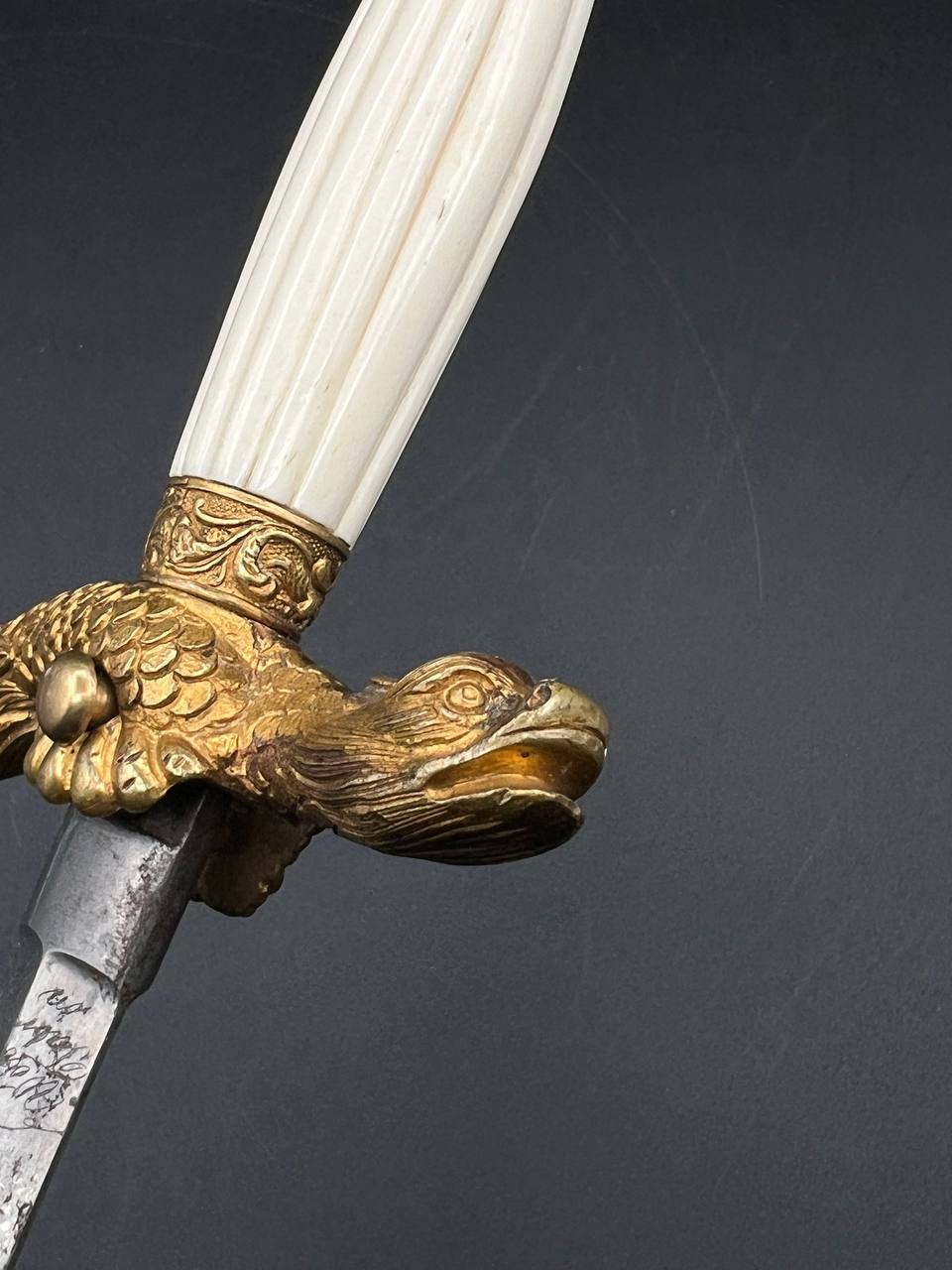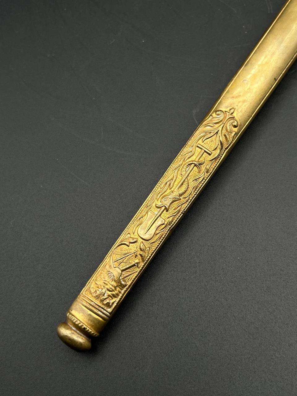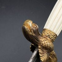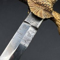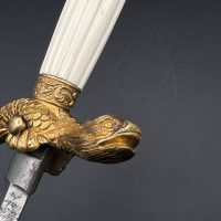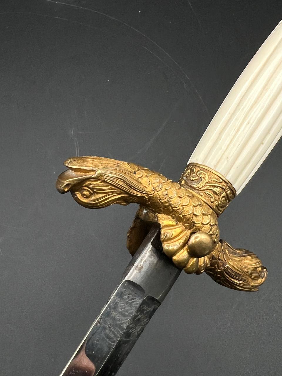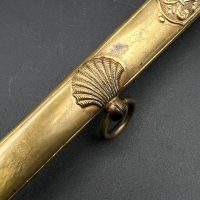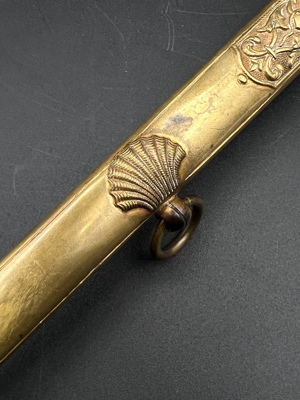 Austro-Hungarian Danube River Fleet Officer’s Dagger, a rare ceremonial piece from the late 19th to early 20th century, exhibiting remarkable craftsmanship throughout. The straight, double-edged blade of diamond cross-section features fine etched and engraved decoration, still clearly visible along its surface. The gilt-bronze hilt displays the iconic dolphin-shaped crossguard symbolizing naval and river service, while the fluted ivory (or imitation) grip ends with a richly ornamented ferrule and crown-shaped pommel. The gilded brass scabbard is adorned with high-relief decoration including an anchor beneath a royal crown and the D.S.F. monogram — Donaudampfschiffahrtsgesellschaft, the Danube Steamship Company later associated with the imperial river fleet. The surface is richly ornamented with scrolling motifs and shell-shaped suspension fittings. Overall condition is very good for its age, with noble patina and fine presentation. A scarce and elegant dagger, considerably rarer than the standard Austro-Hungarian naval patterns.