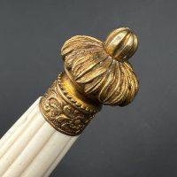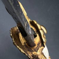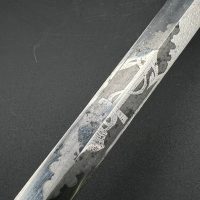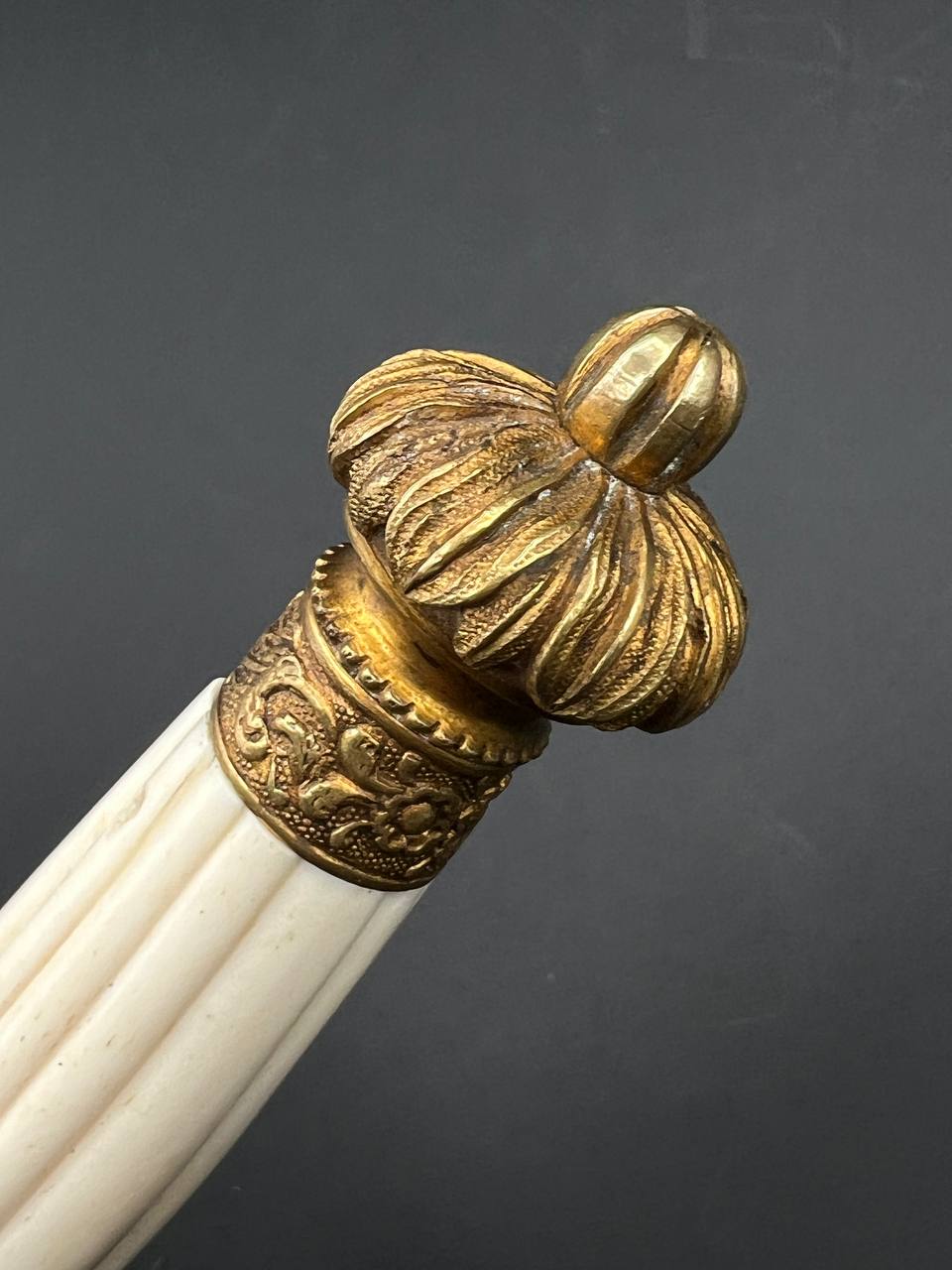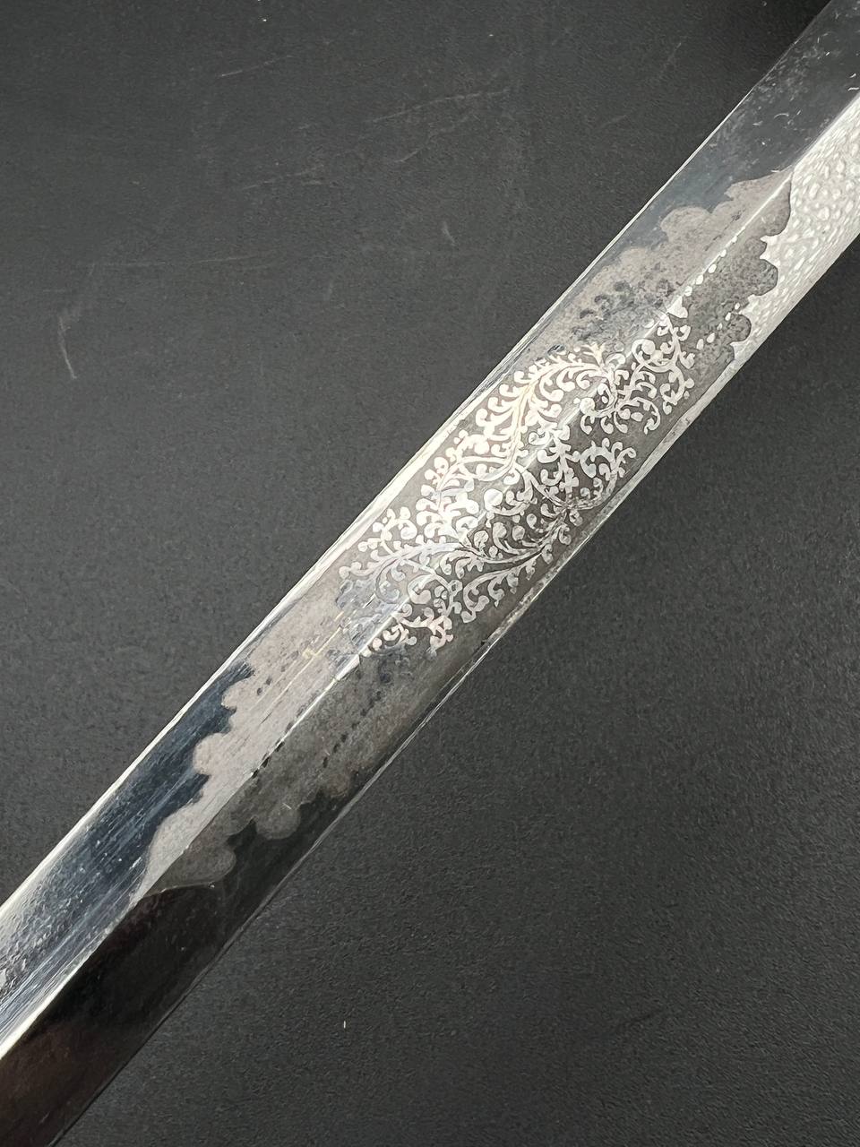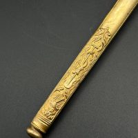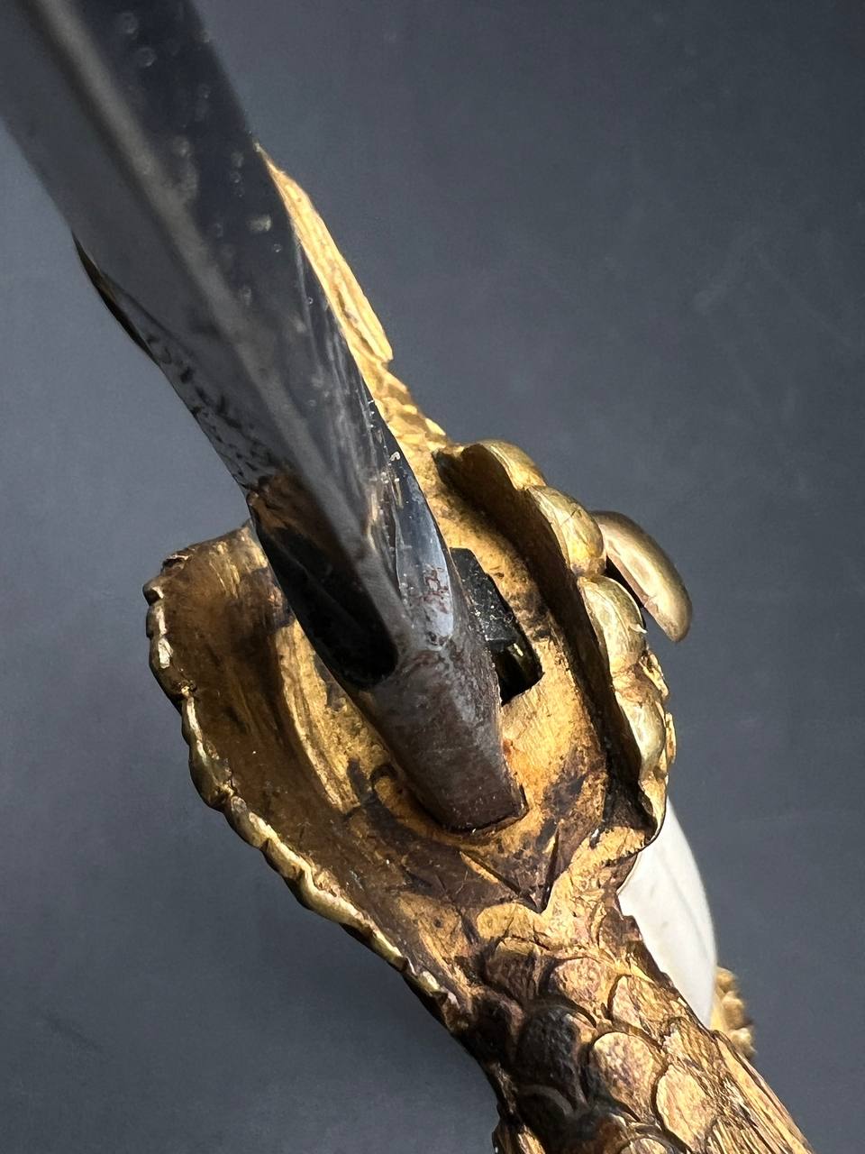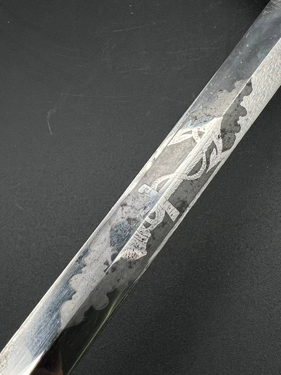 Austro-Hungarian Danube River Fleet Officer’s Dagger, a rare ceremonial piece from the late 19th to early 20th century, exhibiting remarkable craftsmanship throughout. The straight, double-edged blade of diamond cross-section features fine etched and engraved decoration, still clearly visible along its surface. The gilt-bronze hilt displays the iconic dolphin-shaped crossguard symbolizing naval and river service, while the fluted ivory (or imitation) grip ends with a richly ornamented ferrule and crown-shaped pommel. The gilded brass scabbard is adorned with high-relief decoration including an anchor beneath a royal crown and the D.S.F. monogram — Donaudampfschiffahrtsgesellschaft, the Danube Steamship Company later associated with the imperial river fleet. The surface is richly ornamented with scrolling motifs and shell-shaped suspension fittings. Overall condition is very good for its age, with noble patina and fine presentation. A scarce and elegant dagger, considerably rarer than the standard Austro-Hungarian naval patterns.