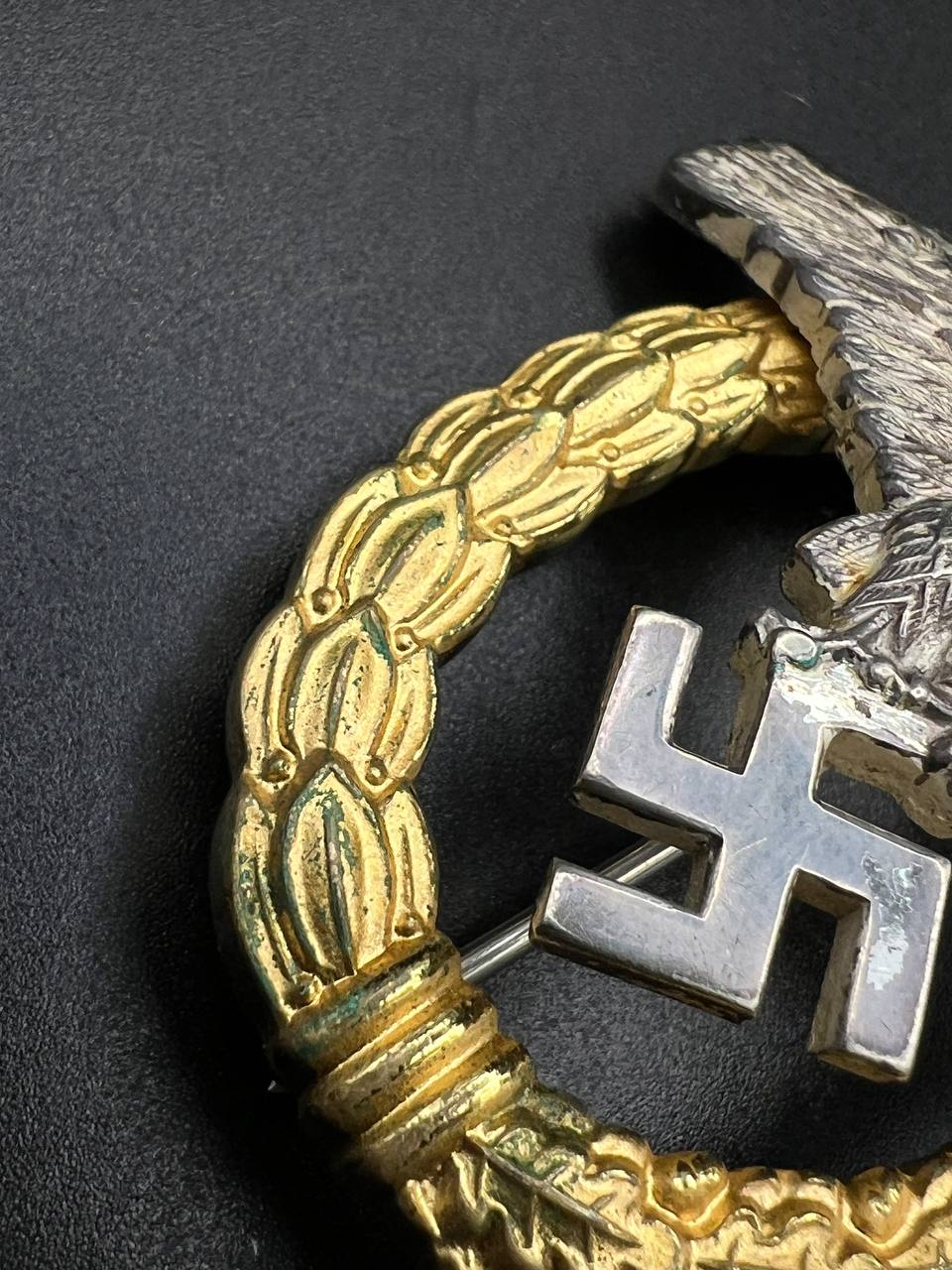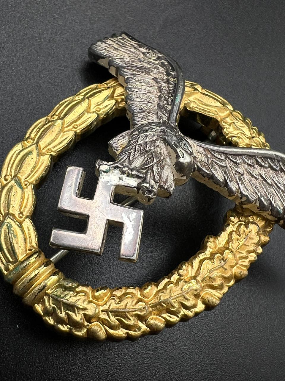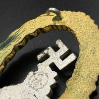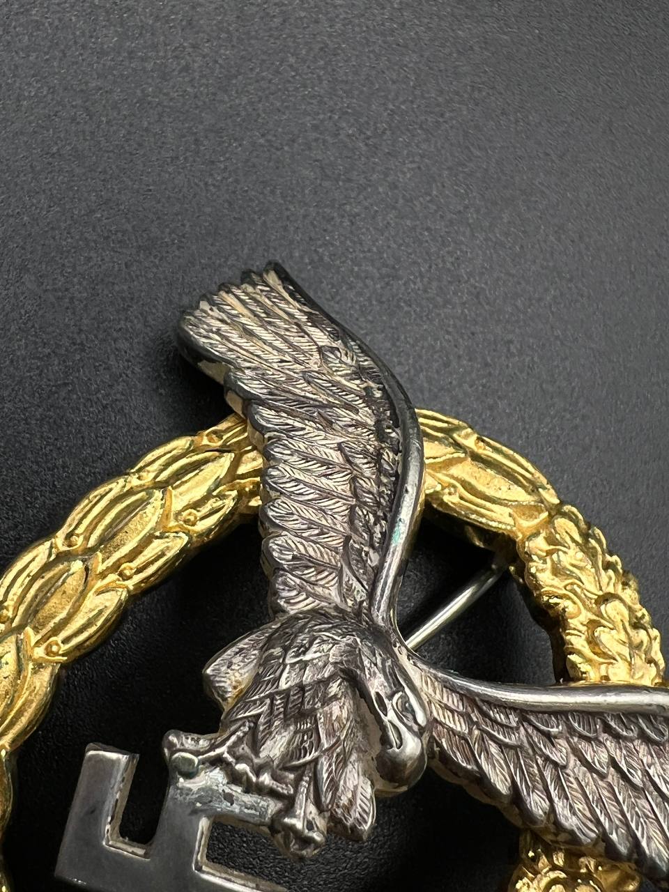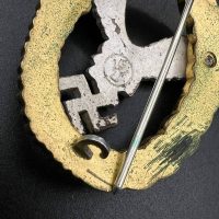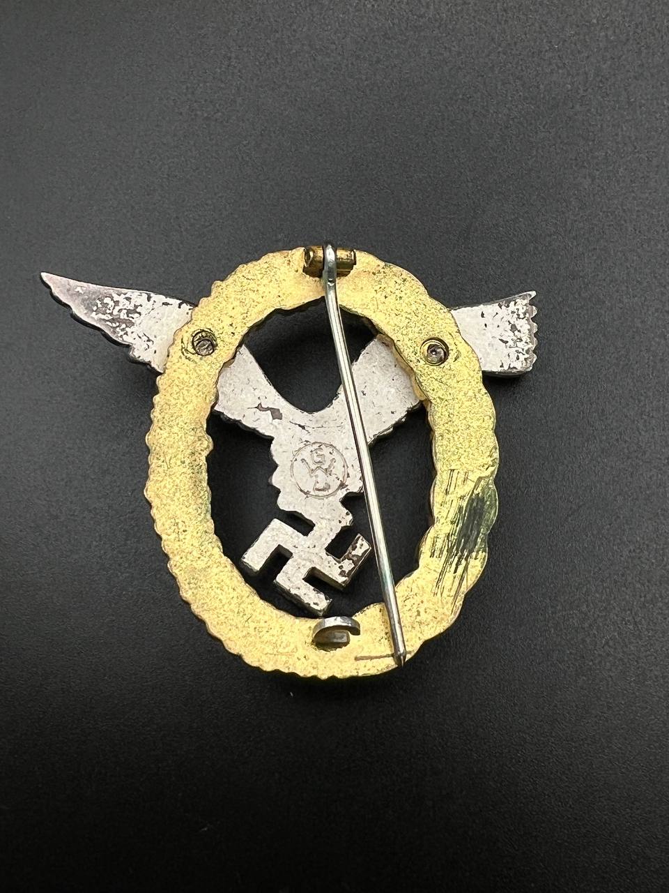 Non-ferrous metal, wreath gilt with polished edges, the eagle silver-plated with polished swastika. Reverse marked by manufacturer “GWL”, thin round pin.