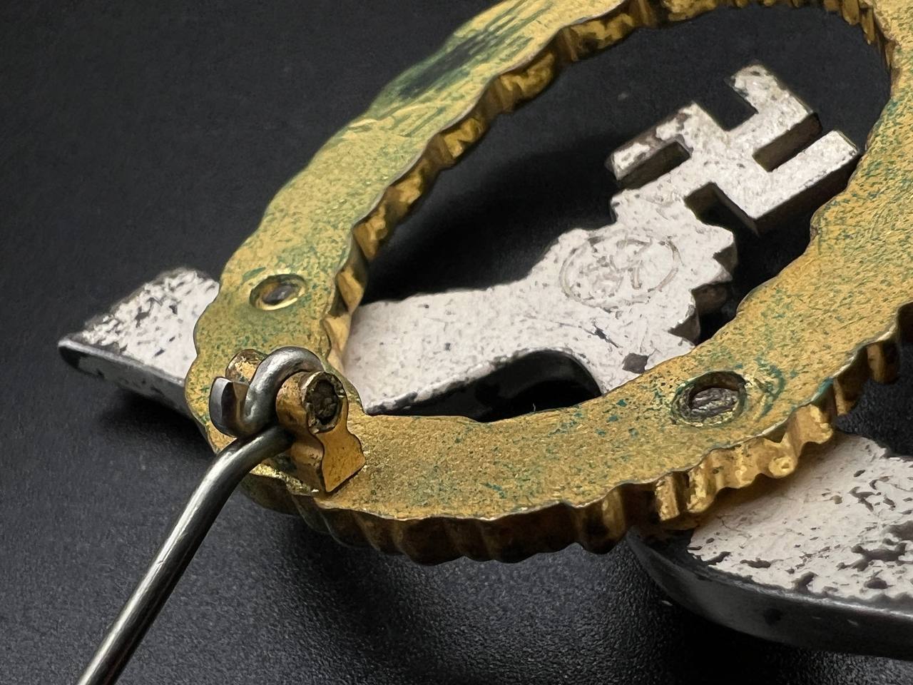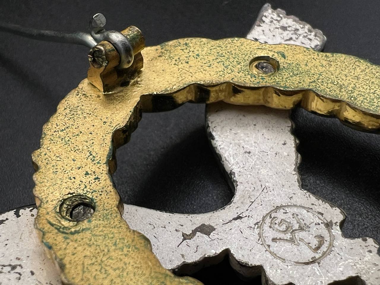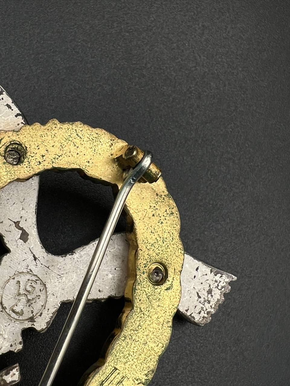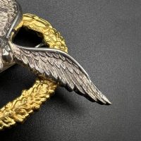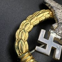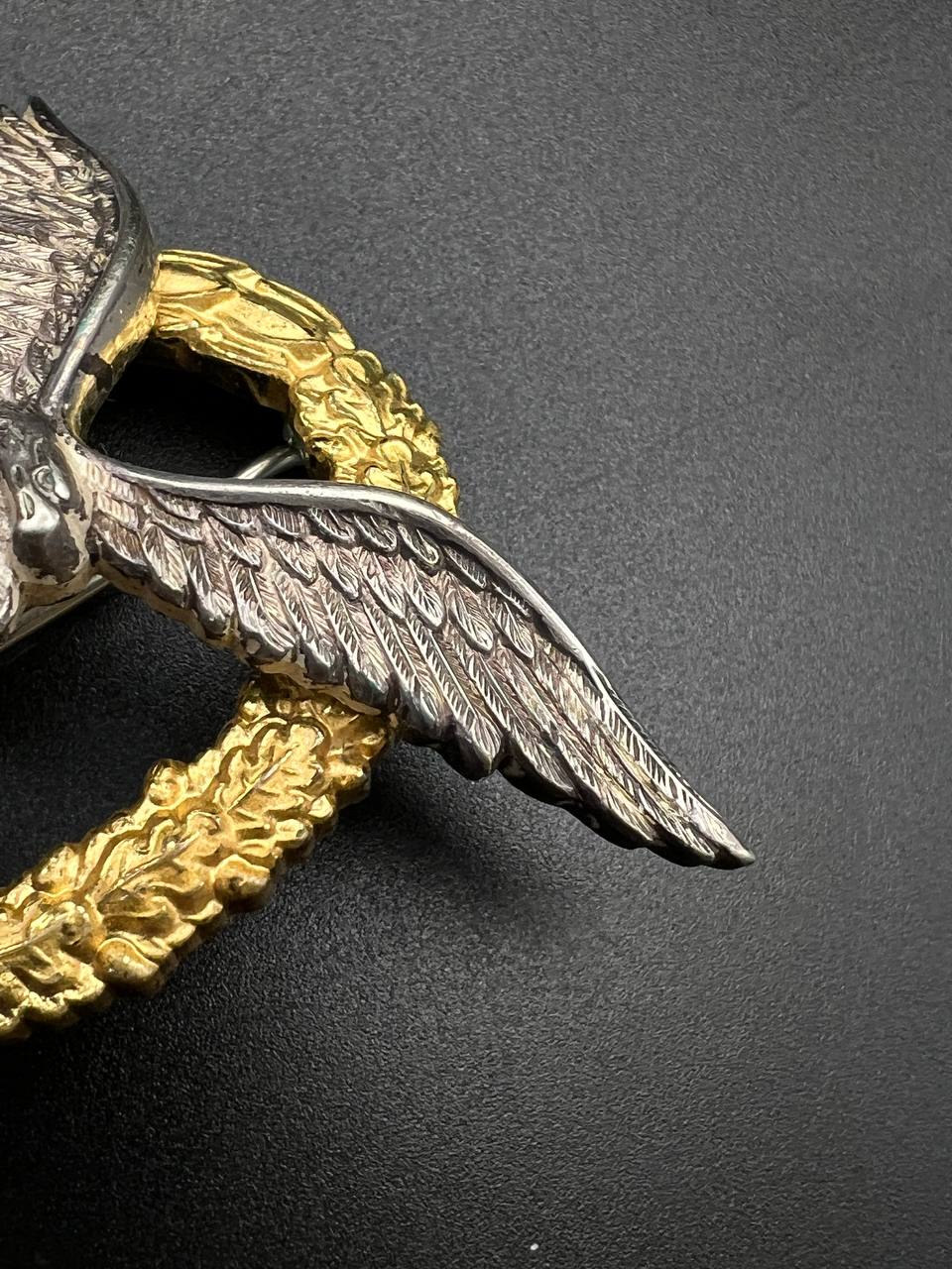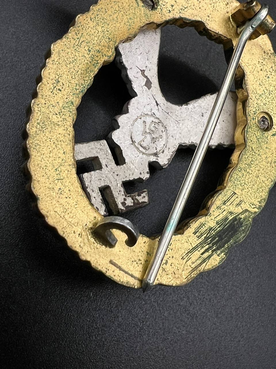 Non-ferrous metal, wreath gilt with polished edges, the eagle silver-plated with polished swastika. Reverse marked by manufacturer “GWL”, thin round pin.