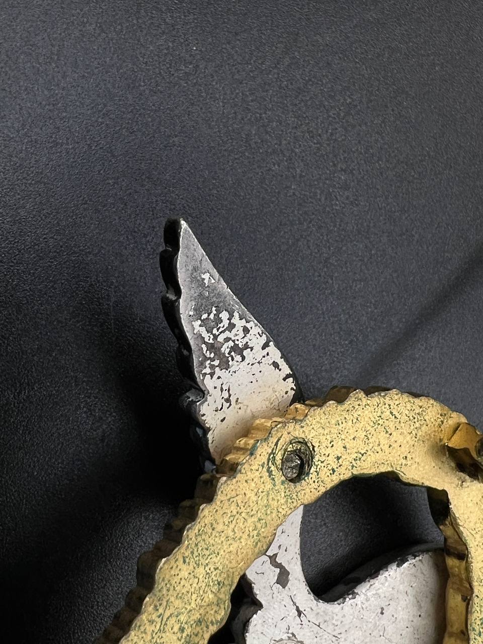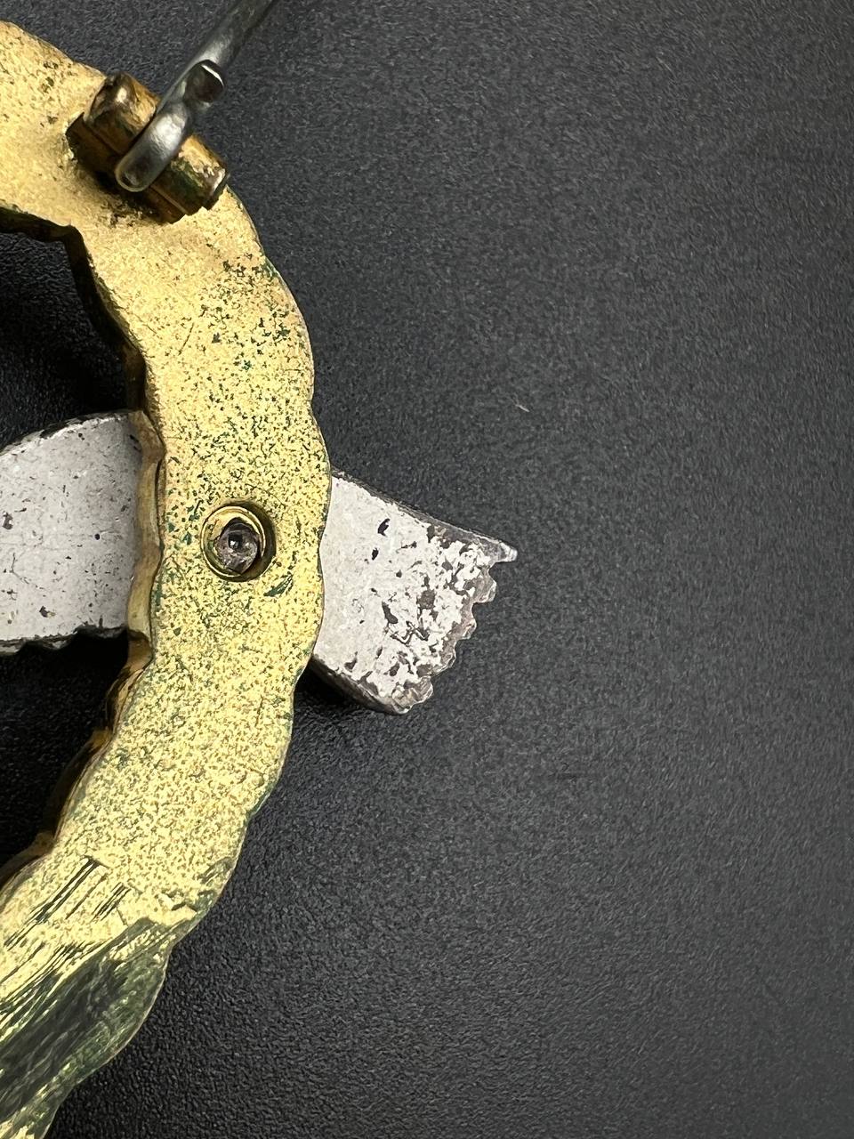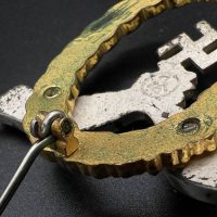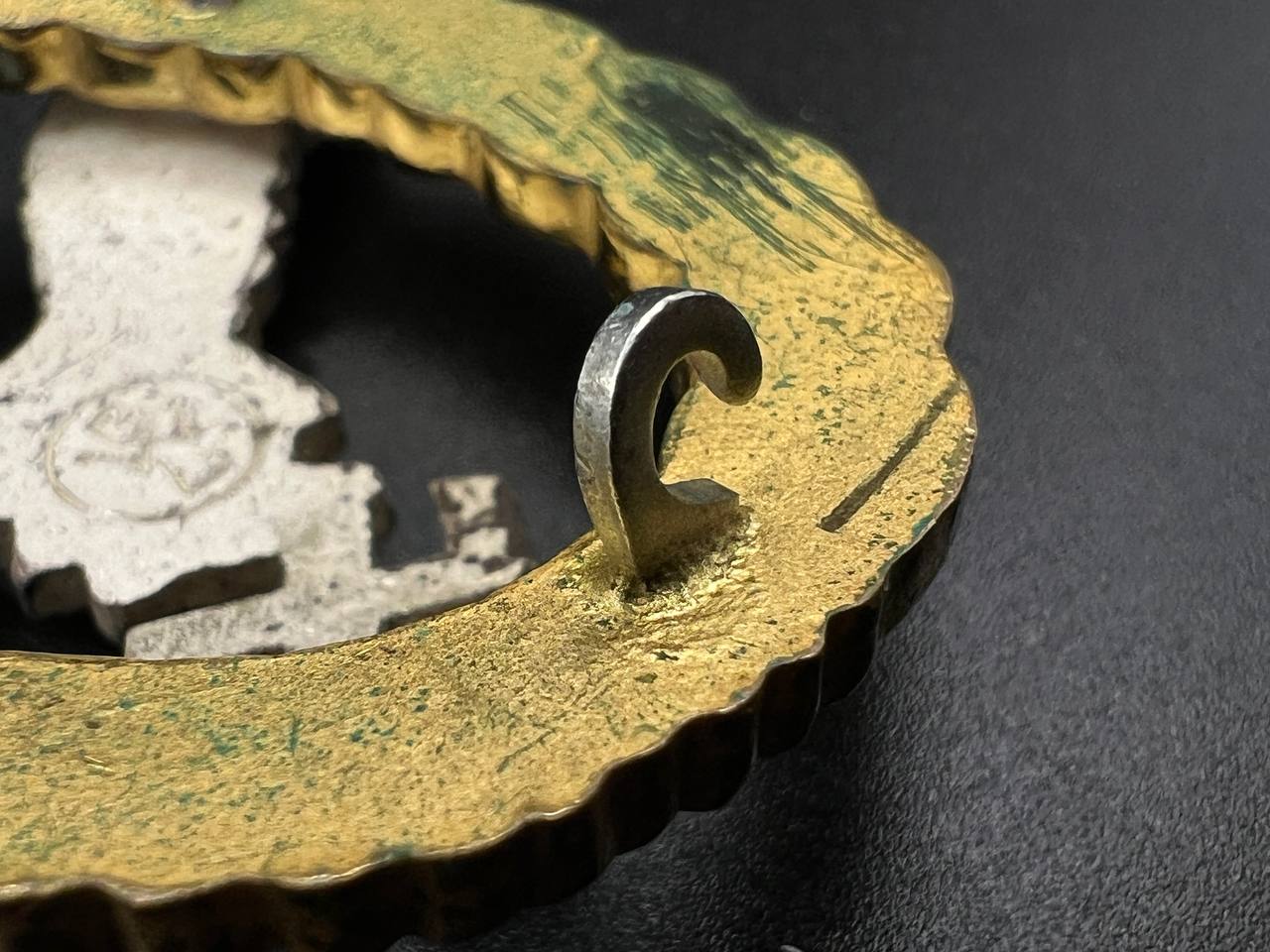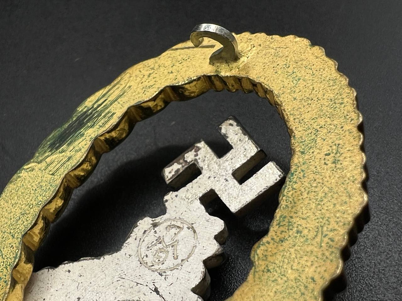 Non-ferrous metal, wreath gilt with polished edges, the eagle silver-plated with polished swastika. Reverse marked by manufacturer “GWL”, thin round pin.