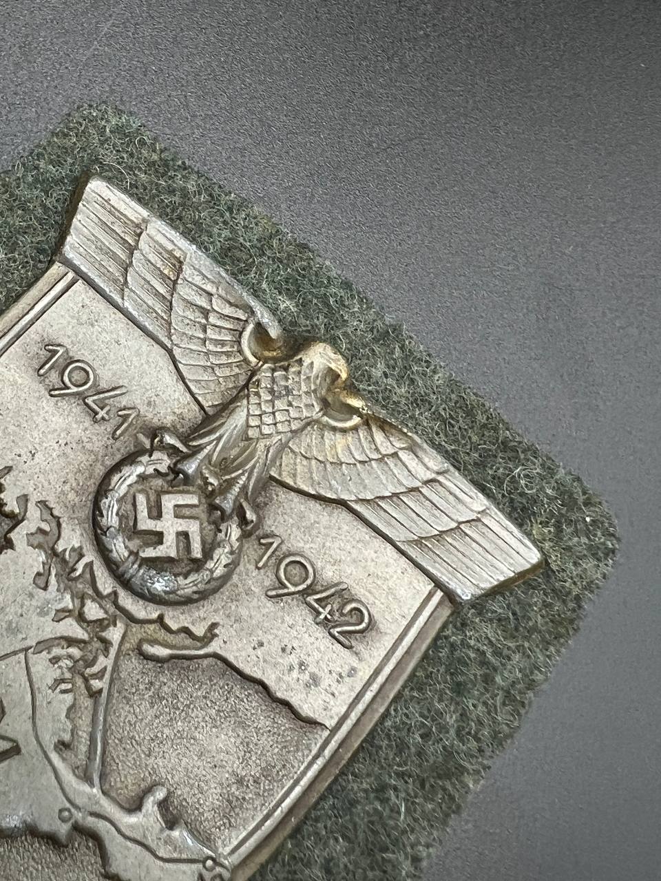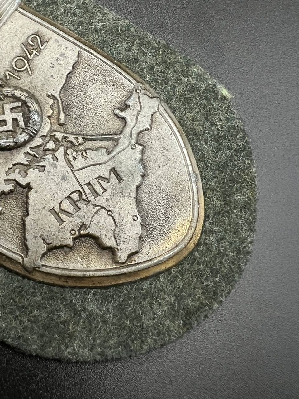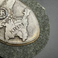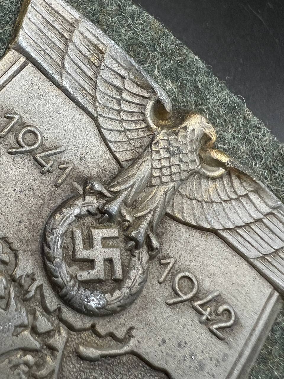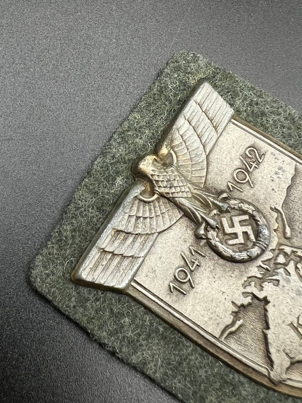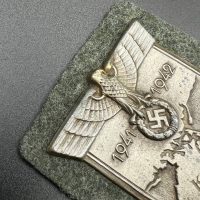 Fine zinc on field-gray cloth backing with back plate and paper underlayer. Unissued condition