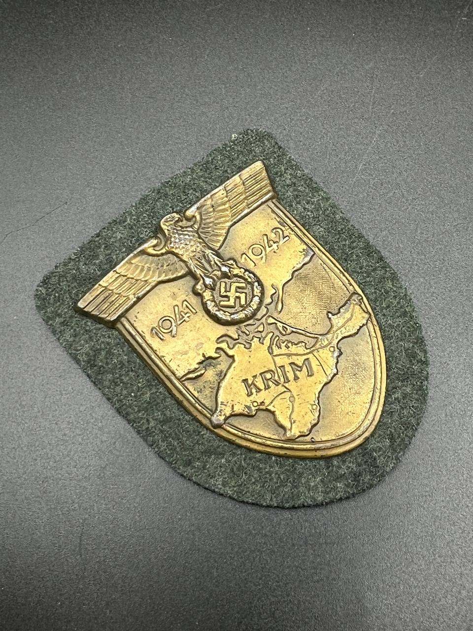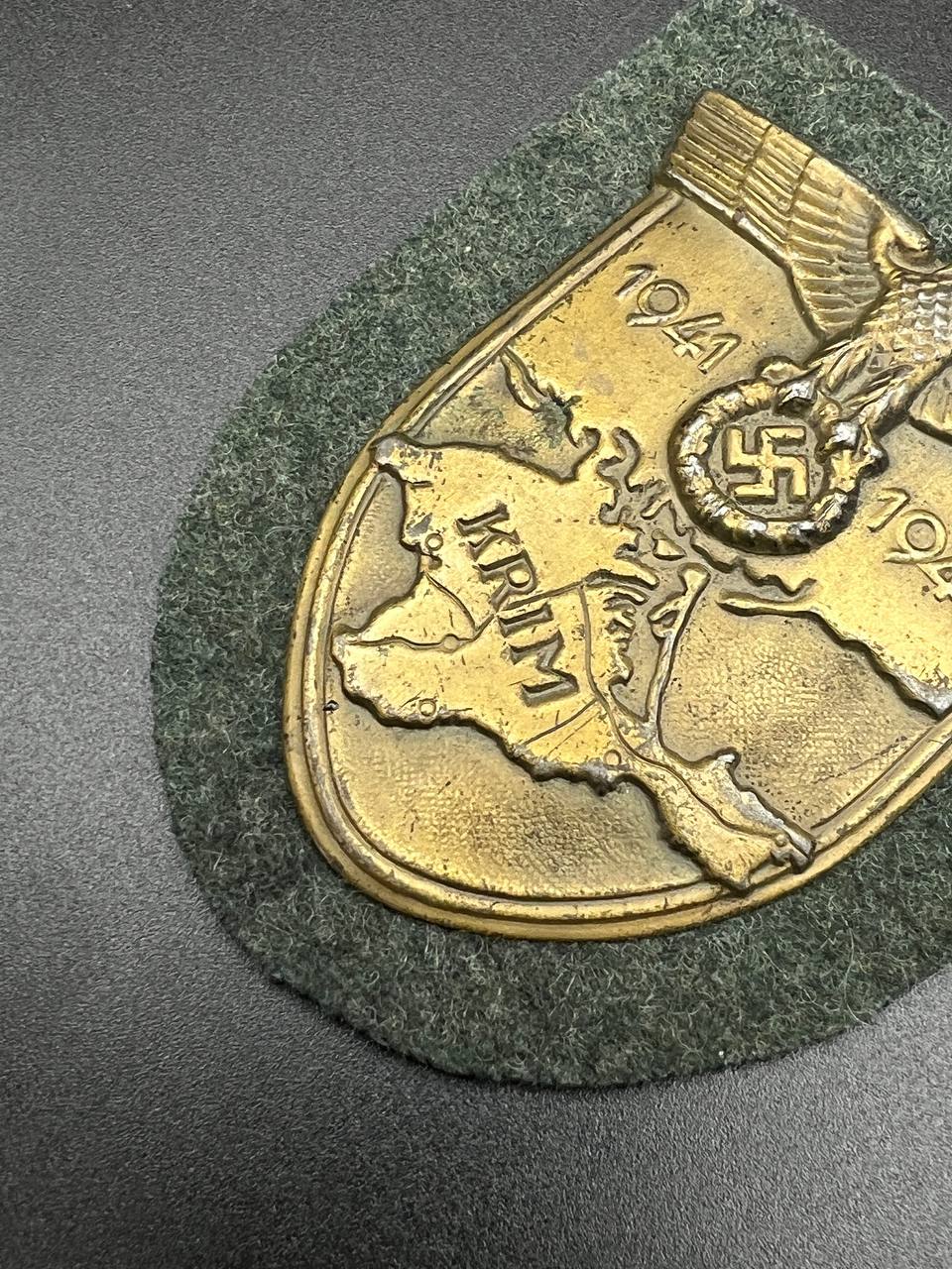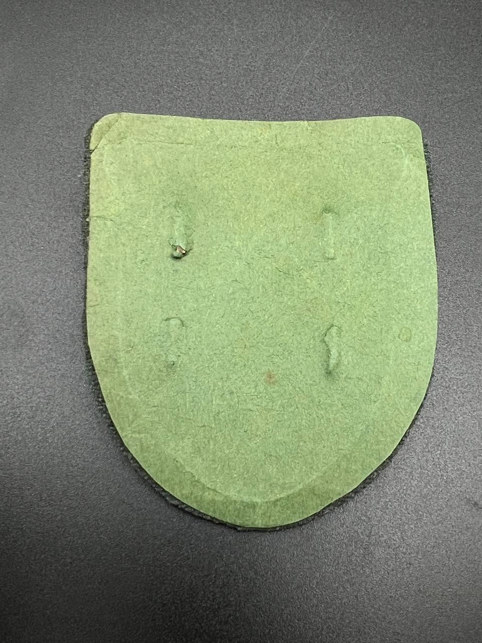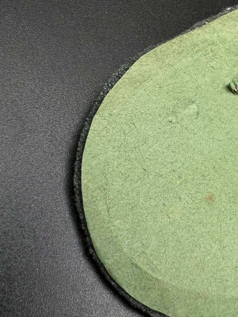 Bronzed sheet steel on field-gray wool backing, backplate with green paper covering