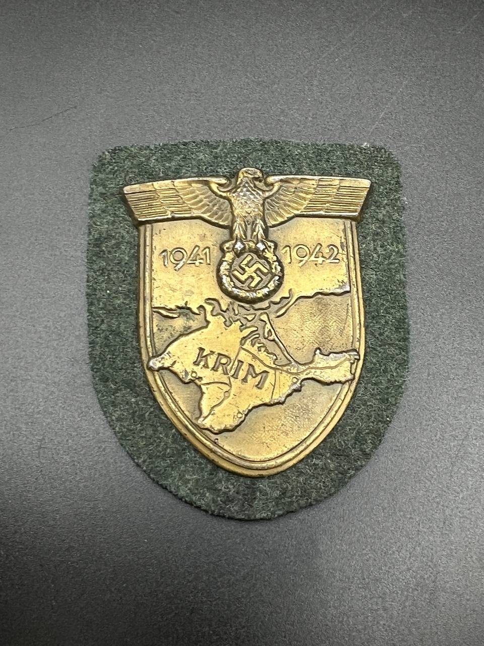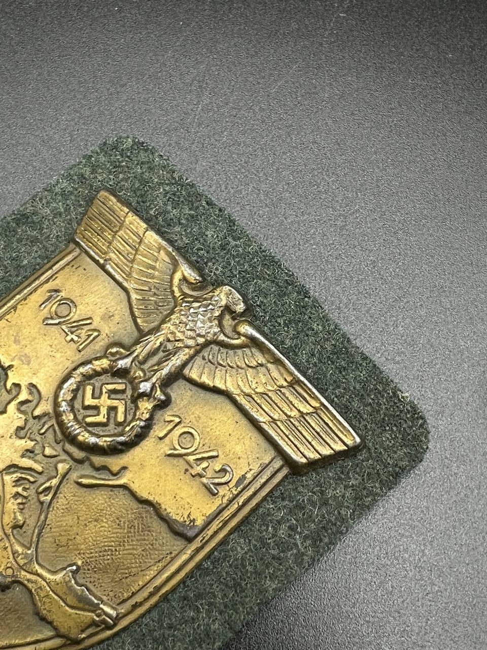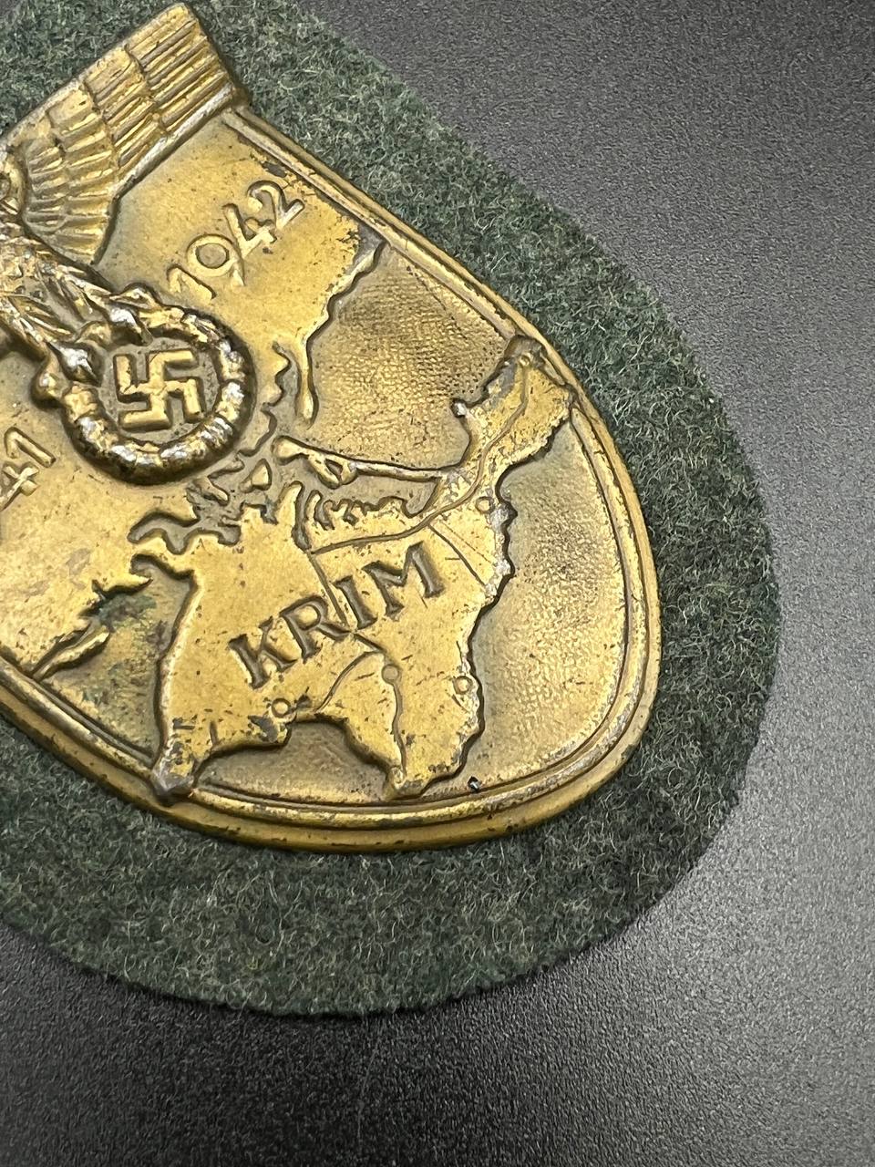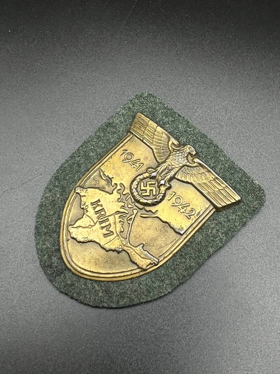 Bronzed sheet steel on field-gray wool backing, backplate with green paper covering