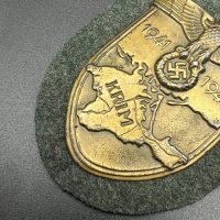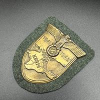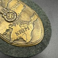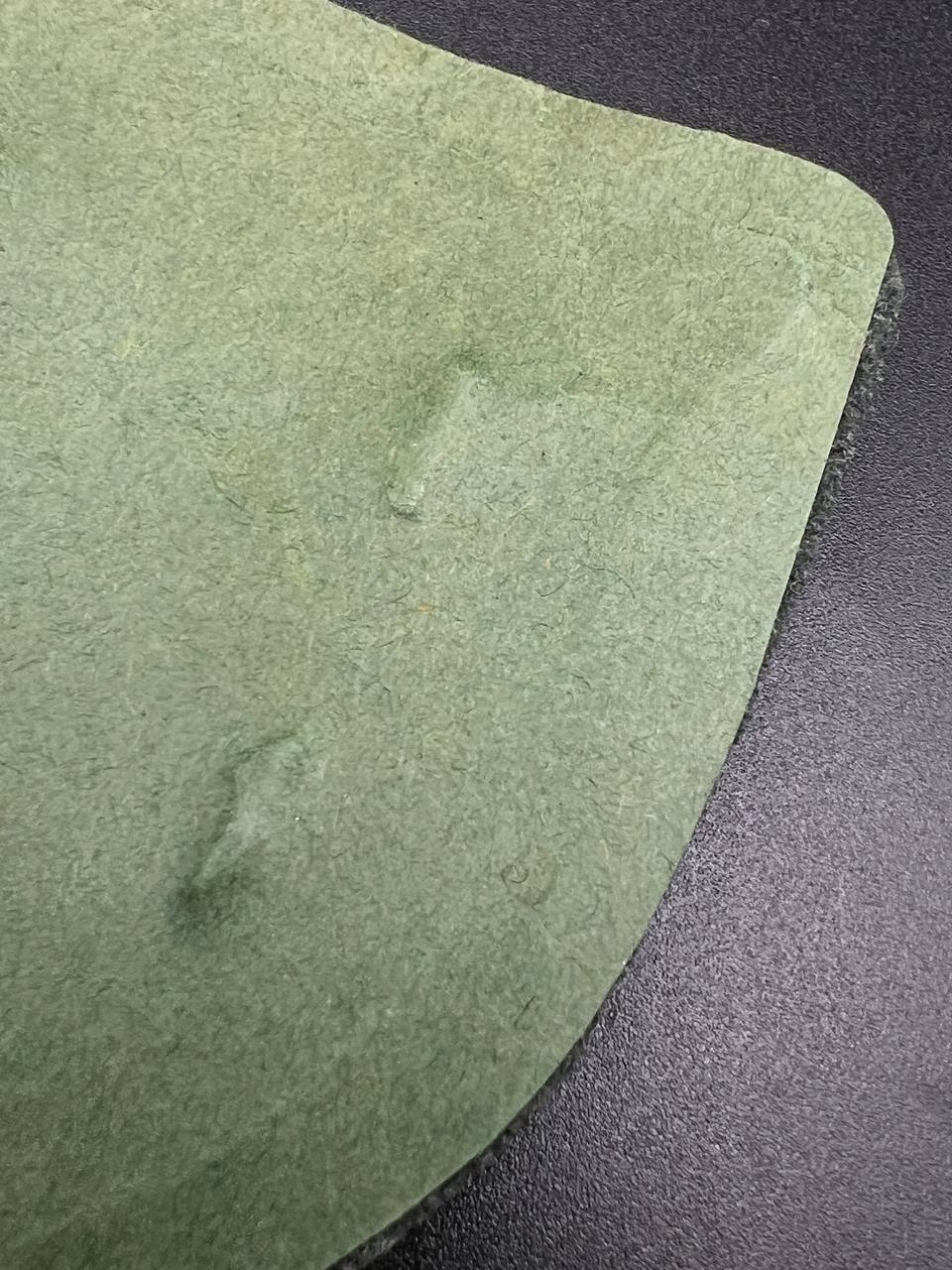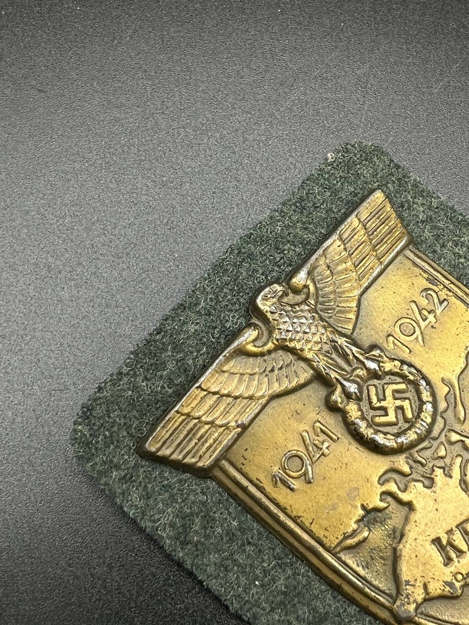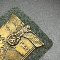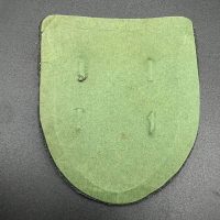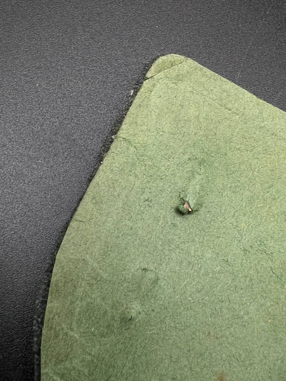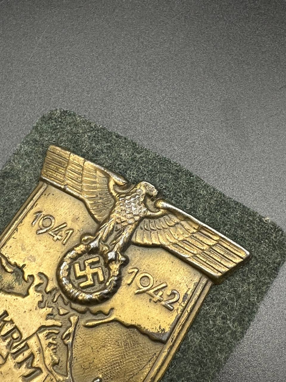 Bronzed sheet steel on field-gray wool backing, backplate with green paper covering
