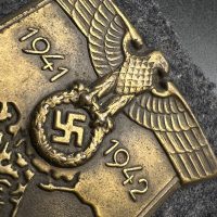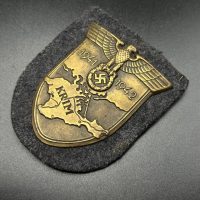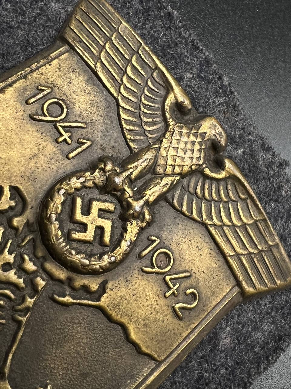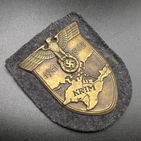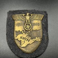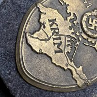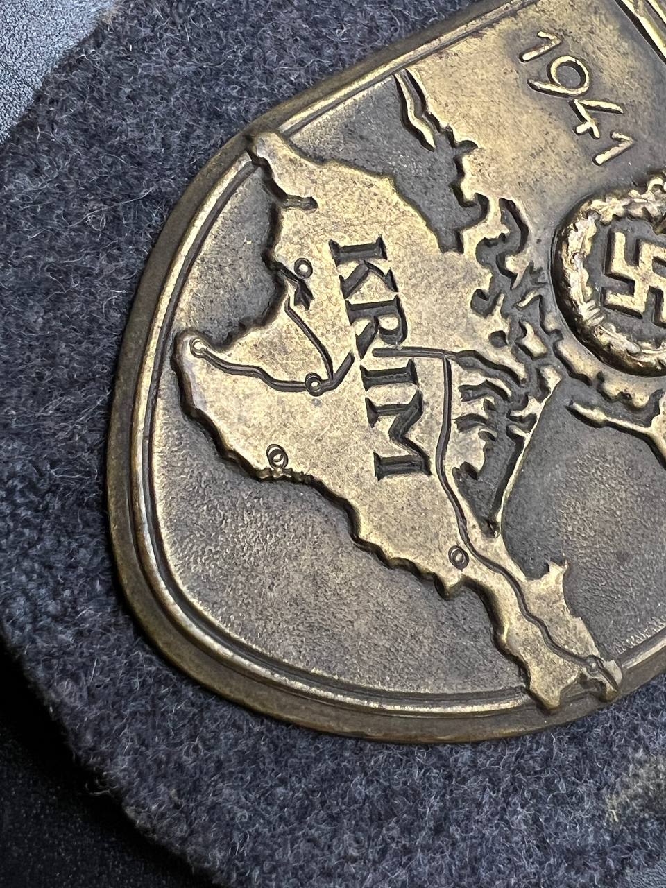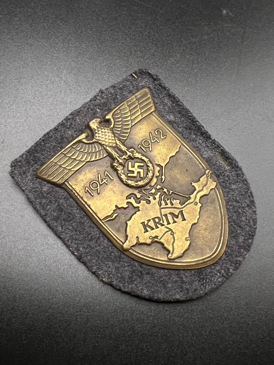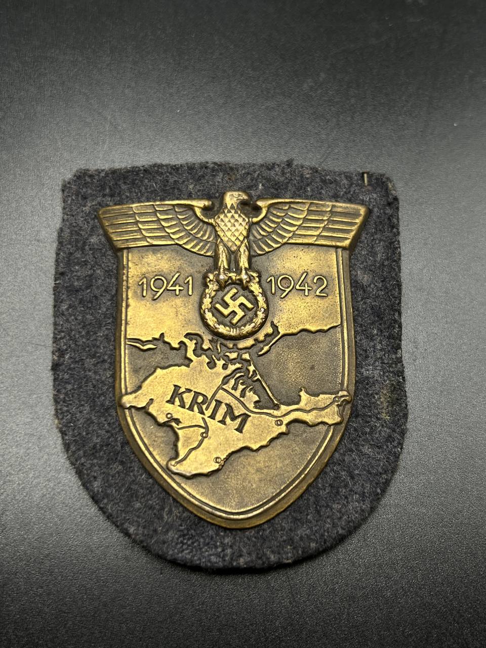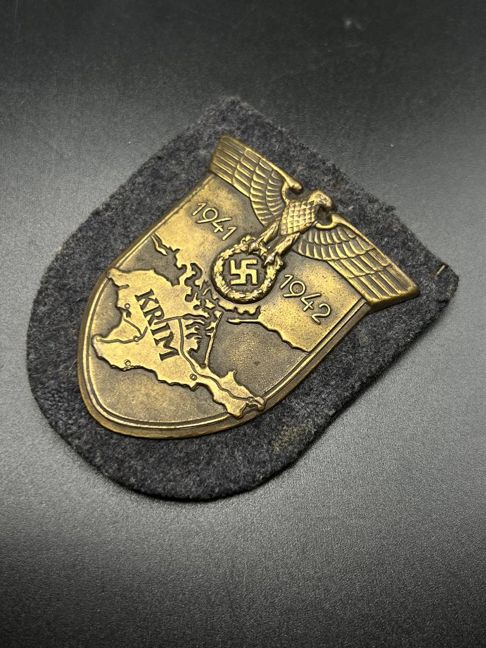 An original 1941–1942 Crimea Shield (Krimschild), produced as a solid brass stamped badge with strong, well-defined relief. The eagle, dates, and Crimea map are crisp, with a natural aged patina and no signs of restoration. The bronze finish is partially retained, typical for worn period examples.