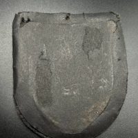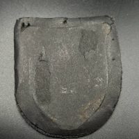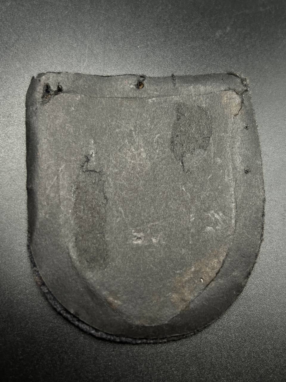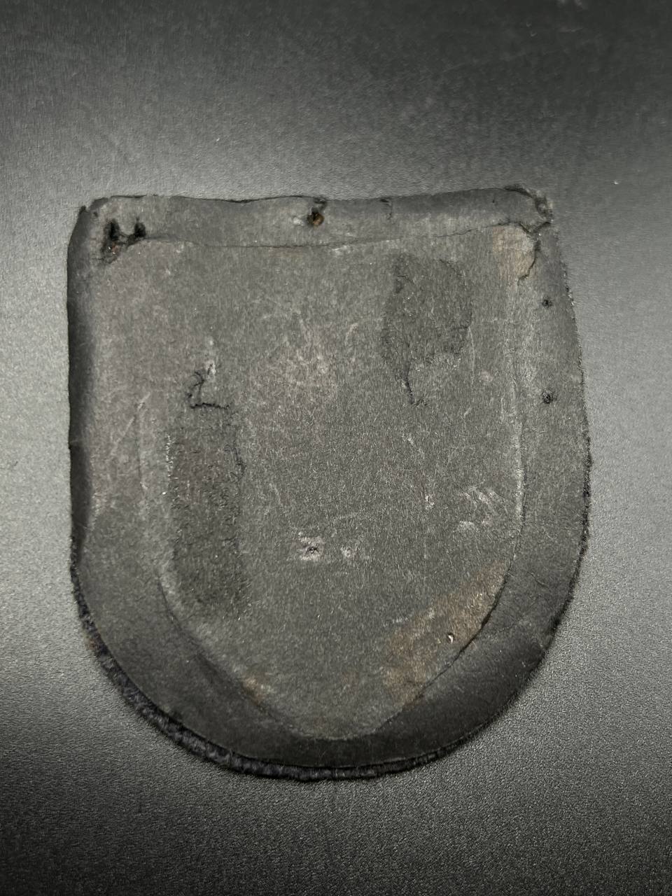 The shield is mounted on its correct dark-grey wool backing with internal cardboard stiffener, matching authentic wartime construction. The reverse shows period attachment marks, consistent with actual wear on the uniform. Overall condition is very good, with original materials fully intact.