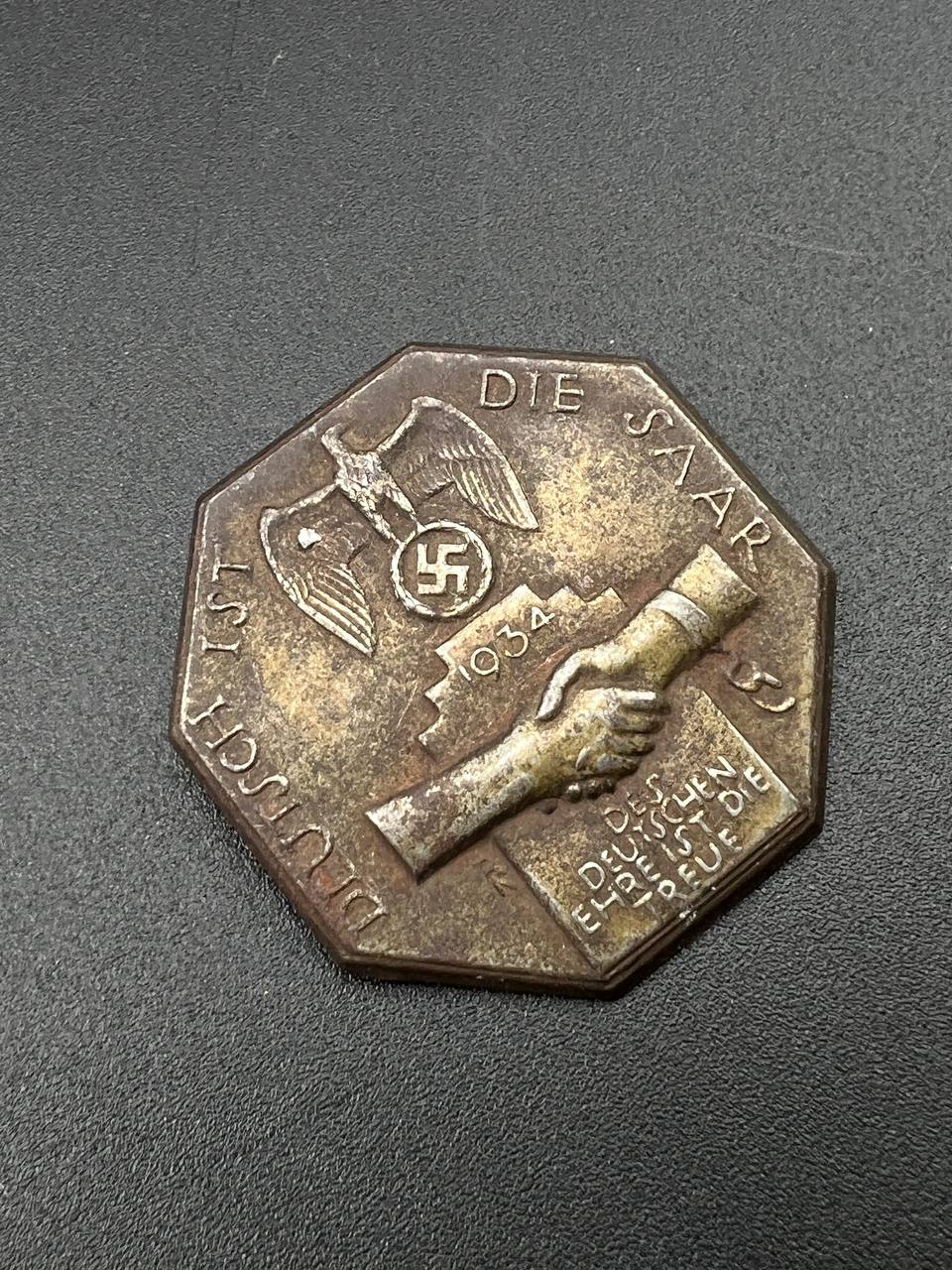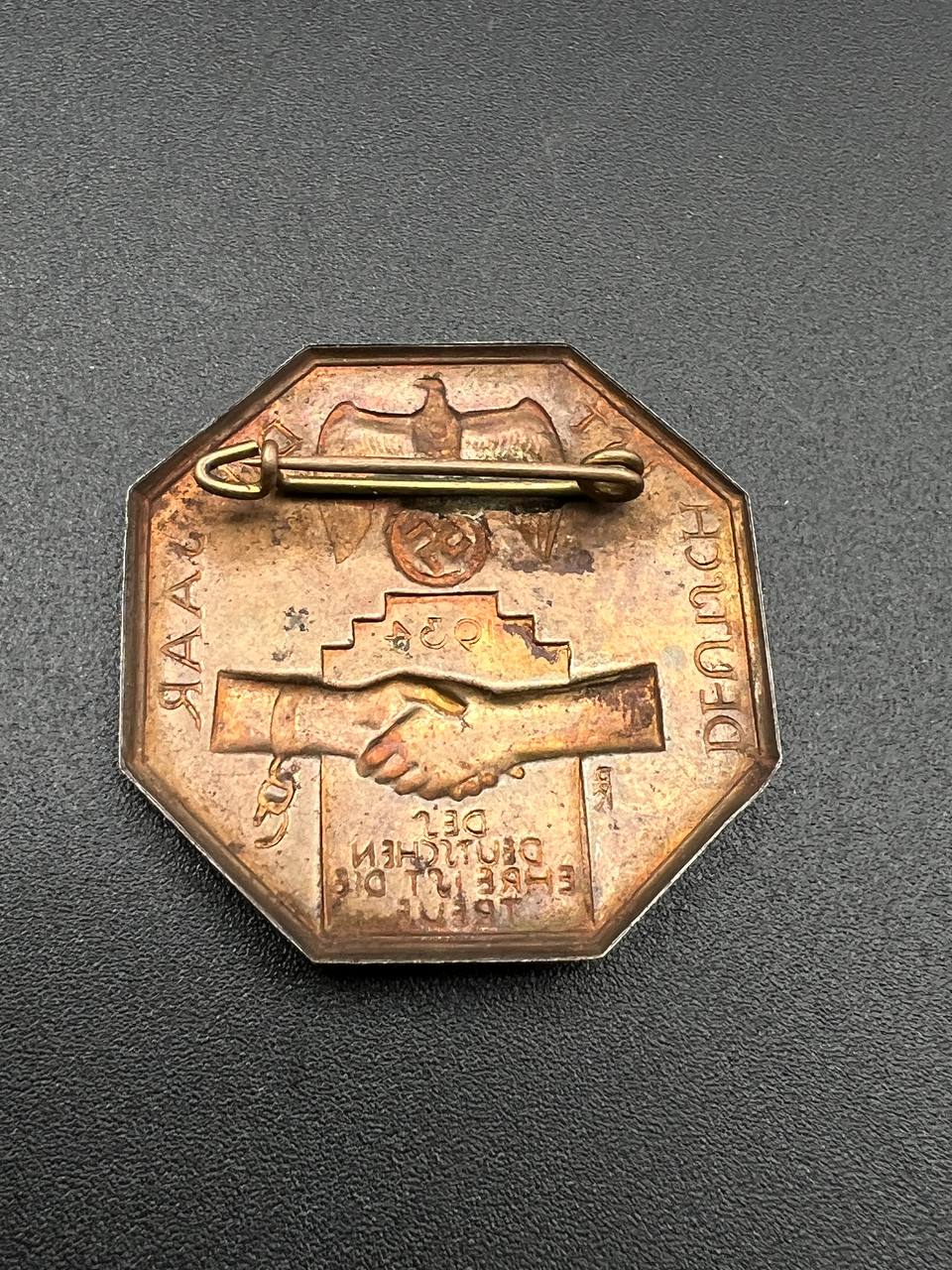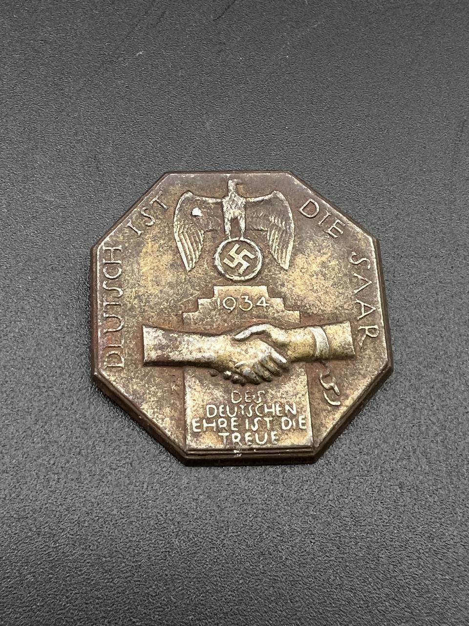 Original German propaganda badge issued in 1934 in support of the Saar region’s return to Germany. Octagonal bronze-finished metal with pin-back fastening. The obverse features an eagle with swastika above a handshake on a cross, with inscriptions “Deutsch ist die Saar” and “Des Deutschen Ehre ist die Treue” (“A German’s honor is loyalty”). Produced during the national campaign leading up to the 1935 Saar plebiscite. Very good condition with attractive bronze patina.