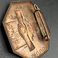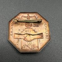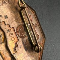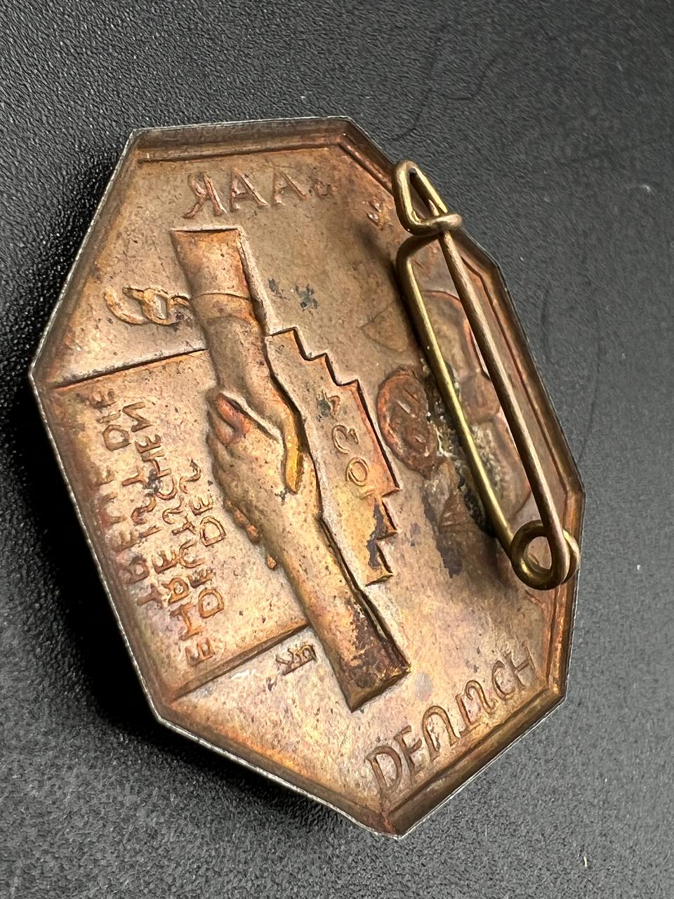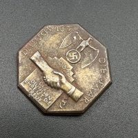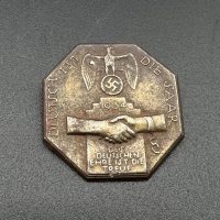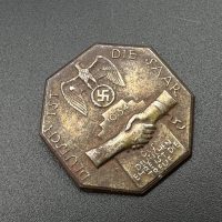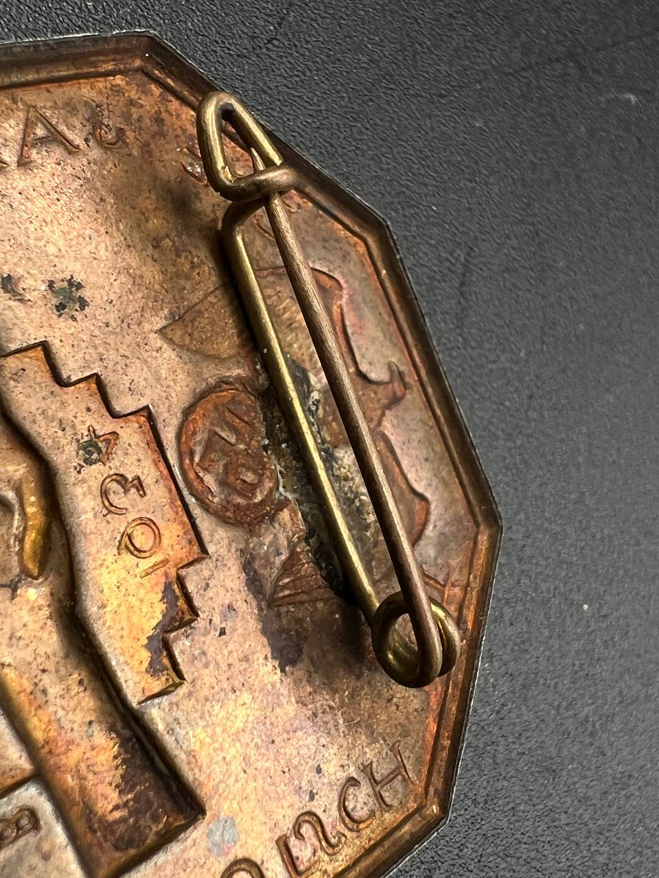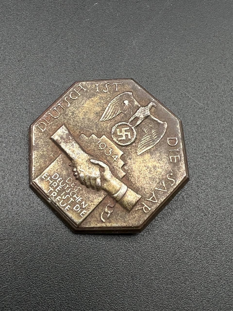 Original German propaganda badge issued in 1934 in support of the Saar region’s return to Germany. Octagonal bronze-finished metal with pin-back fastening. The obverse features an eagle with swastika above a handshake on a cross, with inscriptions “Deutsch ist die Saar” and “Des Deutschen Ehre ist die Treue” (“A German’s honor is loyalty”). Produced during the national campaign leading up to the 1935 Saar plebiscite. Very good condition with attractive bronze patina.