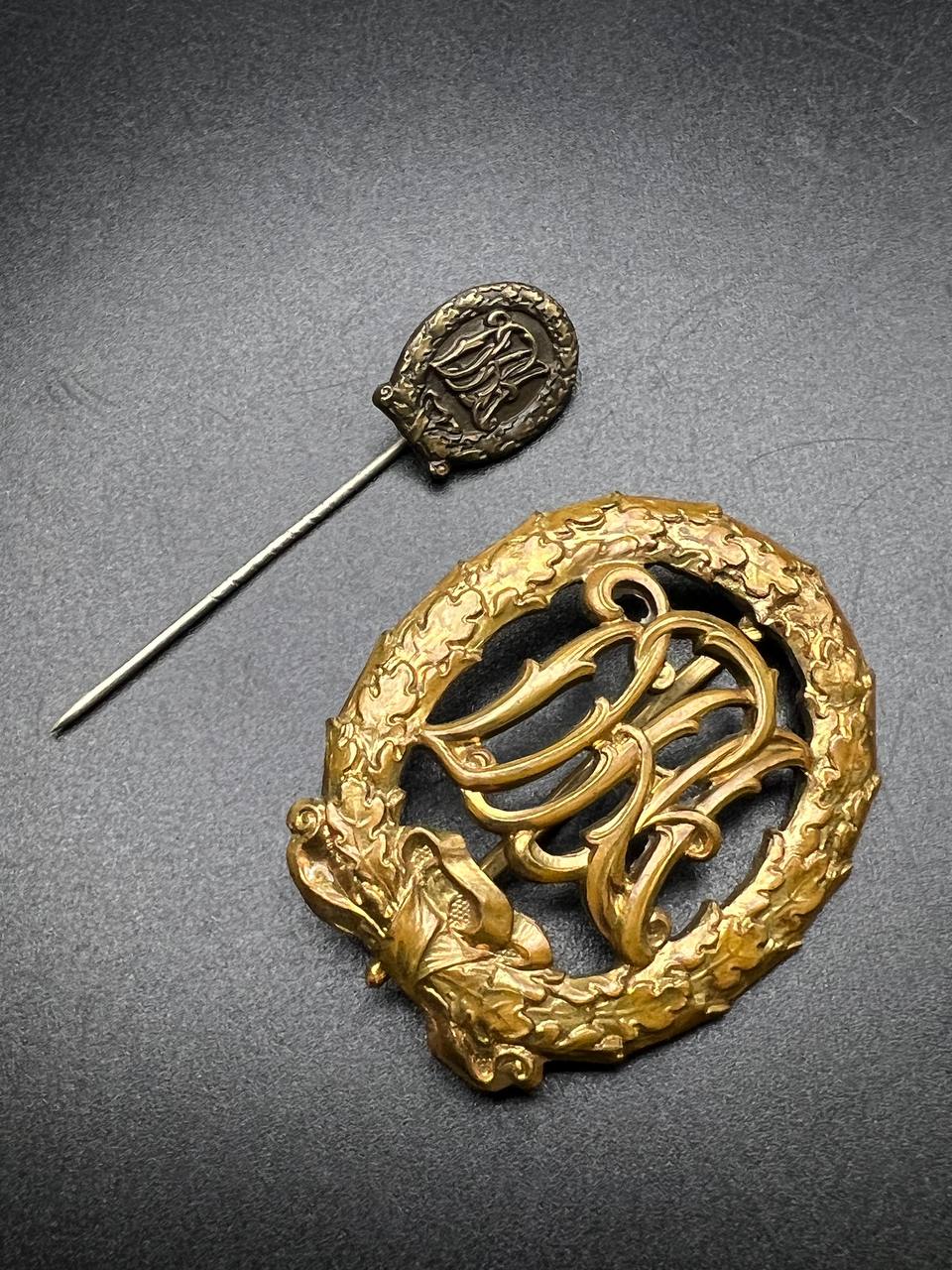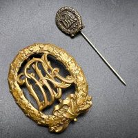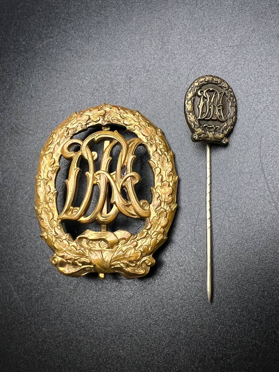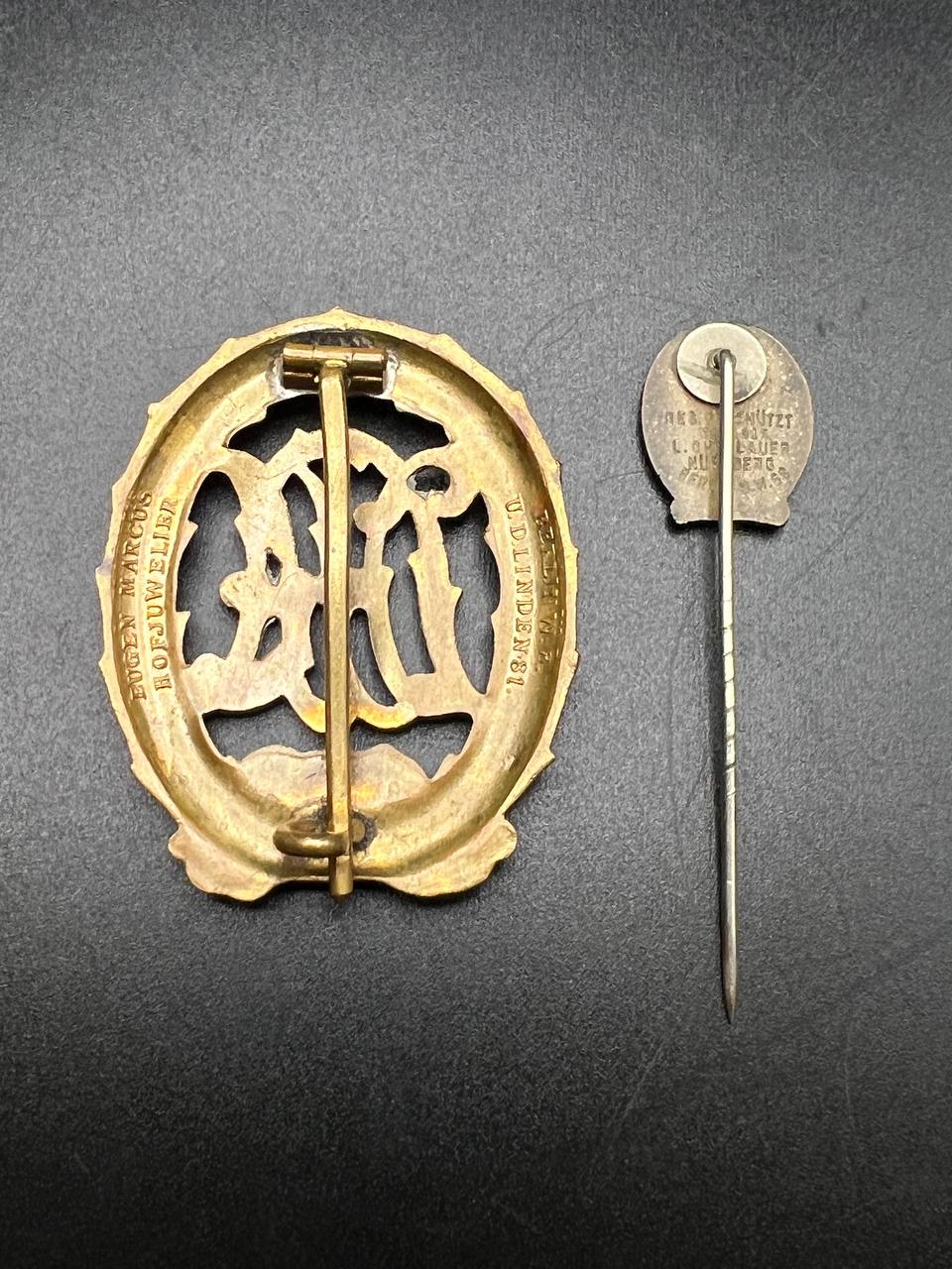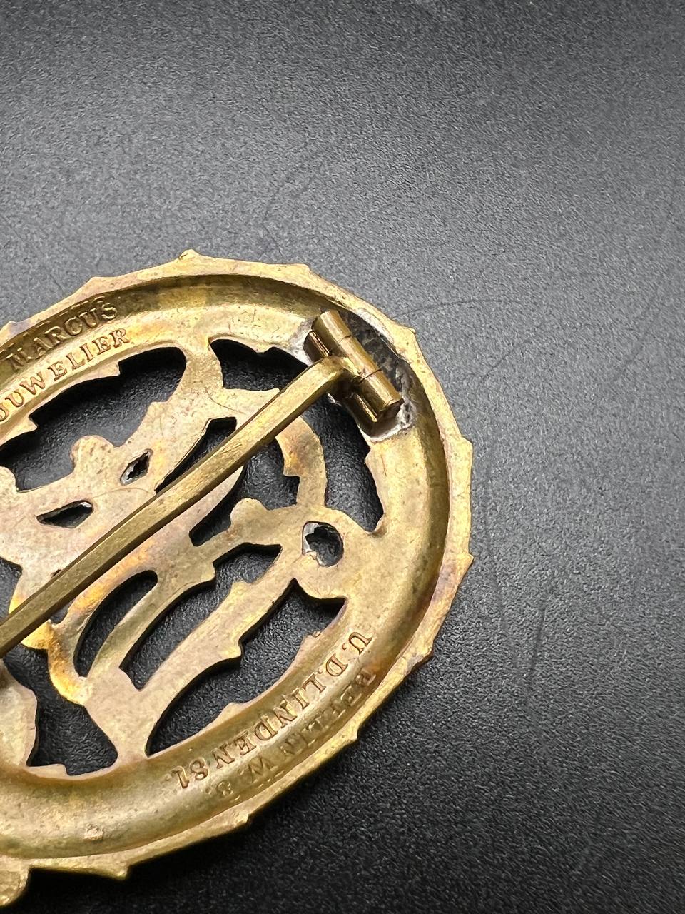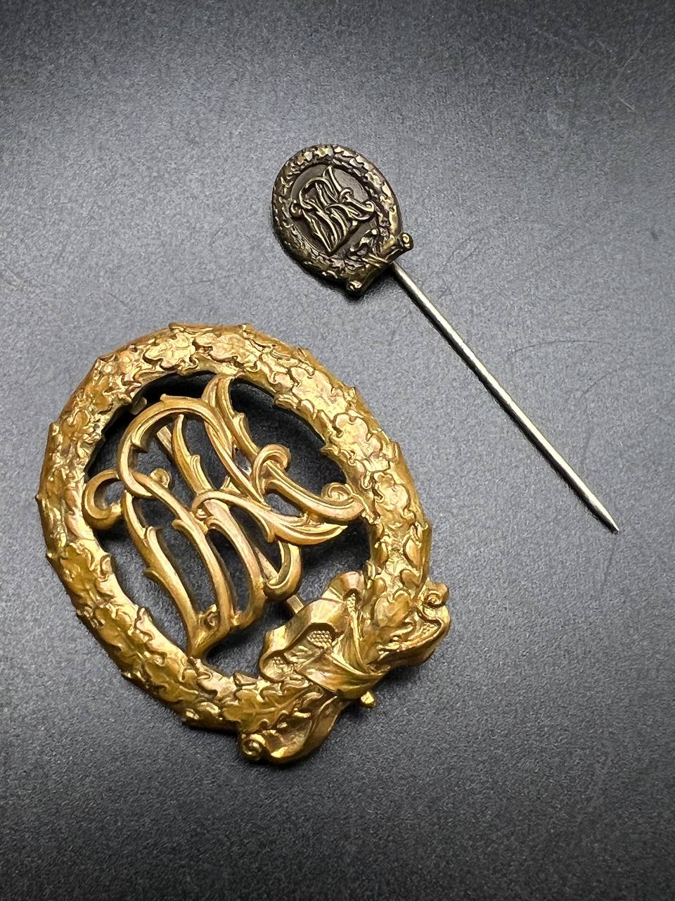 Original German DRA sports badge in gilt bronze, interwar period. Classic oval wreath with DRA monogram to the center. Reverse marked, fitted with original vertical pin. Accompanied by a miniature stickpin. Good collectible condition with even patina and no repairs.
