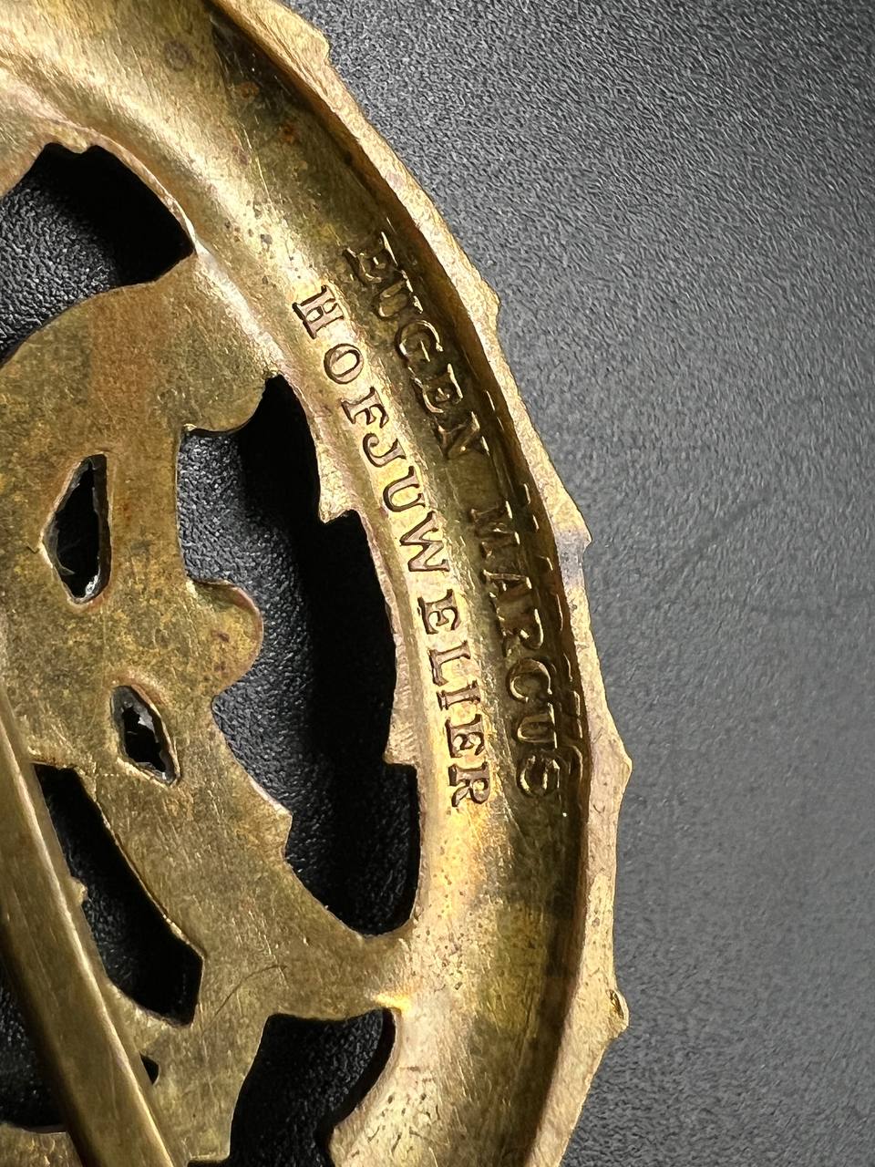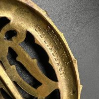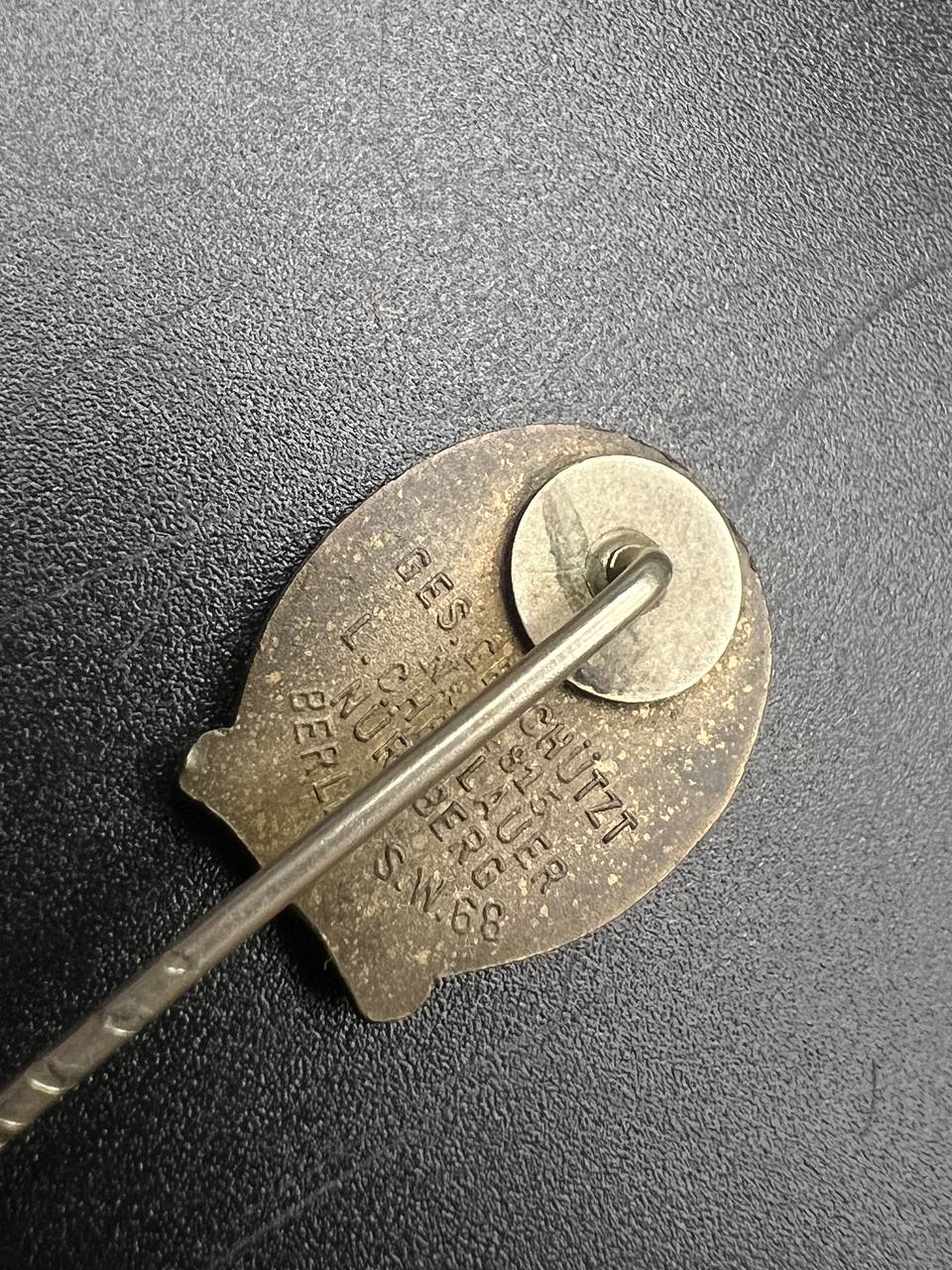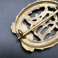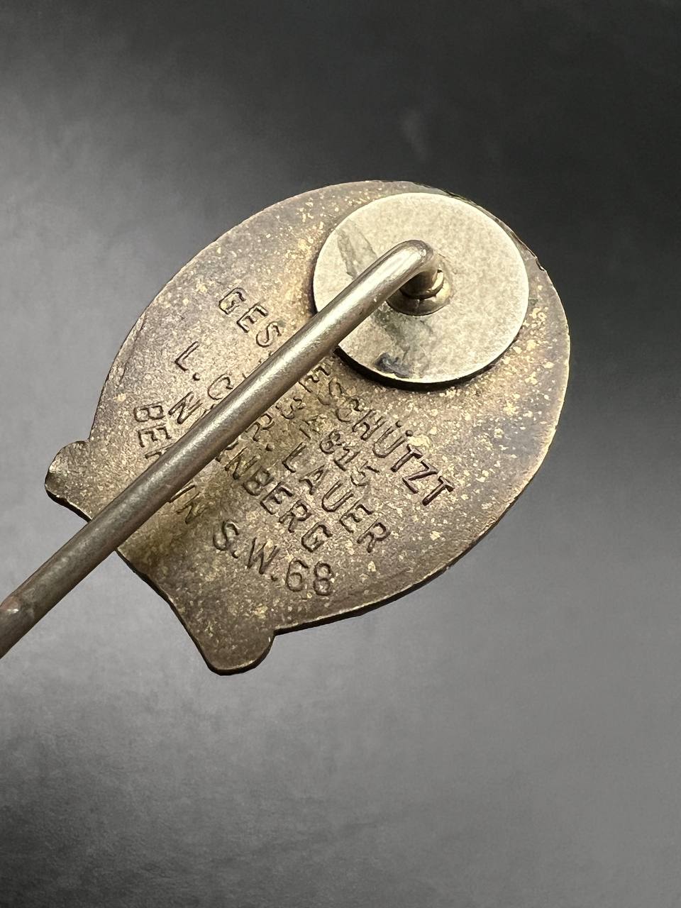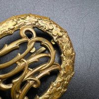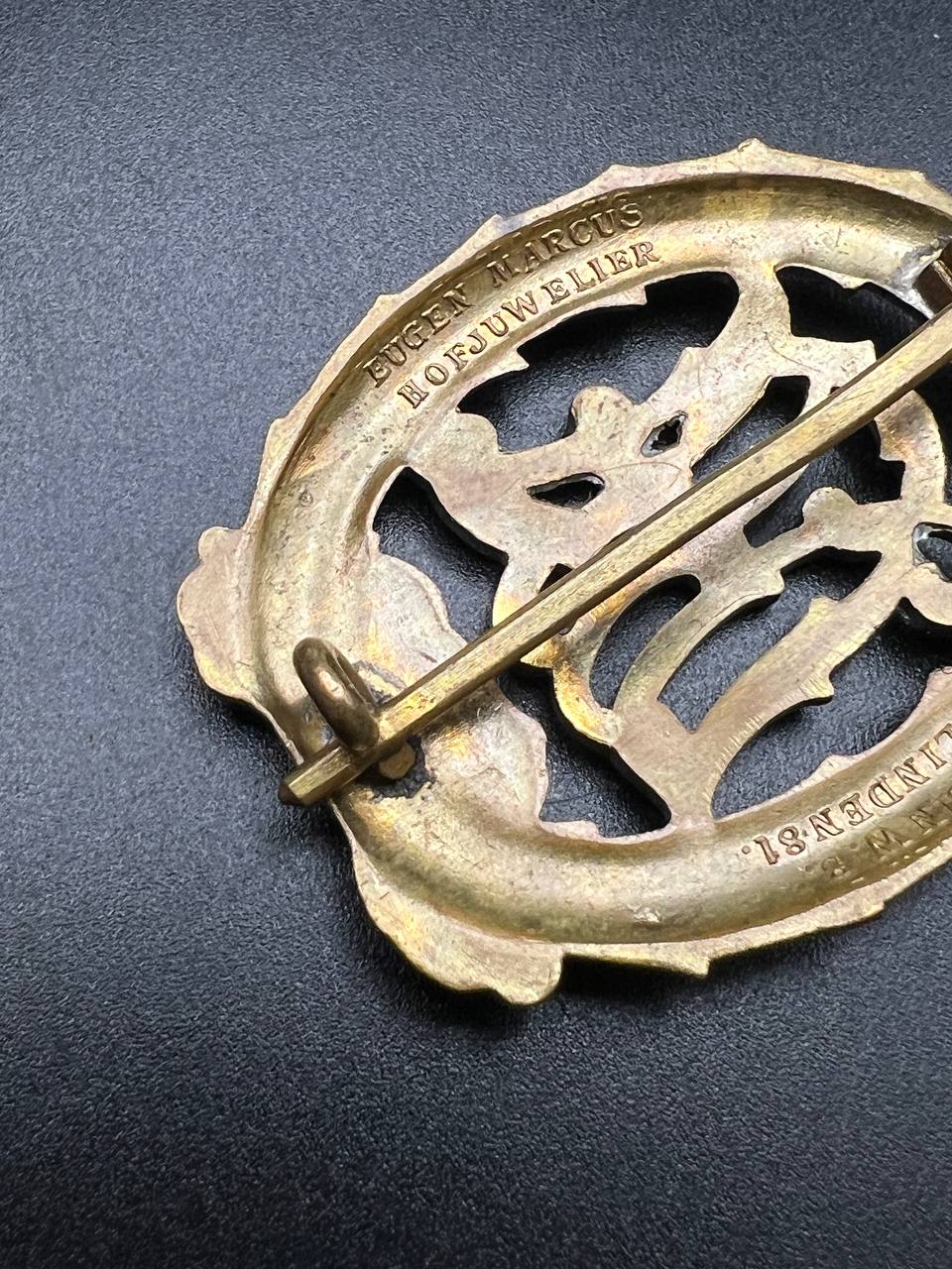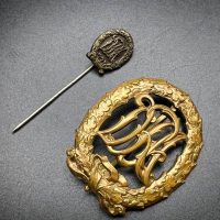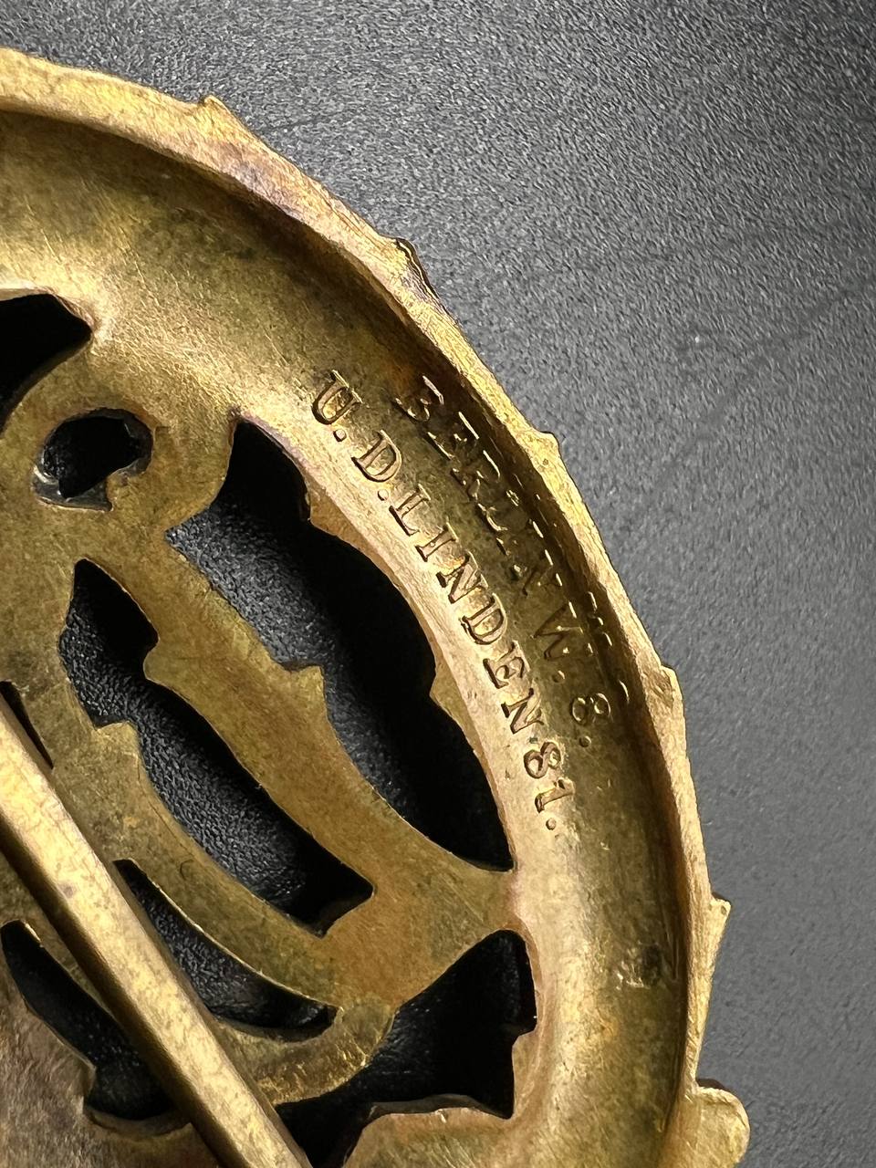 Original German DRA sports badge in gilt bronze, interwar period. Classic oval wreath with DRA monogram to the center. Reverse marked, fitted with original vertical pin. Accompanied by a miniature stickpin. Good collectible condition with even patina and no repairs.