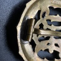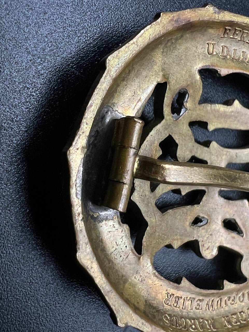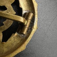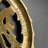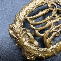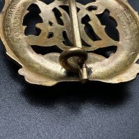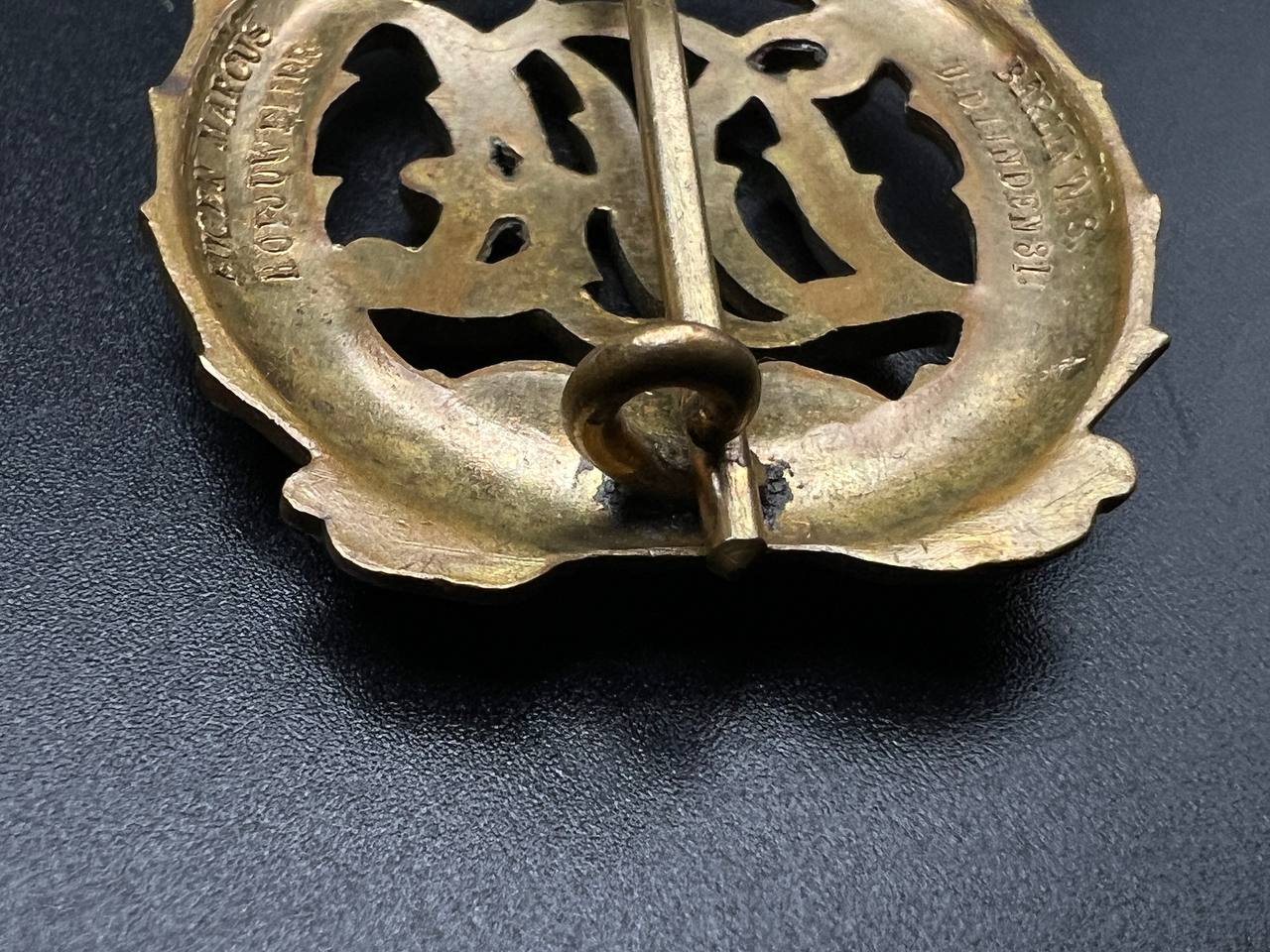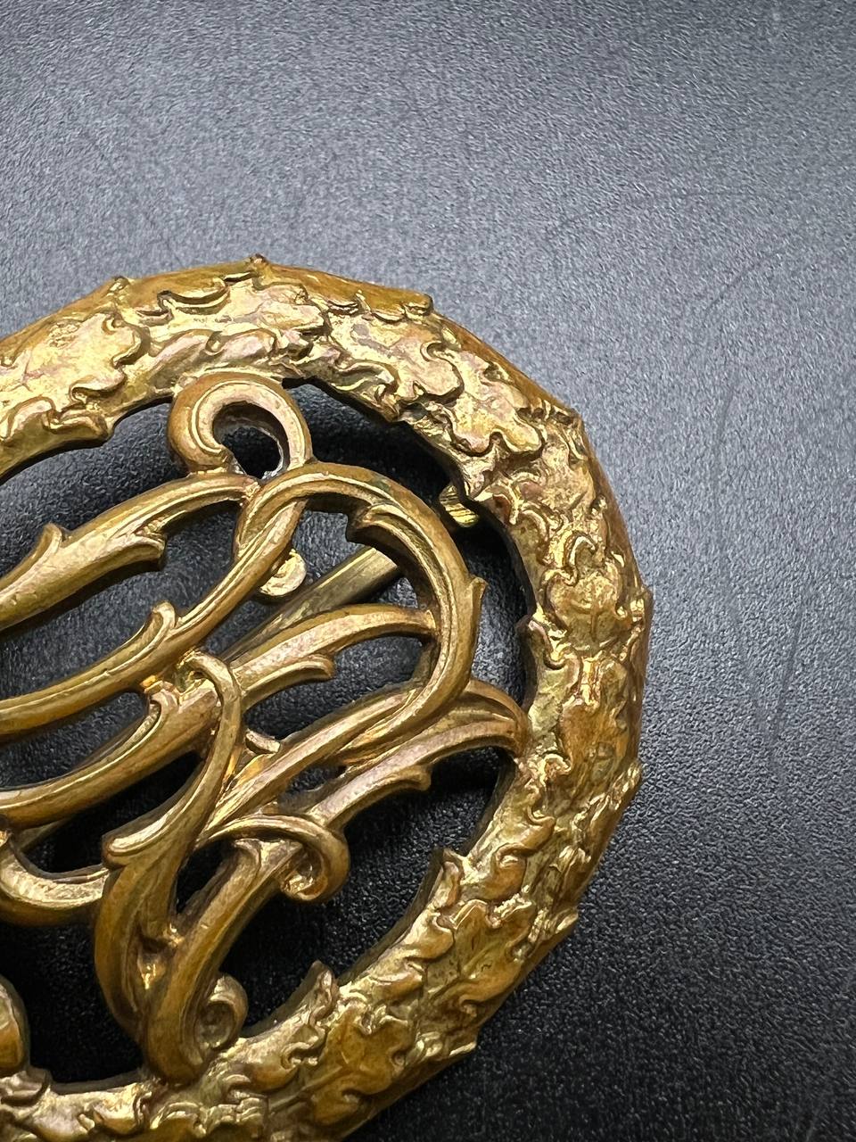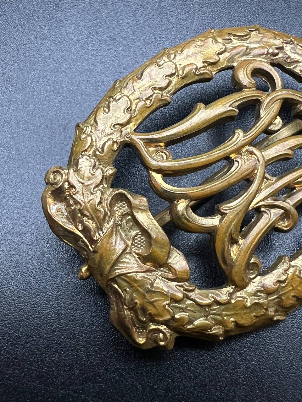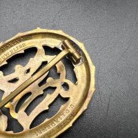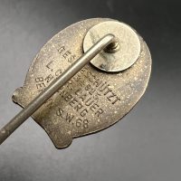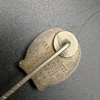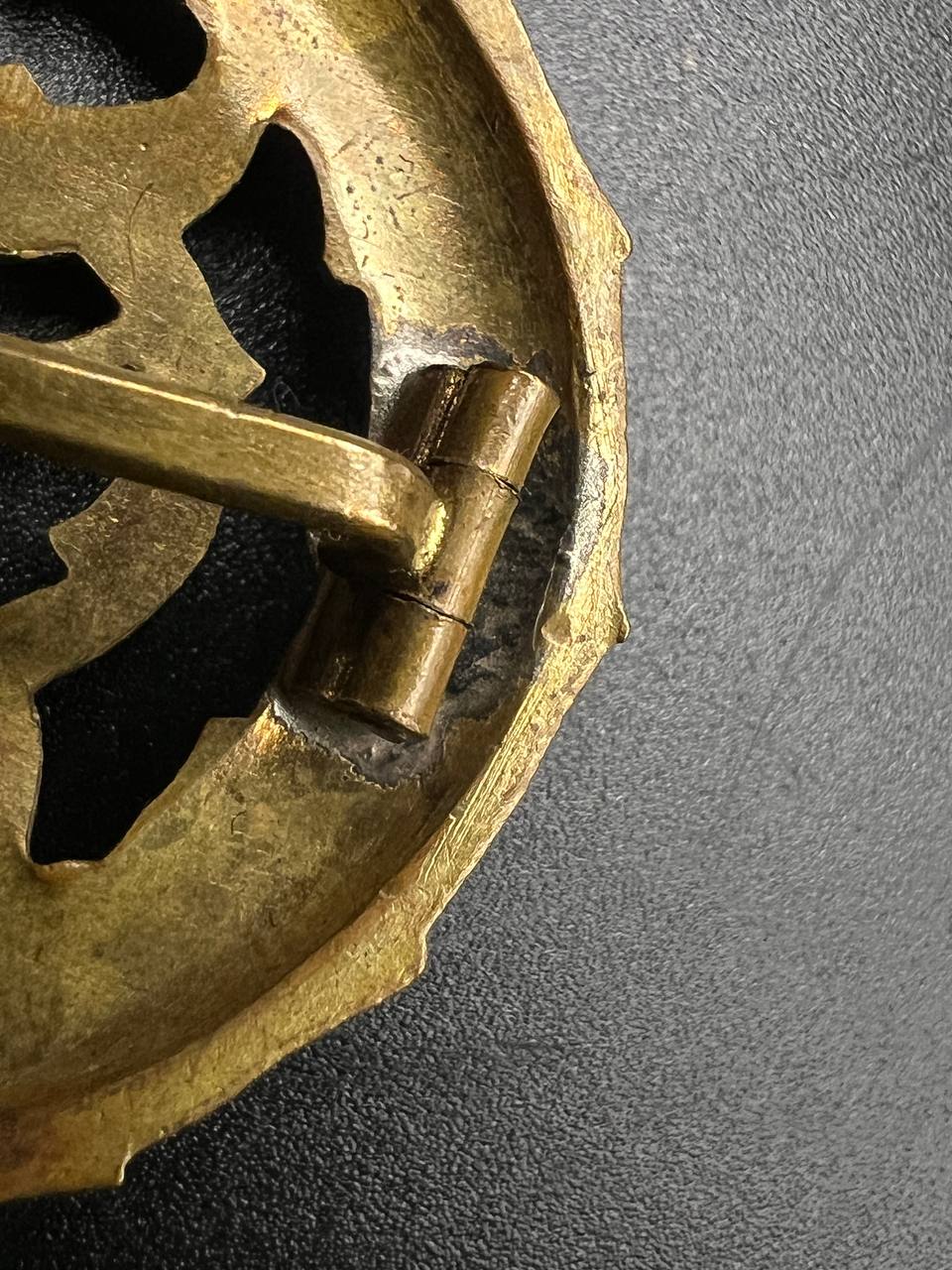 Original German DRA sports badge in gilt bronze, interwar period. Classic oval wreath with DRA monogram to the center. Reverse marked, fitted with original vertical pin. Accompanied by a miniature stickpin. Good collectible condition with even patina and no repairs.