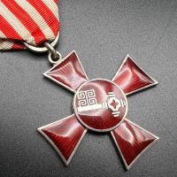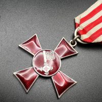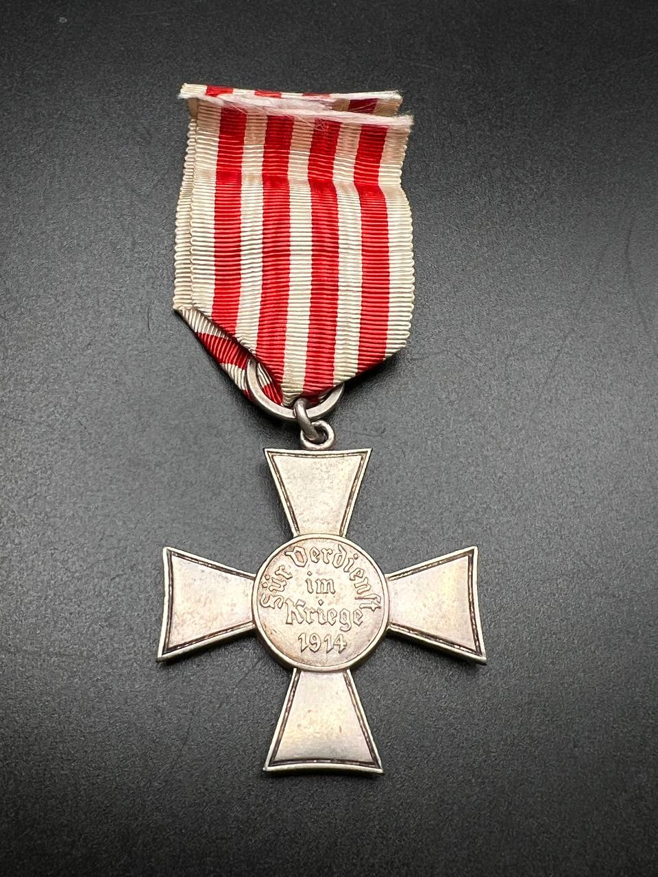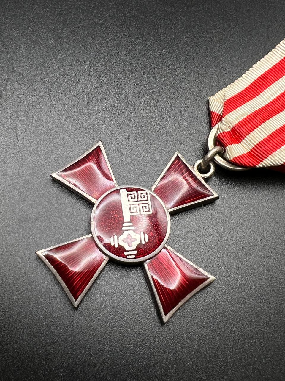 A beautiful original “Für Verdienste im Kriege 1914” (For Merit in War) cross from the Free and Hanseatic City of Hamburg. Made of silver, featuring deep red enamel with the Hamburg city coat of arms (gate and key) on the obverse. The reverse bears the inscription Für Verdienste im Kriege 1914.