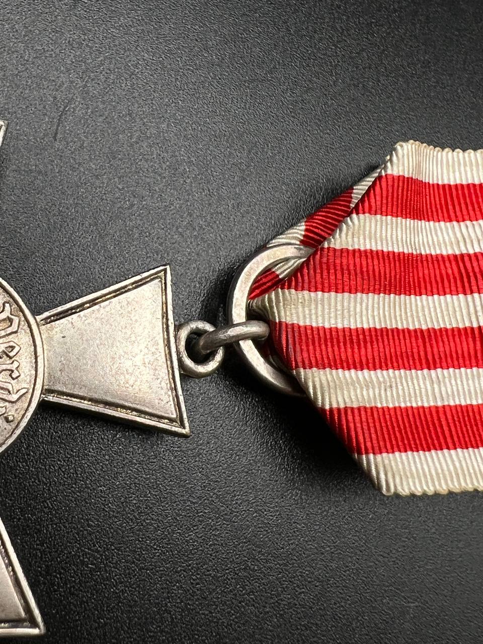 The cross comes with its original pre-WWI red-white ribbon. Condition is excellent, enamel fully intact with no chips, and the silver shows an attractive naturally aged patina.