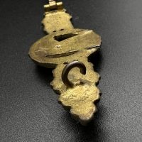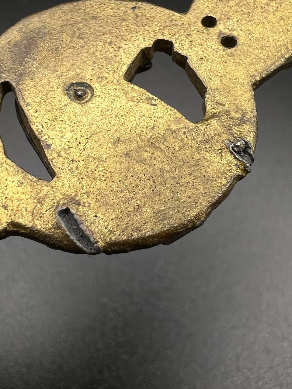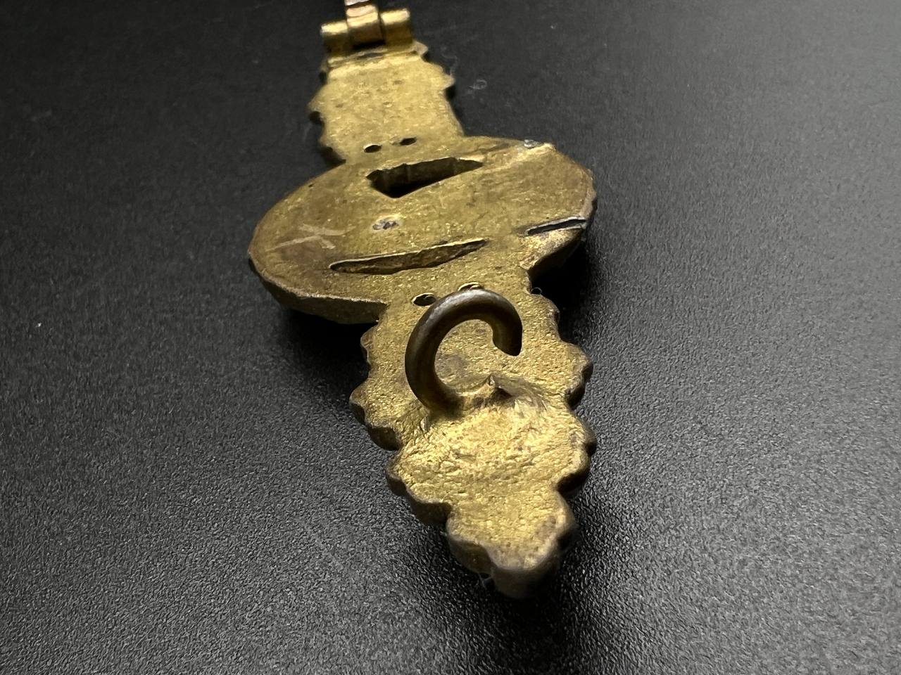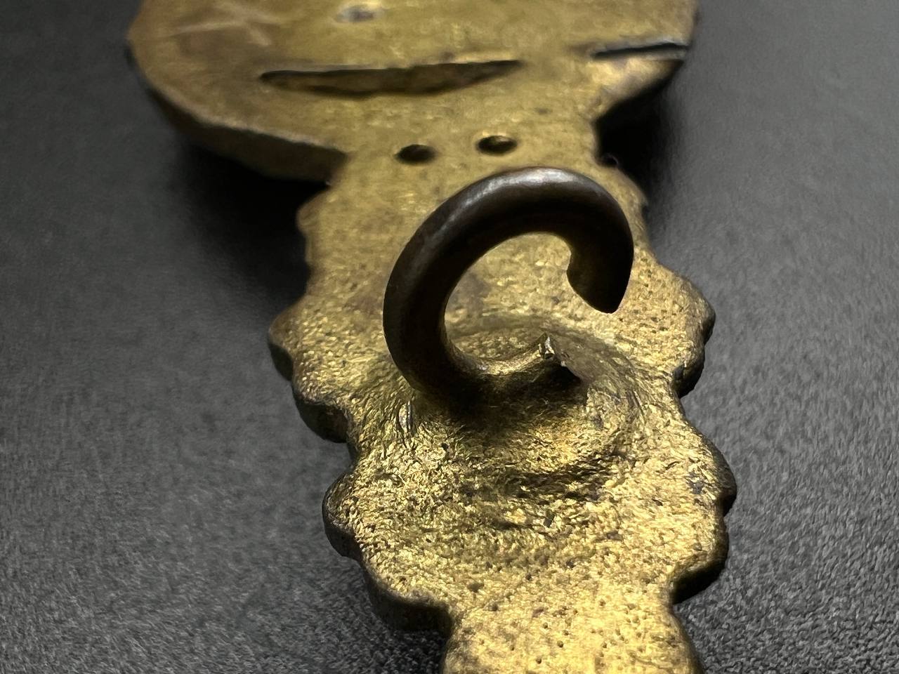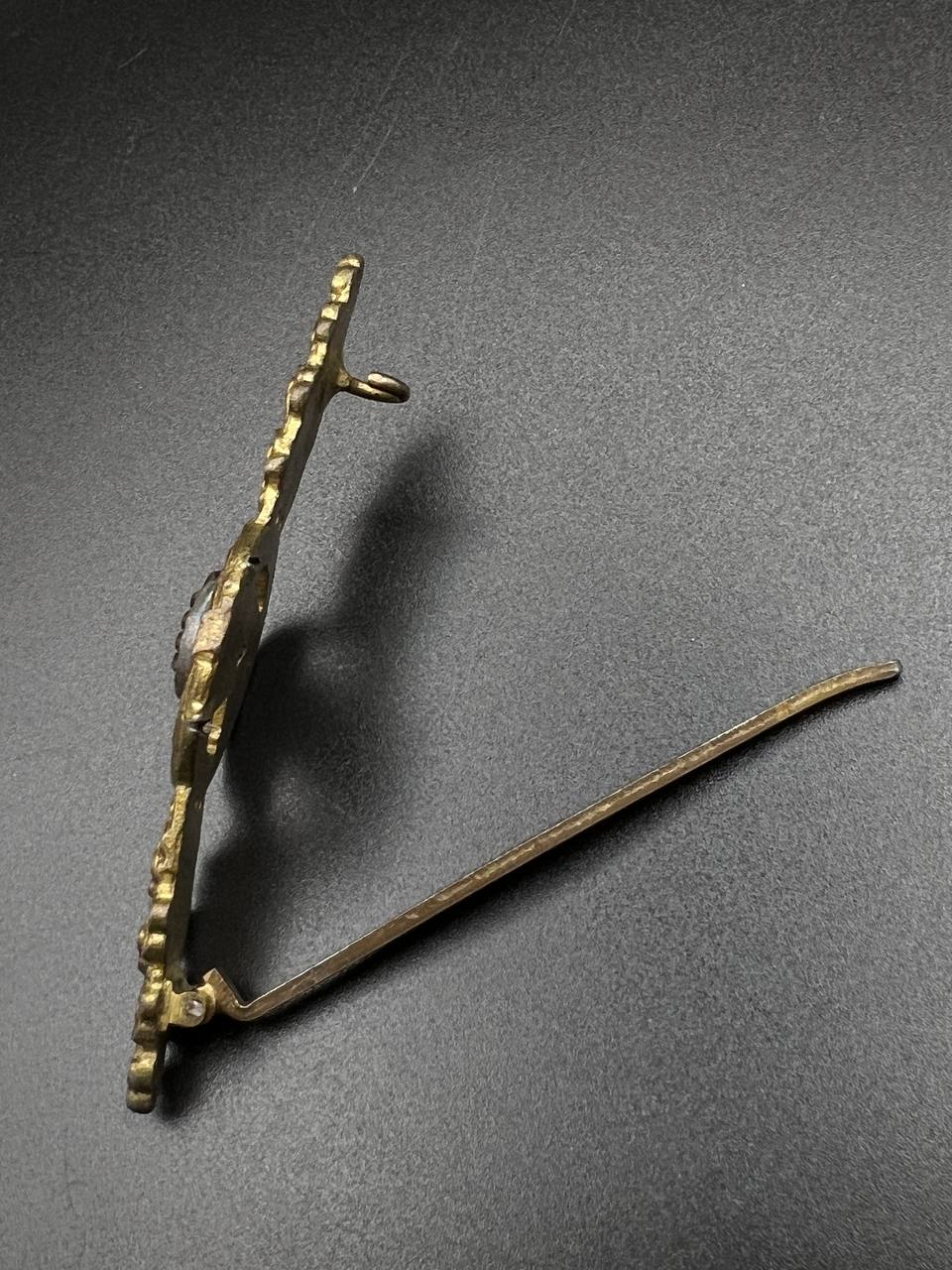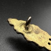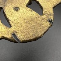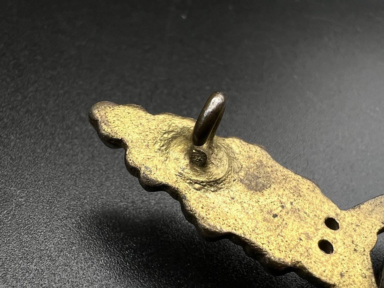 Zinc gilt, iron gilt pin, the originally attached loops for the pendant have been removed.