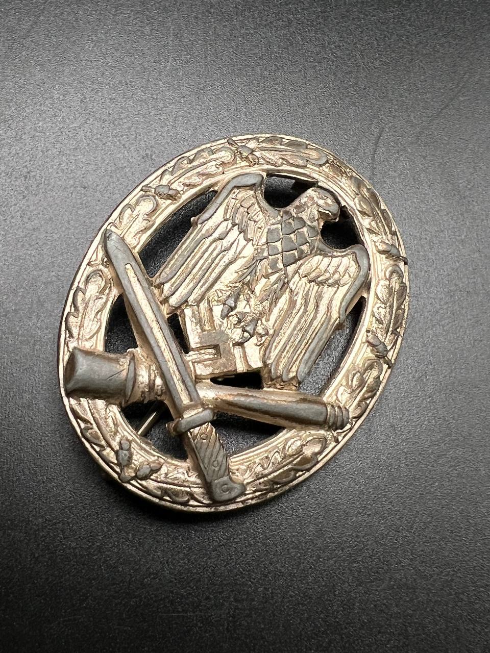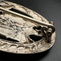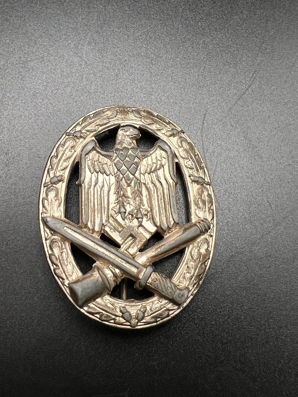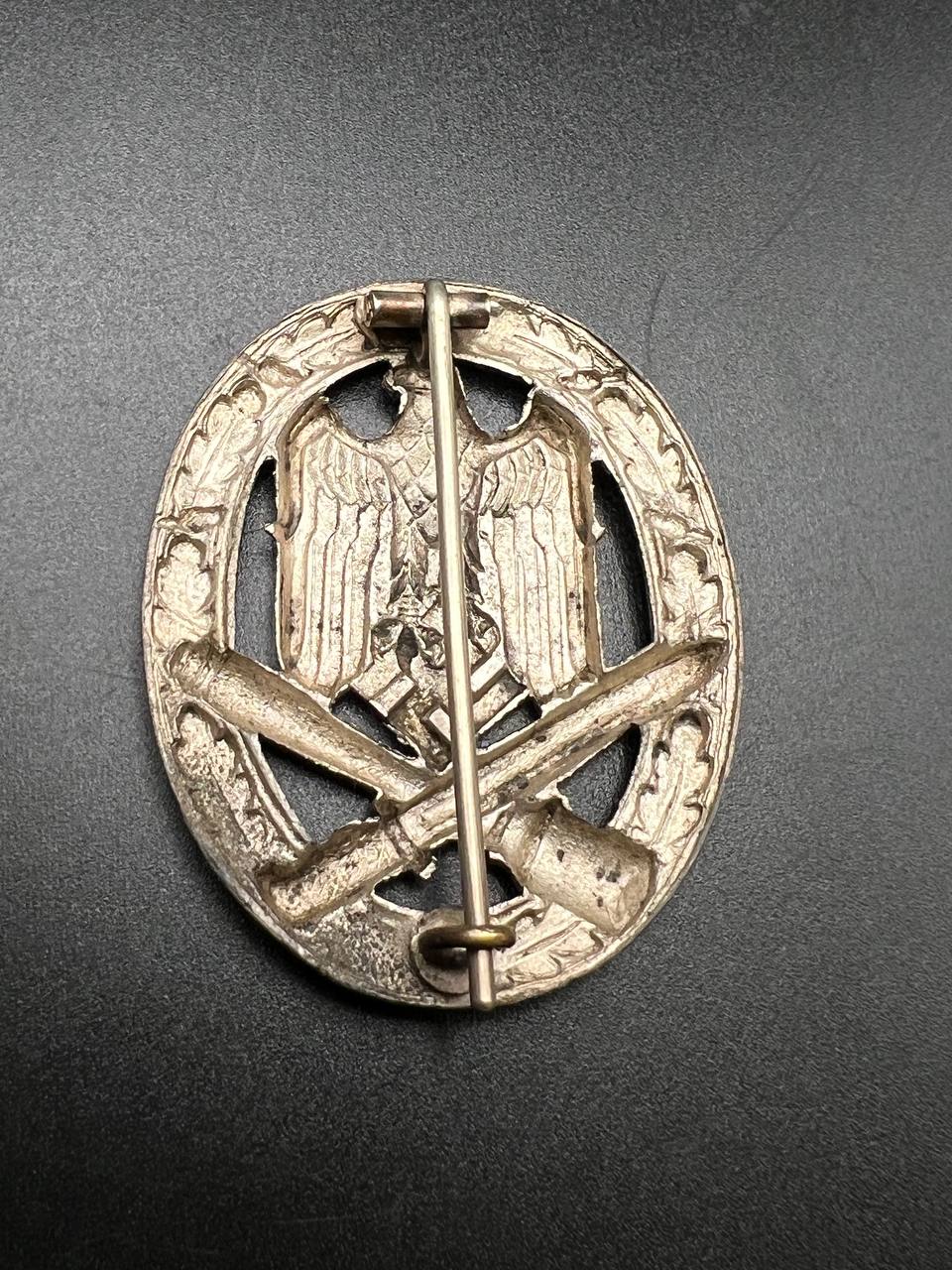 Original General Assault Badge (Allgemeines Sturmabzeichen) of the Third Reich, silver grade. Early-style example with sharply defined details: high-relief national eagle, swastika, oak-leaf wreath, and crossed bayonet and stick grenade at the center.