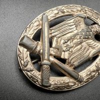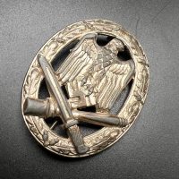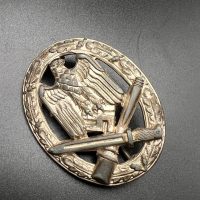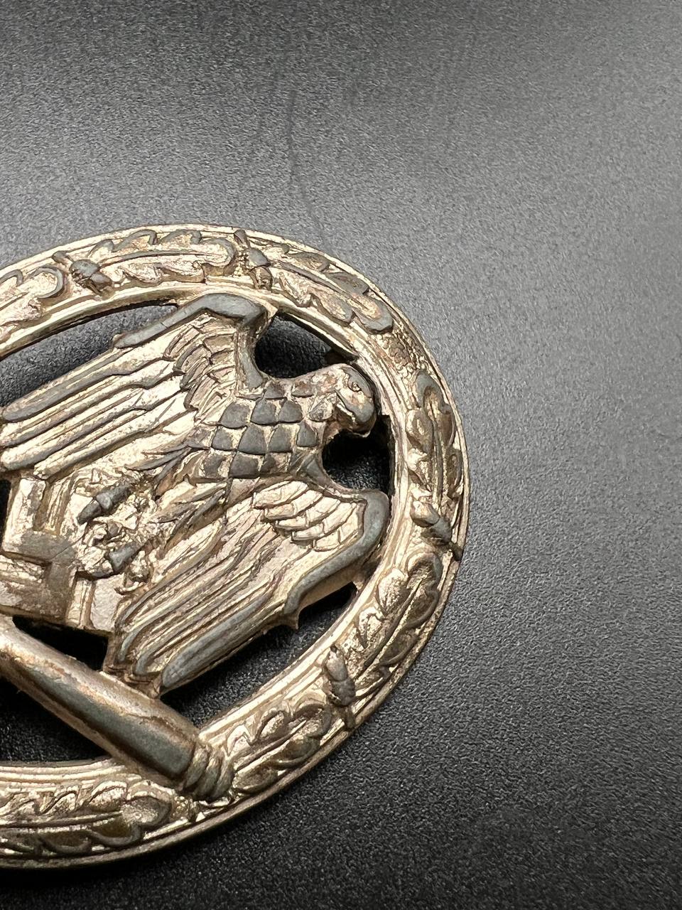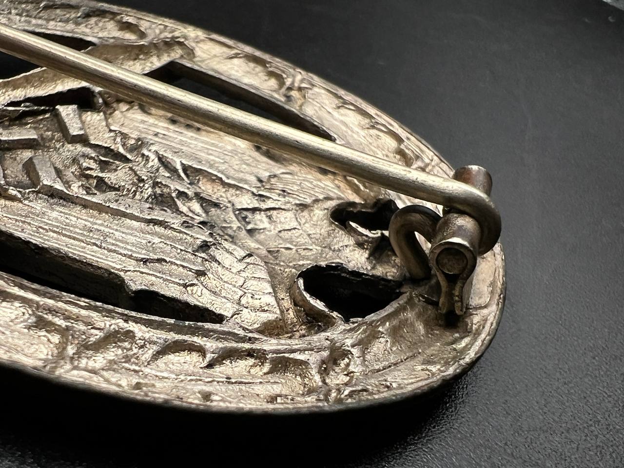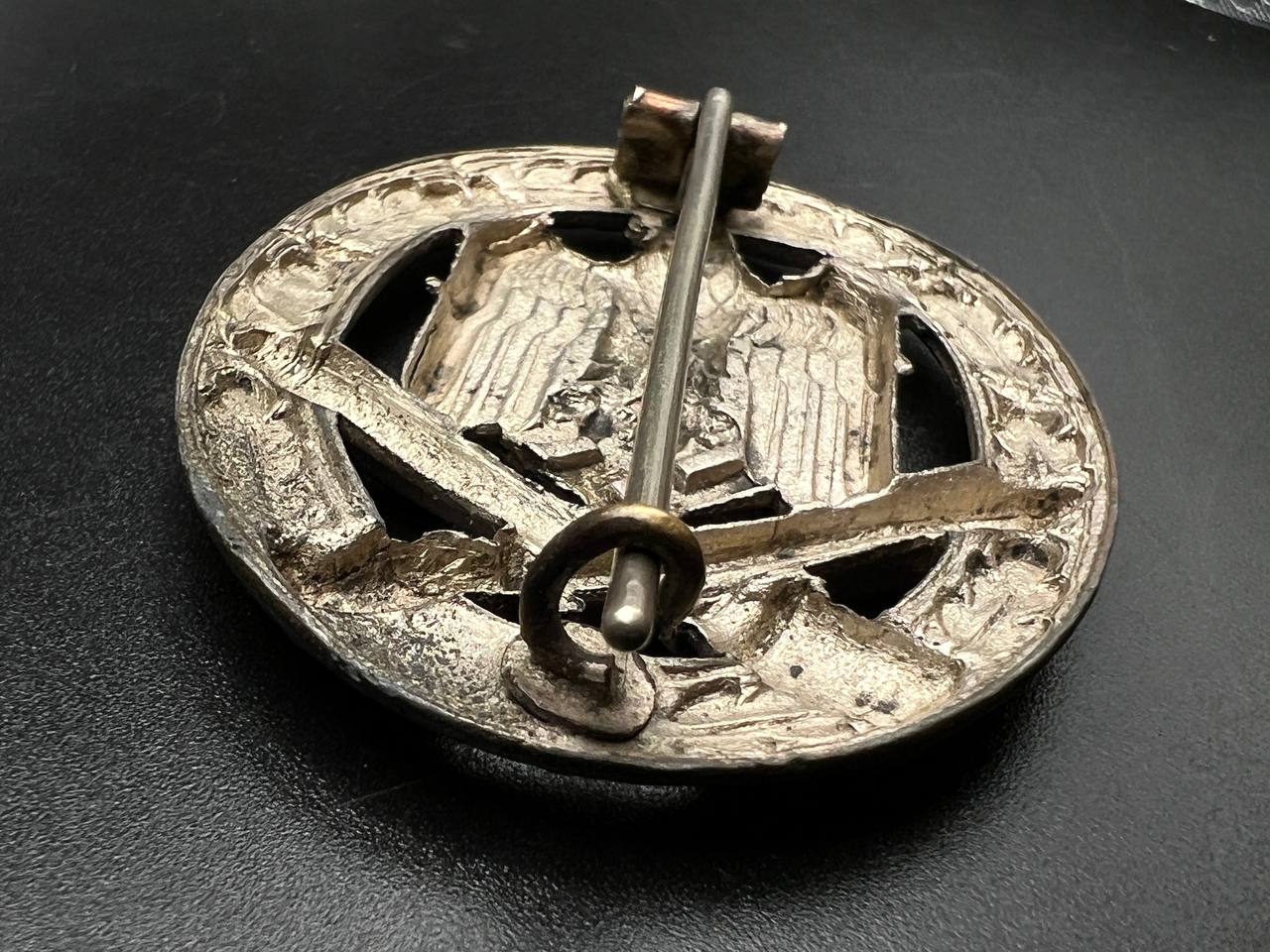 Original General Assault Badge (Allgemeines Sturmabzeichen) of the Third Reich, silver grade. Early-style example with sharply defined details: high-relief national eagle, swastika, oak-leaf wreath, and crossed bayonet and stick grenade at the center.