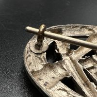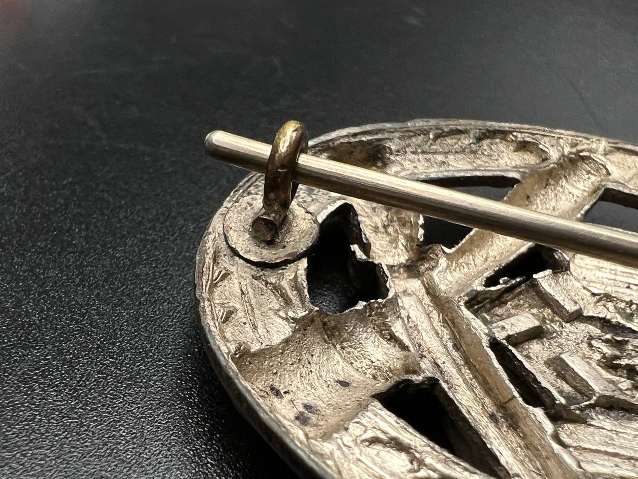Produced with remnants of the original silver finish, typical for authentic wartime pieces. The reverse features the standard hardware setup with a long vertical pin, tubular hinge, and solid catch. Condition is good, showing natural patina and honest wear without repairs or alterations.