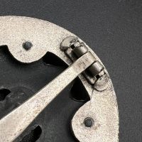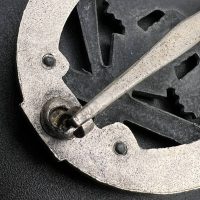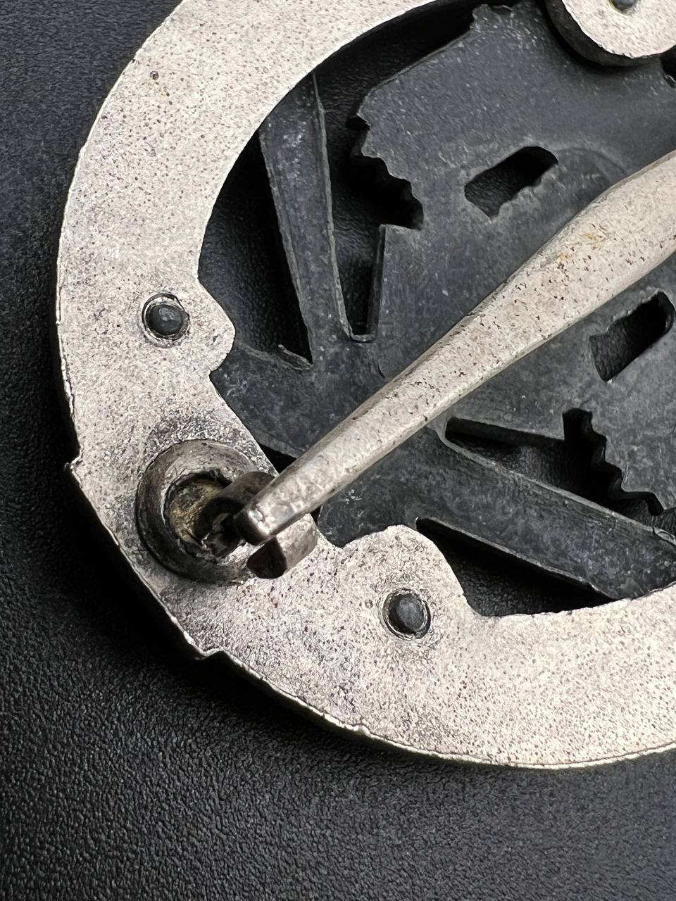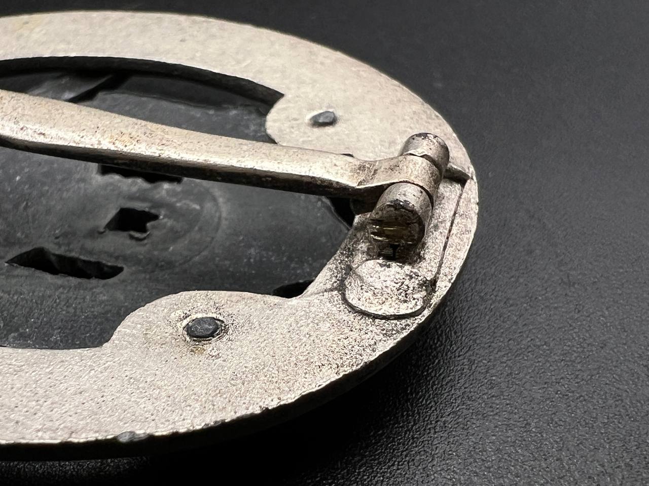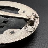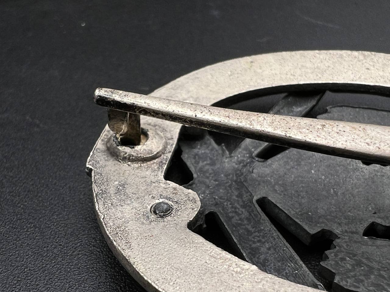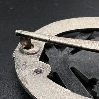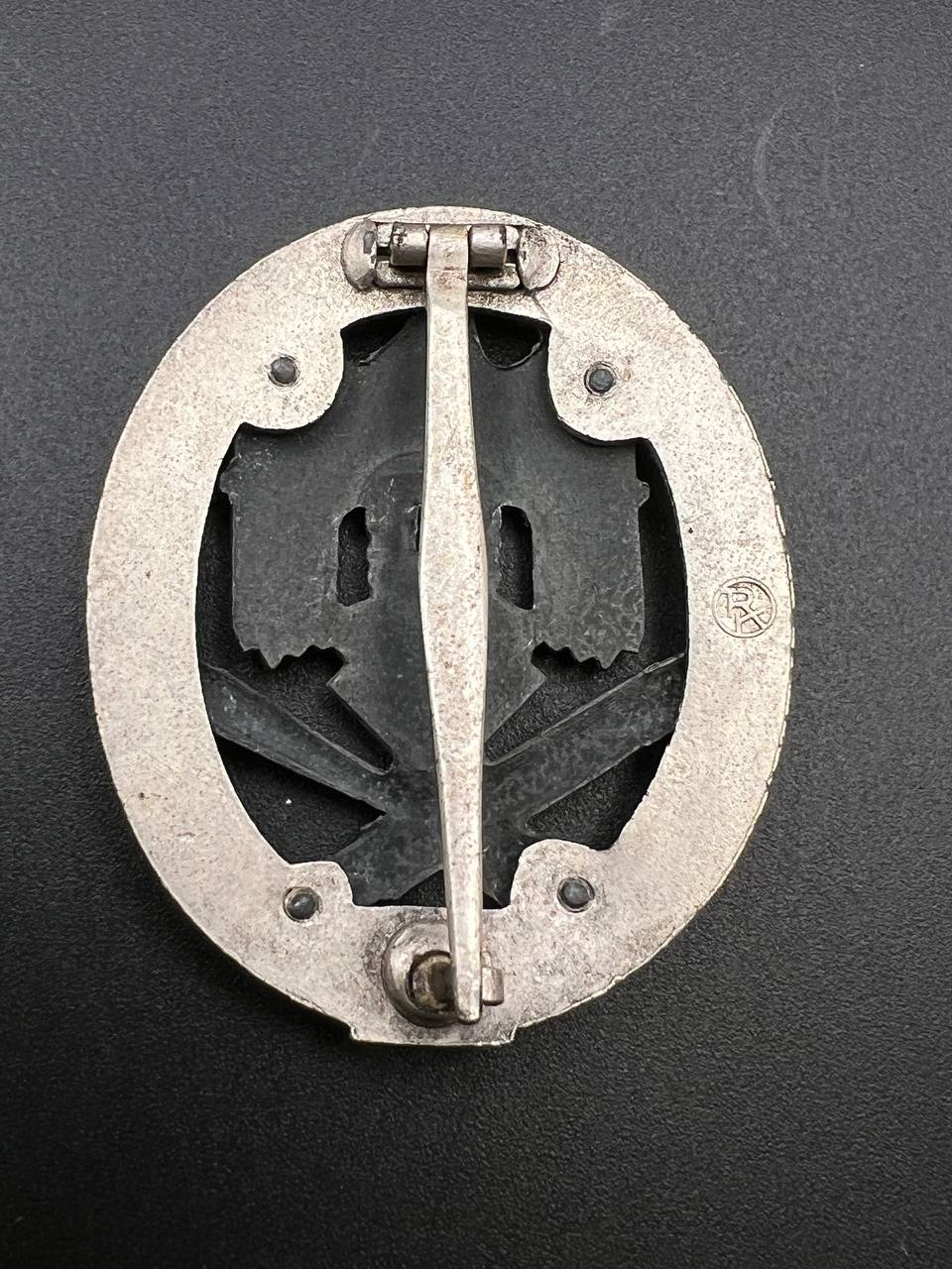 Fine zinc; the eagle finished in steel-grey tone; the wreath silver-plated. The reverse is marked with the manufacturer’s “RK” within the wreath; the pin, catch, and hinge are magnetic. Lightly worn.