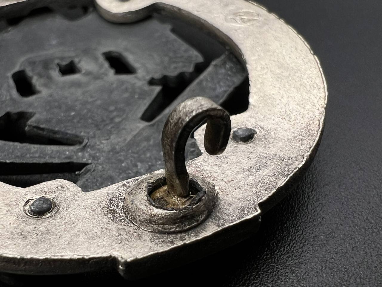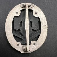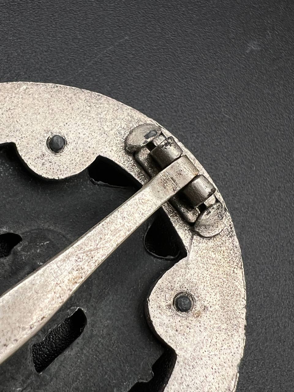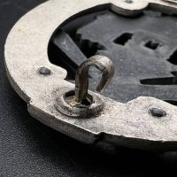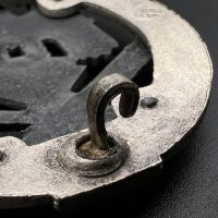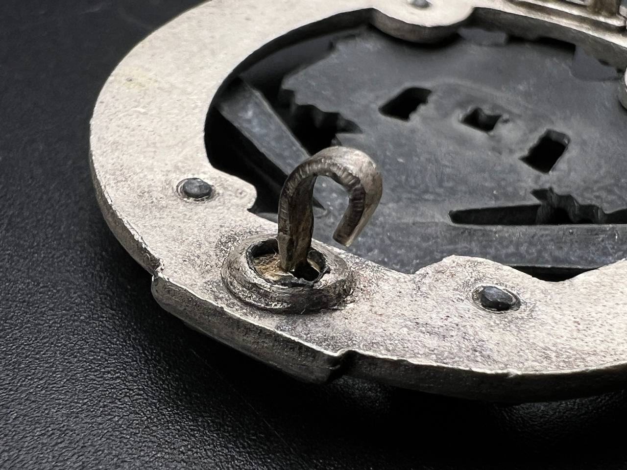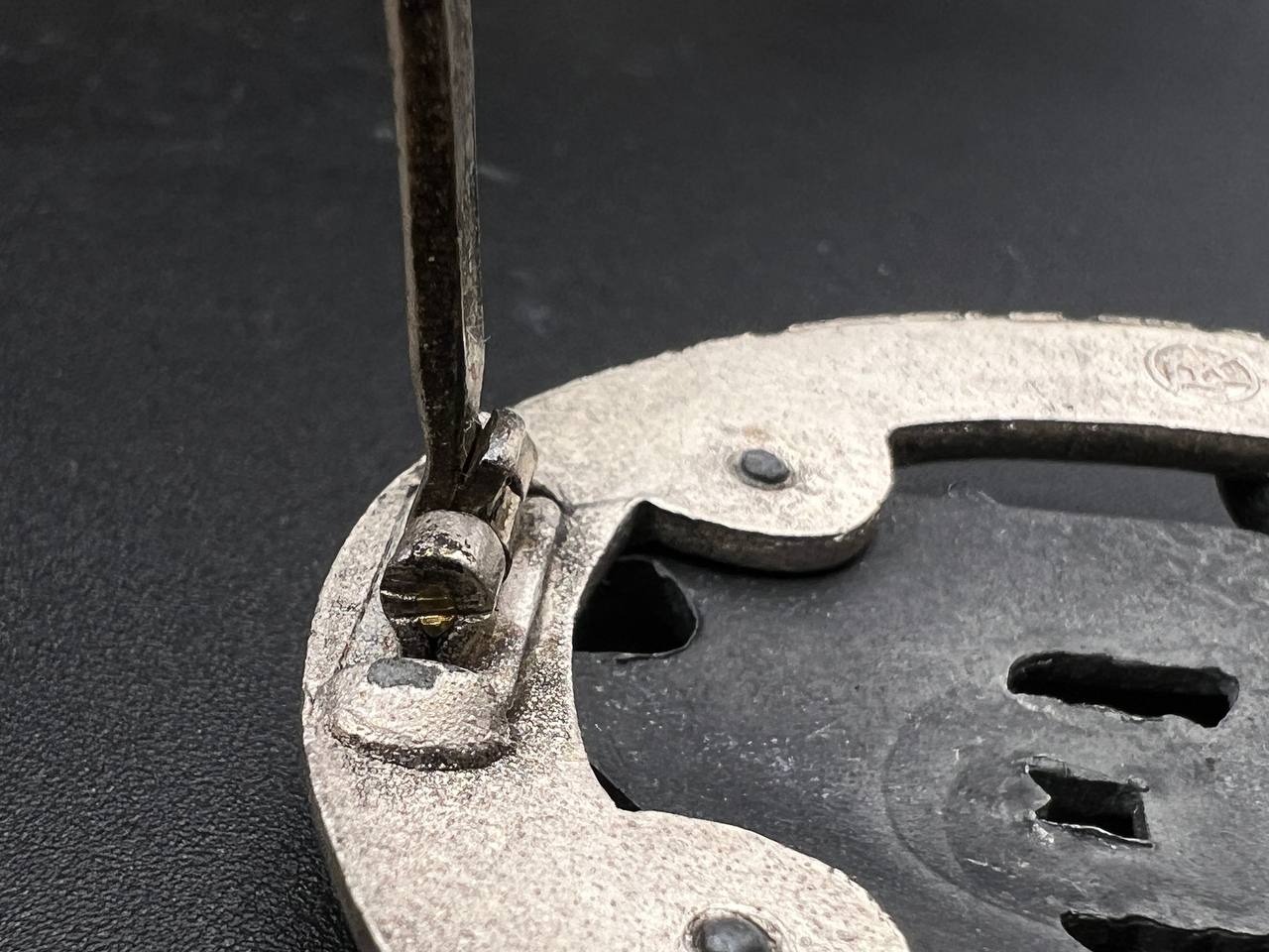 Fine zinc; the eagle finished in steel-grey tone; the wreath silver-plated. The reverse is marked with the manufacturer’s “RK” within the wreath; the pin, catch, and hinge are magnetic. Lightly worn.