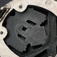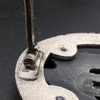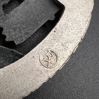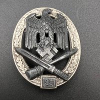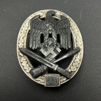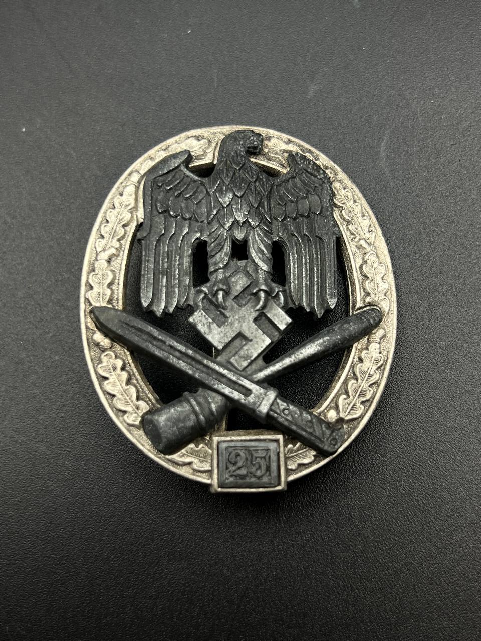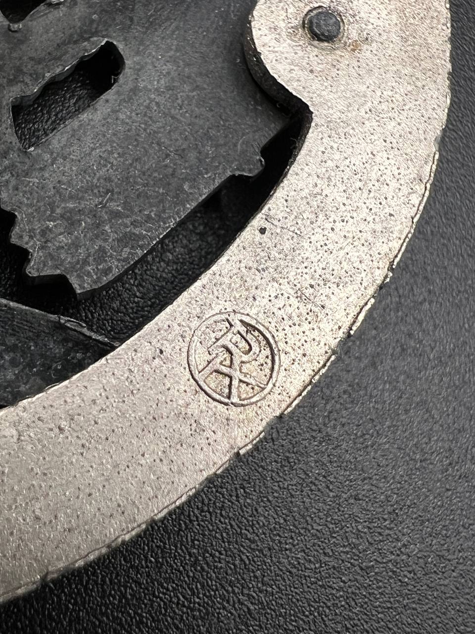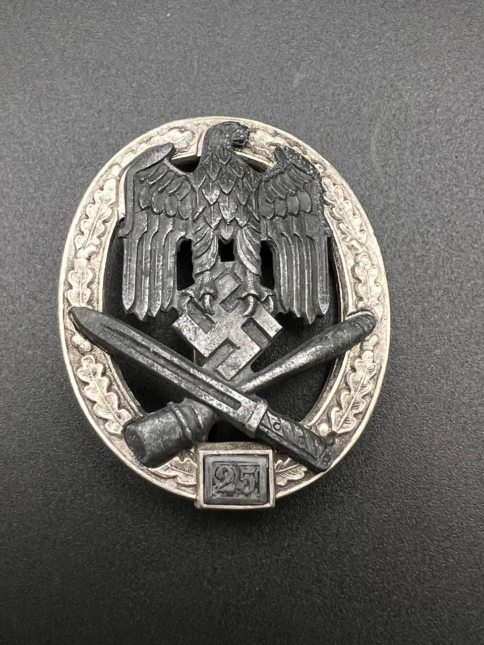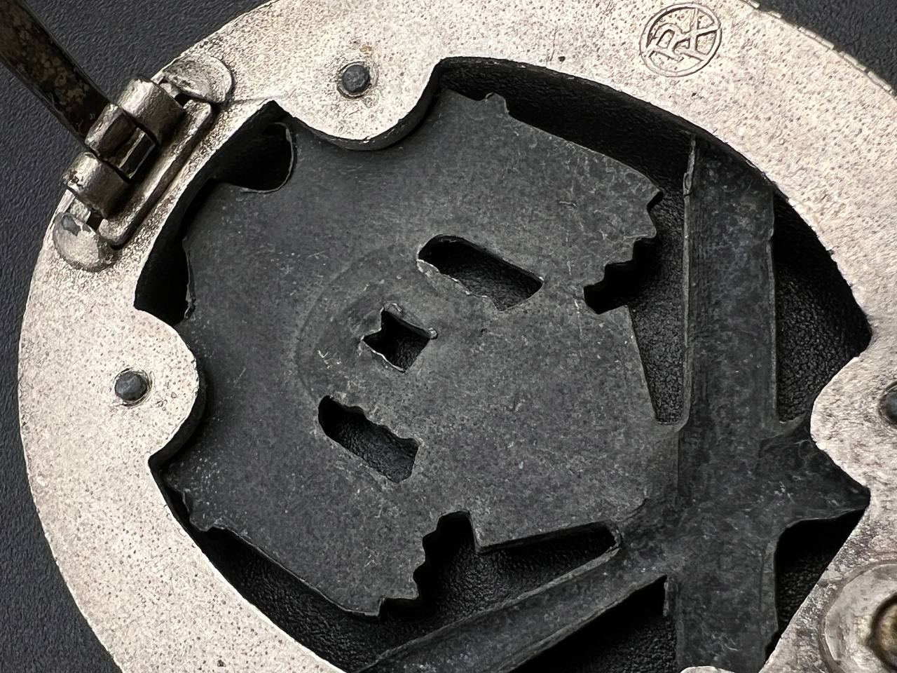 Fine zinc; the eagle finished in steel-grey tone; the wreath silver-plated. The reverse is marked with the manufacturer’s “RK” within the wreath; the pin, catch, and hinge are magnetic. Lightly worn.
