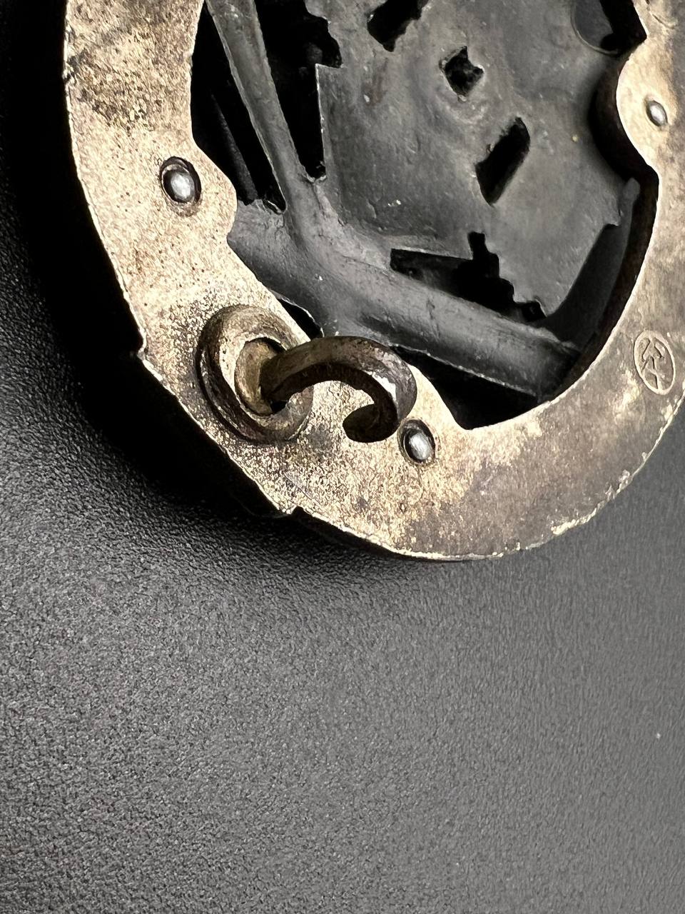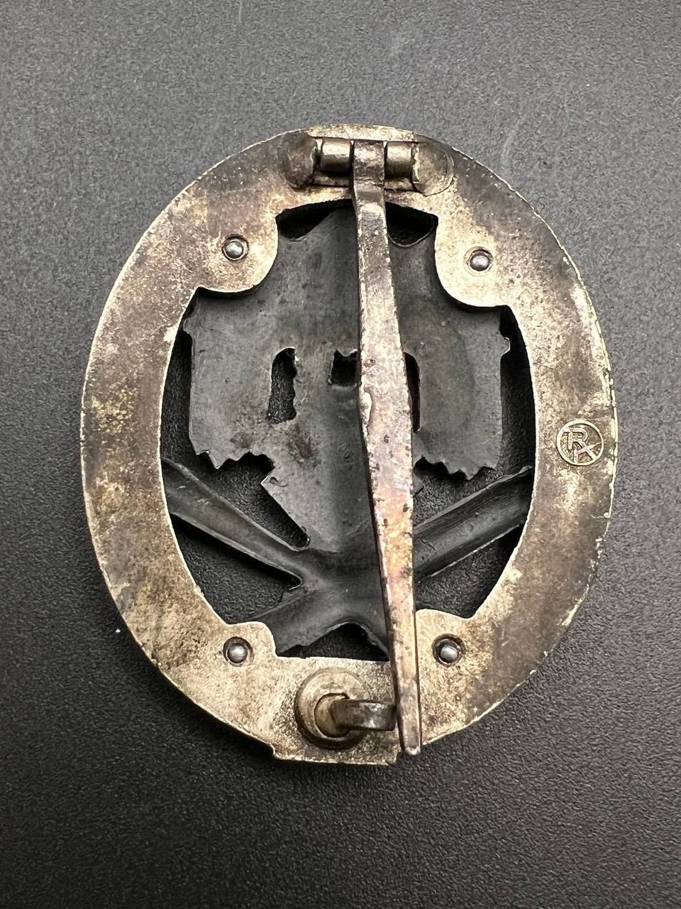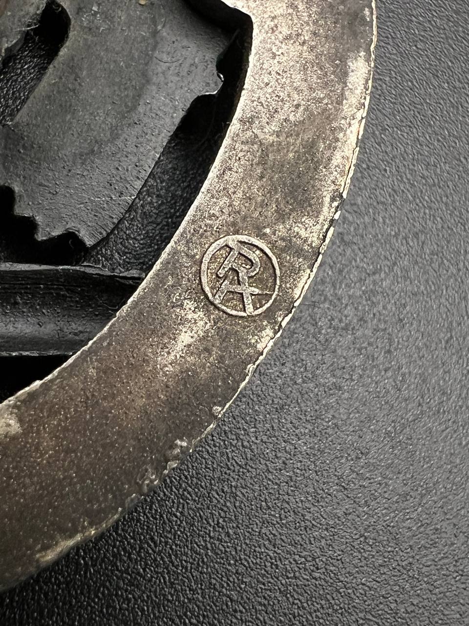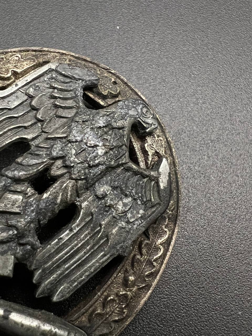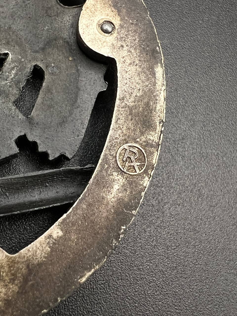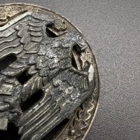 Fine zinc; the eagle finished in a steel-grey tone; the wreath silver-plated. The reverse bears the manufacturer’s mark “RK” on the wreath; the pin, catch, and hinge are magnetic. Clearly worn, with visible corrosion traces on the eagle.