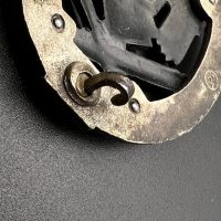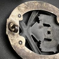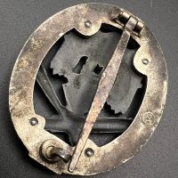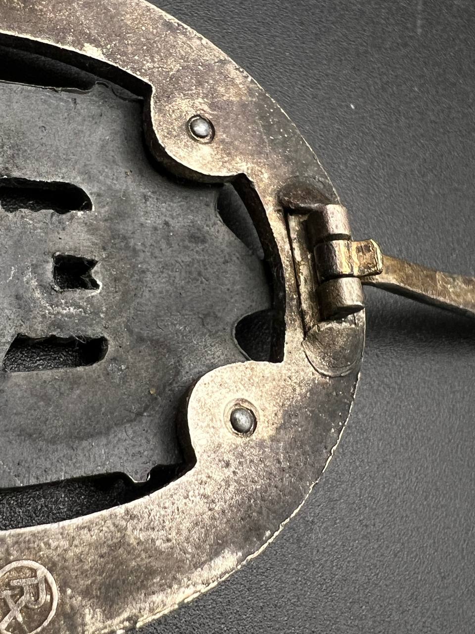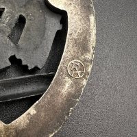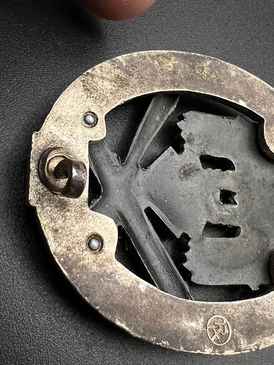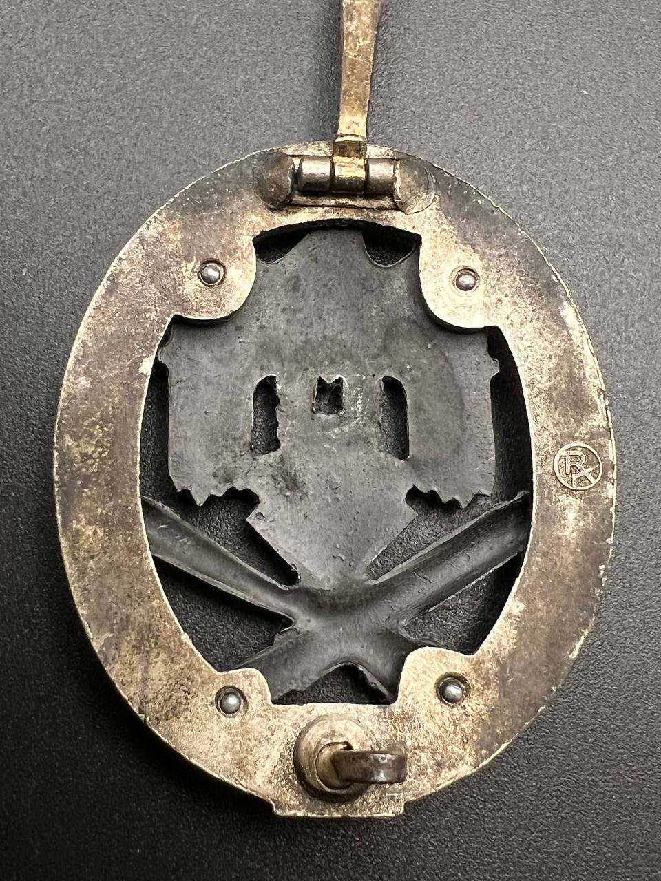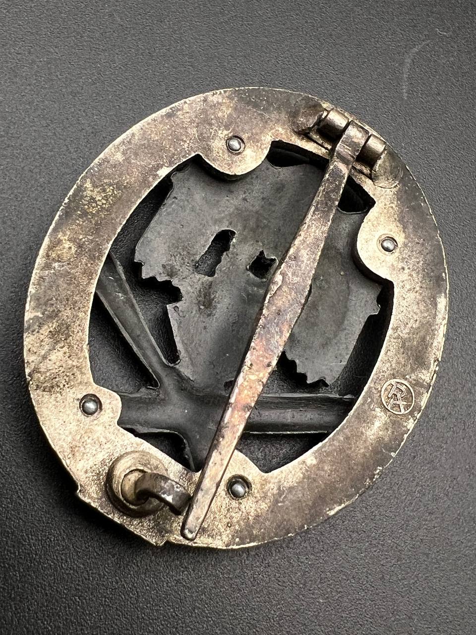 Fine zinc; the eagle finished in a steel-grey tone; the wreath silver-plated. The reverse bears the manufacturer’s mark “RK” on the wreath; the pin, catch, and hinge are magnetic. Clearly worn, with visible corrosion traces on the eagle.