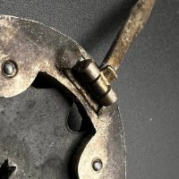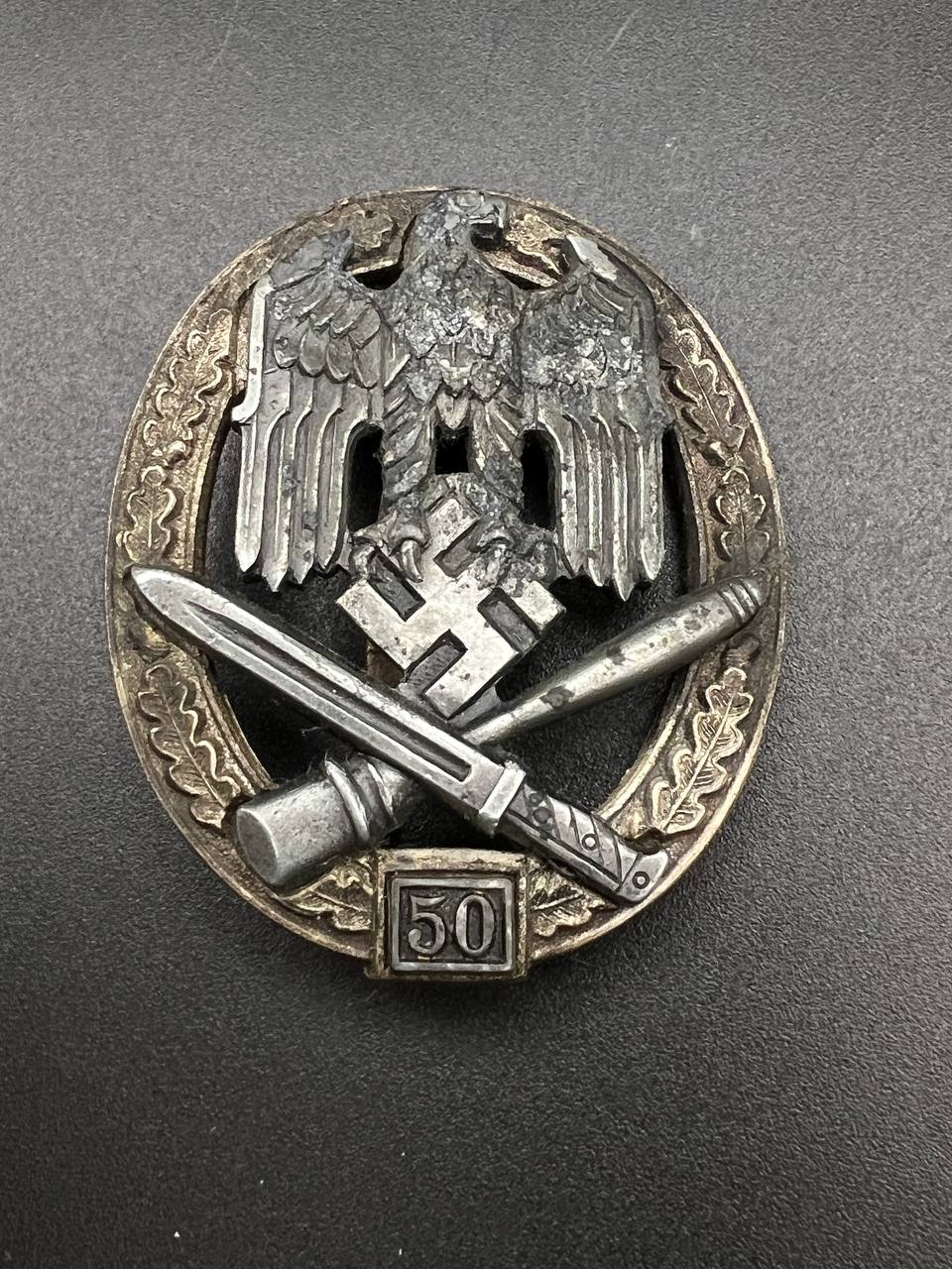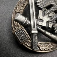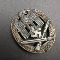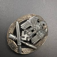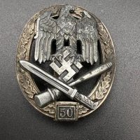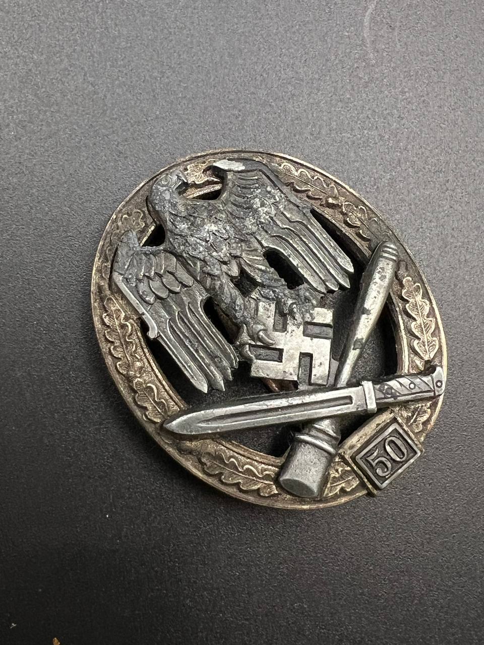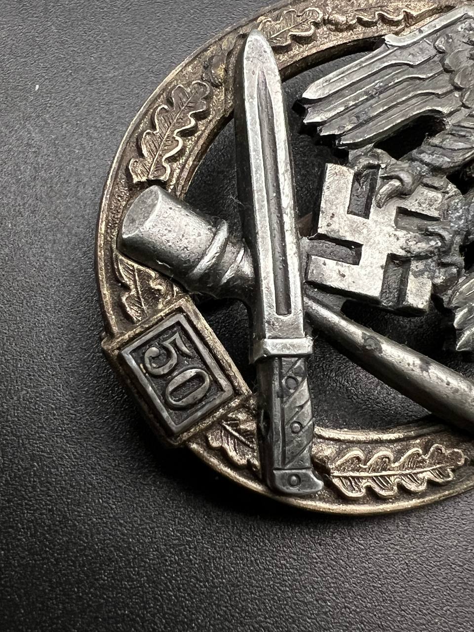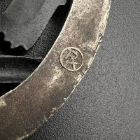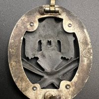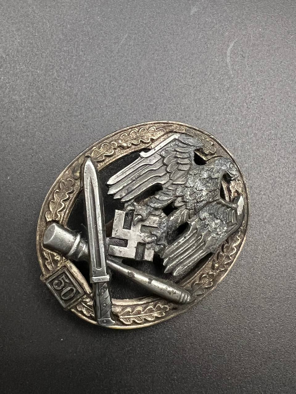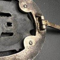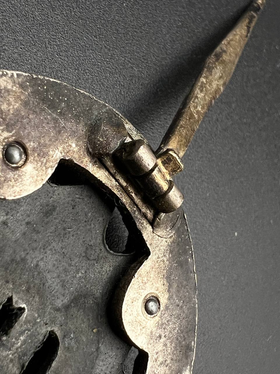 Fine zinc; the eagle finished in a steel-grey tone; the wreath silver-plated. The reverse bears the manufacturer’s mark “RK” on the wreath; the pin, catch, and hinge are magnetic. Clearly worn, with visible corrosion traces on the eagle.